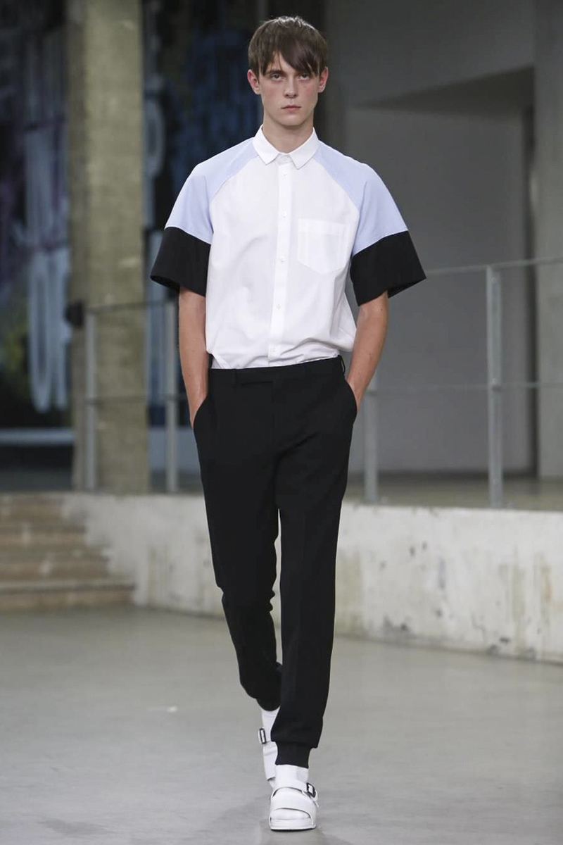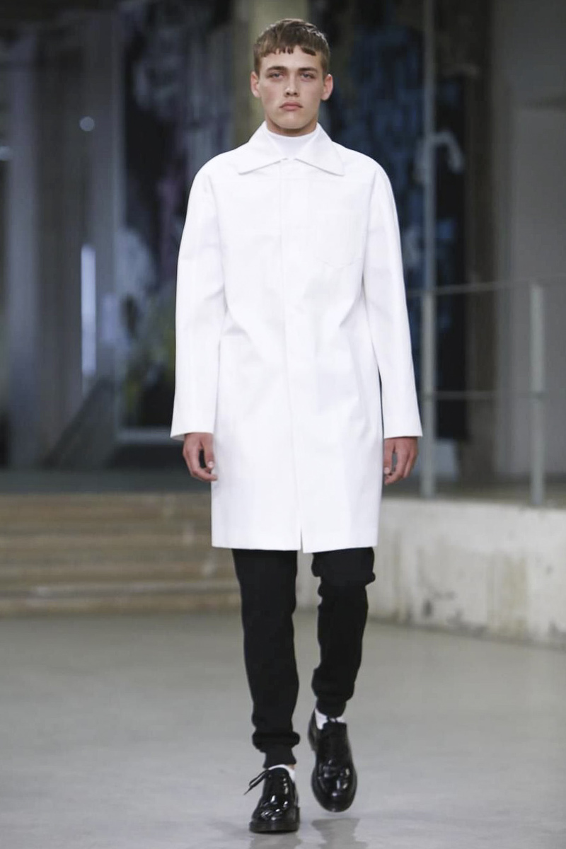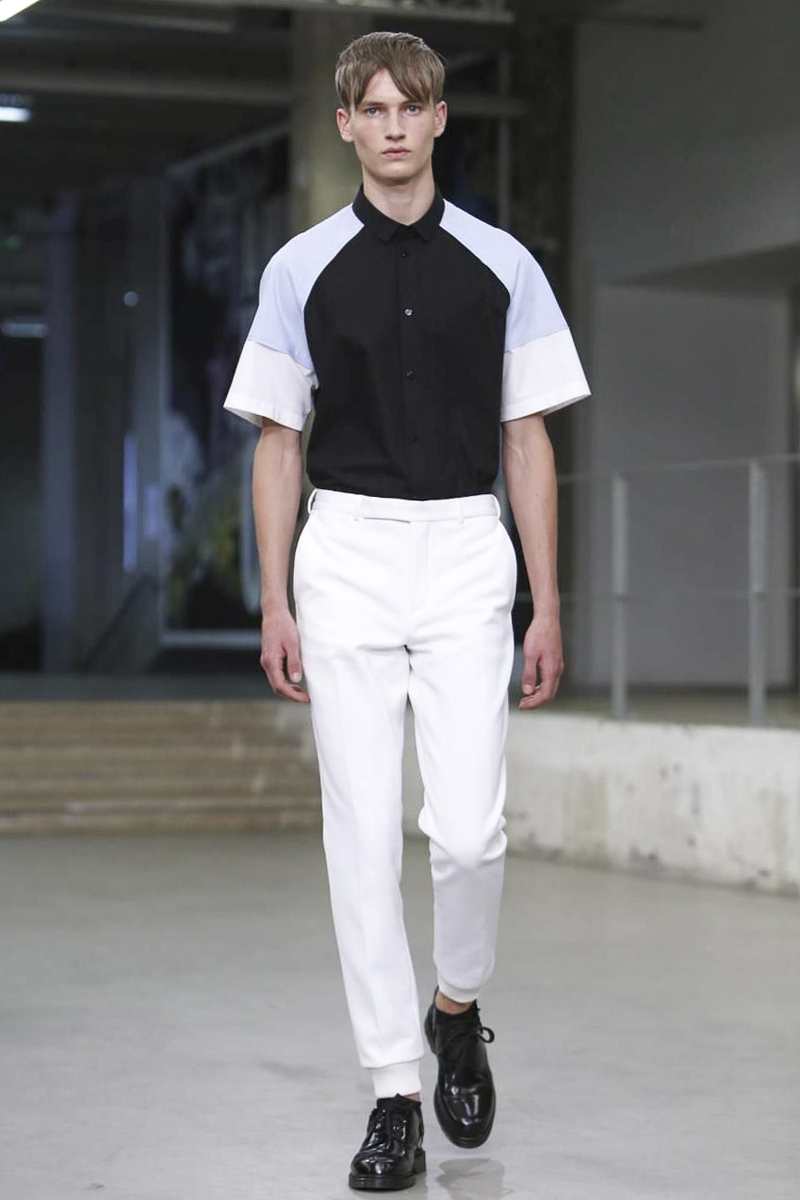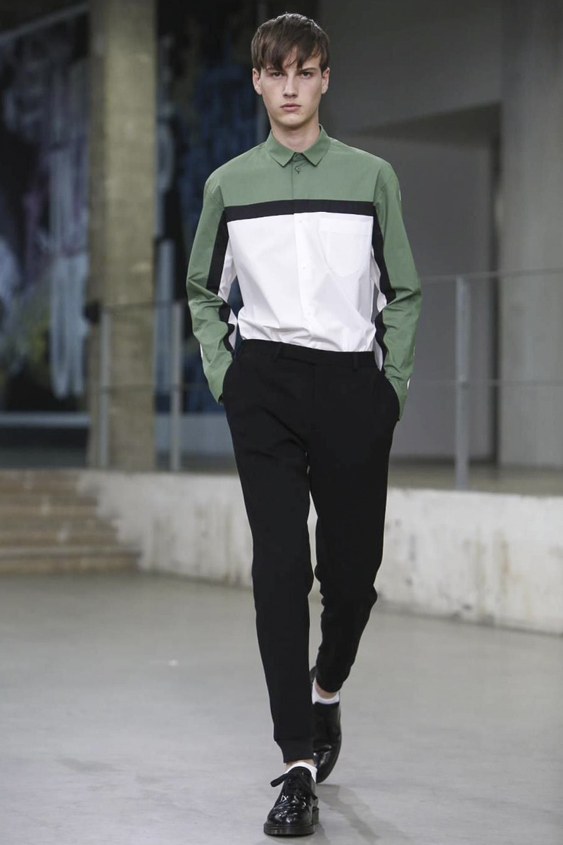 Carven at Paris Fashion Week presented his Menswear. Inspired by the working class, British designer Guillaume Henry brought a simple focus to Carven for spring/summer 2015. Simplifying his designs, Henry contributed to a season that has overall renewed a focus in wearable fashions. Crafting a simple wardrobe with clean lines and relaxed fits, sleek belted coats, jackets with narrow lapels, zipped turtlenecks and v-neck tops were among the accessible pieces offered. Using color blocking for a series of essentials that played with proportions, Henry produced shirting in black and white, constructed with boxy sleeves and a lean fit.