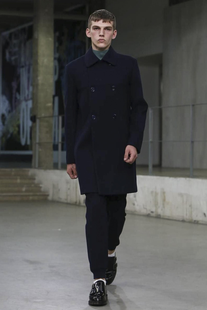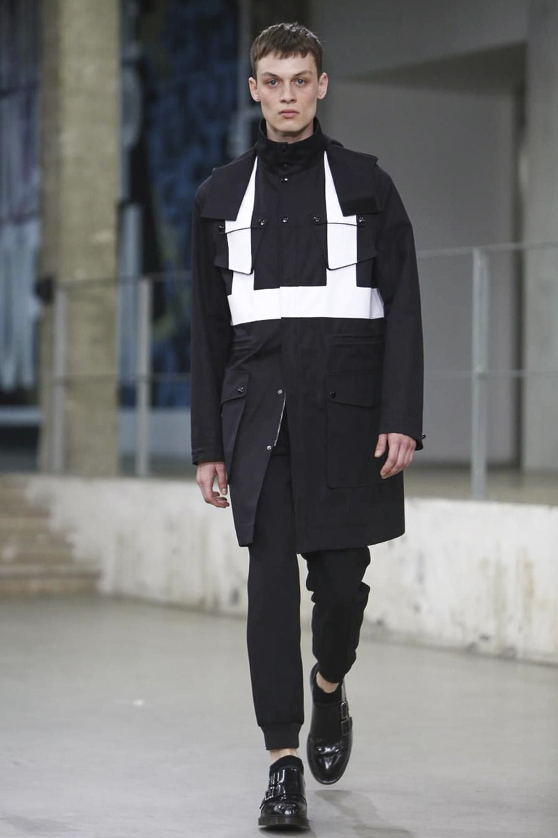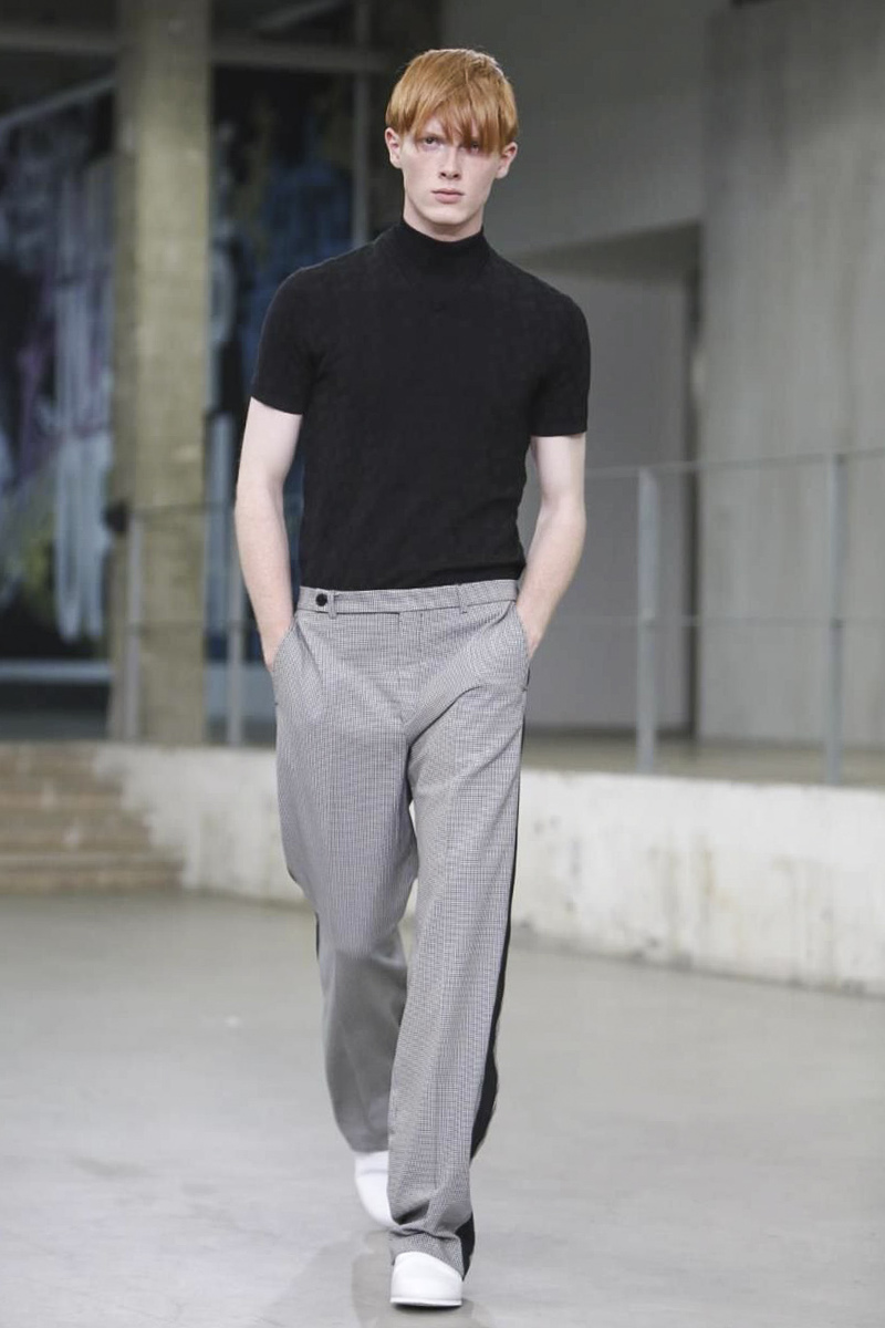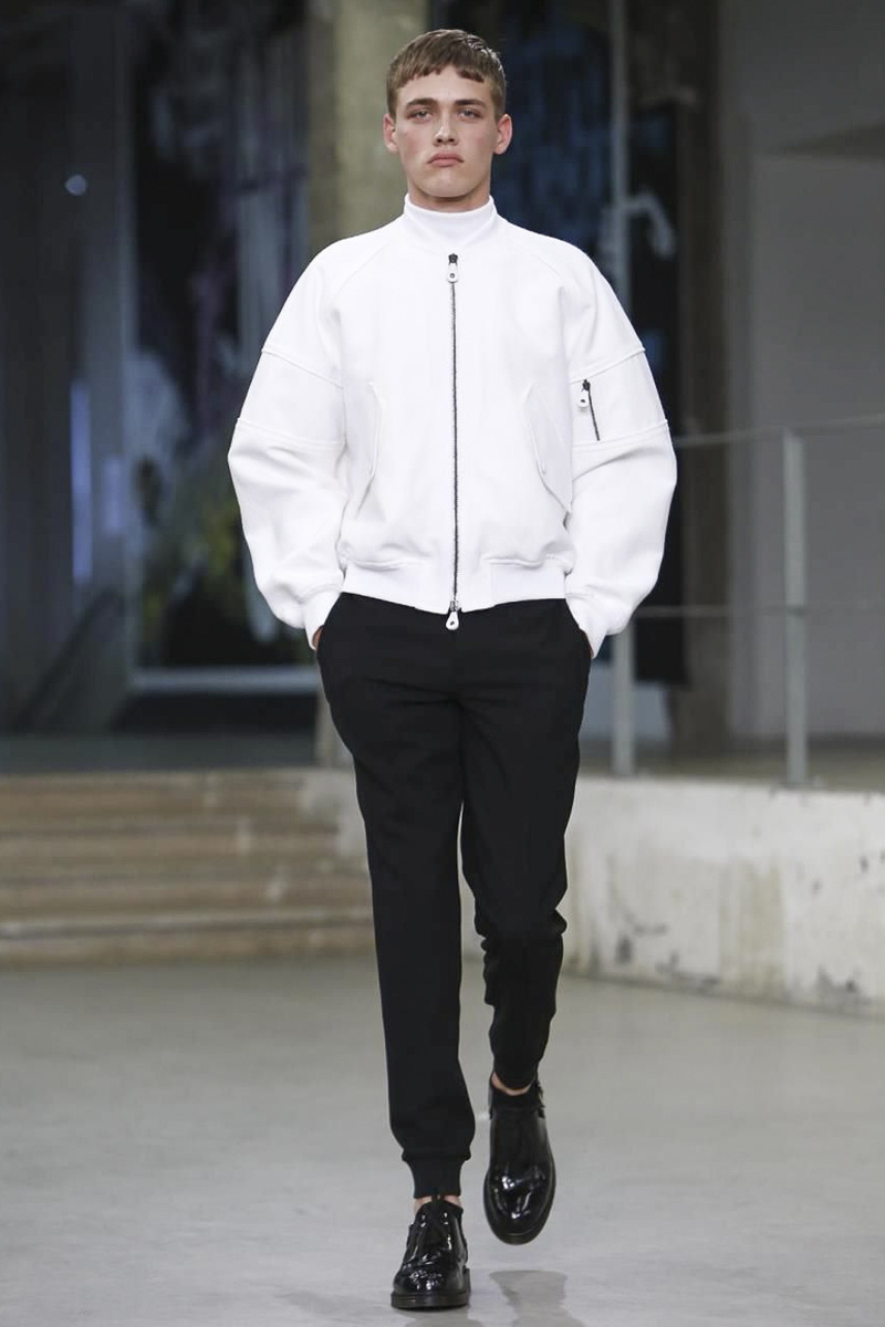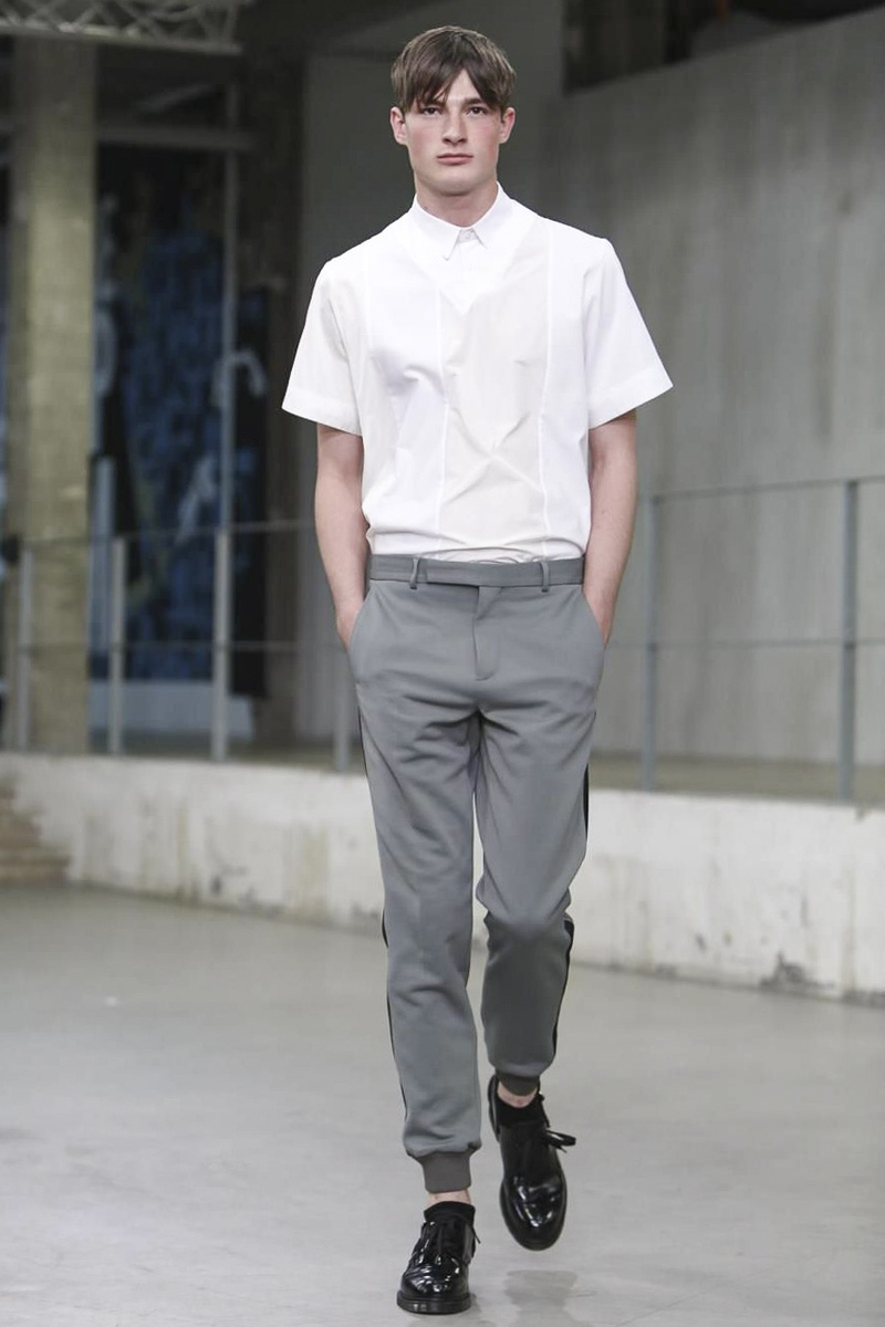 Carven at Paris Fashion Week presented his Menswear. Inspired by the working class, British designer Guillaume Henry brought a simple focus to Carven for spring/summer 2015. Simplifying his designs, Henry contributed to a season that has overall renewed a focus in wearable fashions. Crafting a simple wardrobe with clean lines and relaxed fits, sleek belted coats, jackets with narrow lapels, zipped turtlenecks and v-neck tops were among the accessible pieces offered. Using color blocking for a series of essentials that played with proportions, Henry produced shirting in black and white, constructed with boxy sleeves and a lean fit.