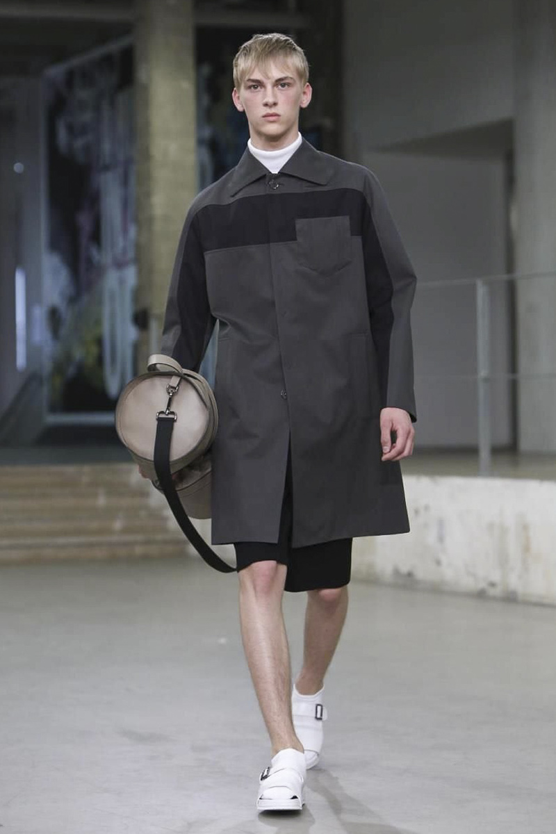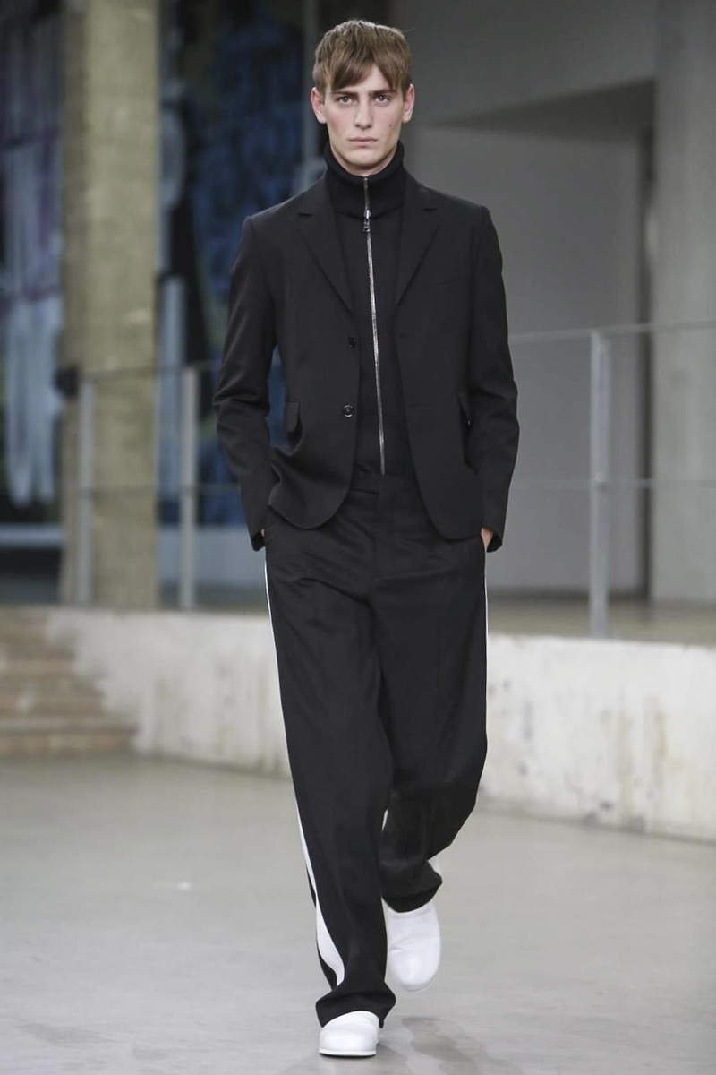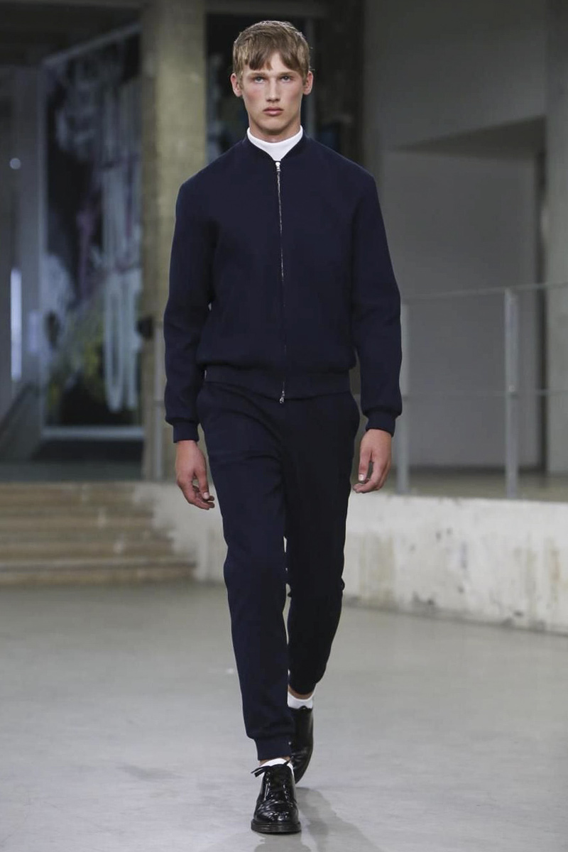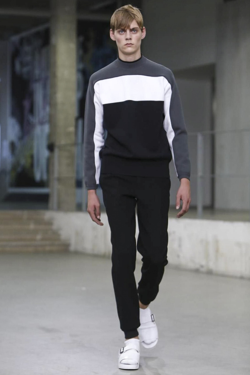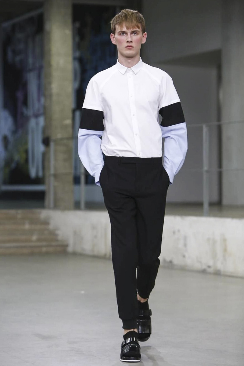 Carven at Paris Fashion Week presented his Menswear. Inspired by the working class, British designer Guillaume Henry brought a simple focus to Carven for spring/summer 2015. Simplifying his designs, Henry contributed to a season that has overall renewed a focus in wearable fashions. Crafting a simple wardrobe with clean lines and relaxed fits, sleek belted coats, jackets with narrow lapels, zipped turtlenecks and v-neck tops were among the accessible pieces offered. Using color blocking for a series of essentials that played with proportions, Henry produced shirting in black and white, constructed with boxy sleeves and a lean fit.