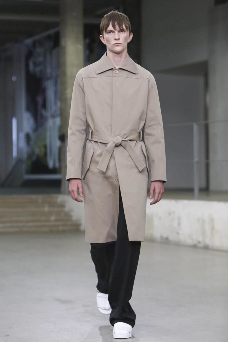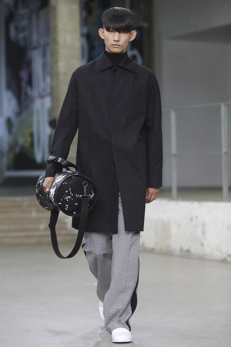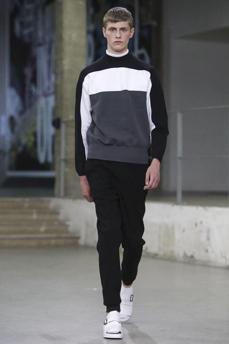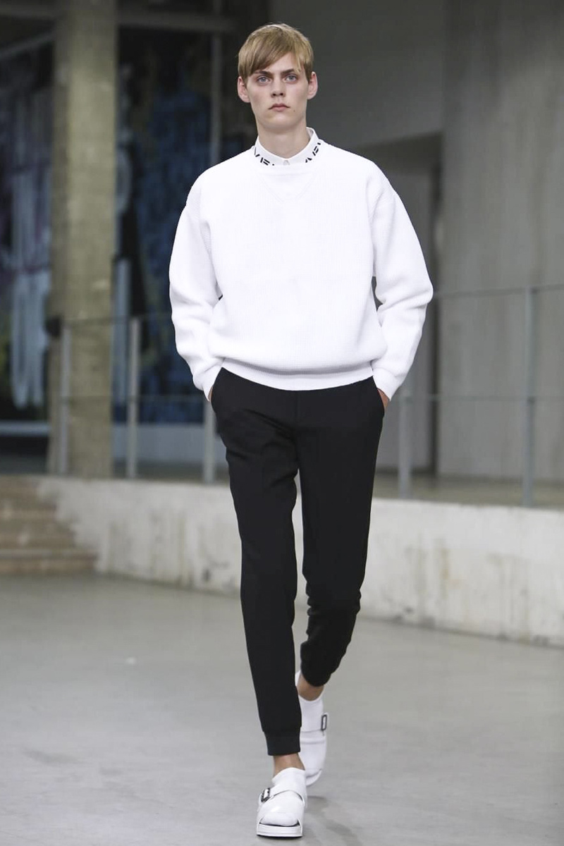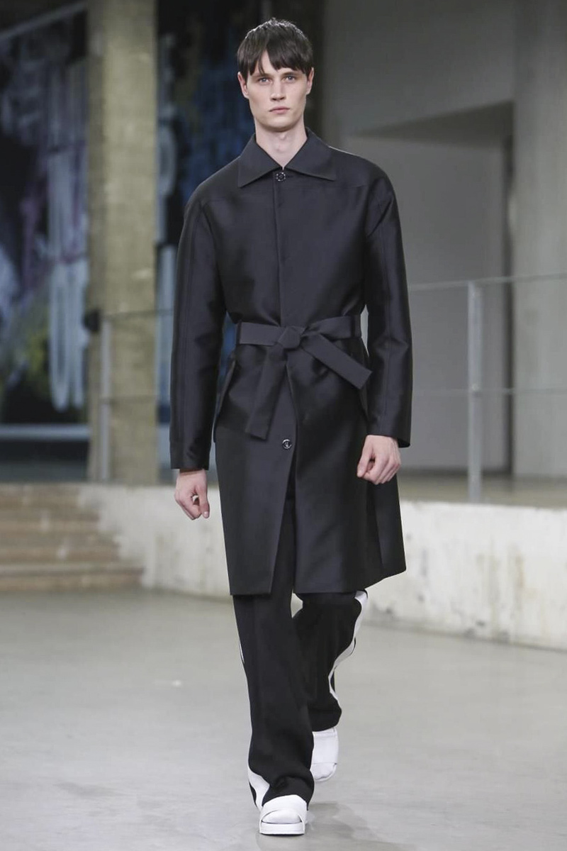 Carven at Paris Fashion Week presented his Menswear. Inspired by the working class, British designer Guillaume Henry brought a simple focus to Carven for spring/summer 2015. Simplifying his designs, Henry contributed to a season that has overall renewed a focus in wearable fashions. Crafting a simple wardrobe with clean lines and relaxed fits, sleek belted coats, jackets with narrow lapels, zipped turtlenecks and v-neck tops were among the accessible pieces offered. Using color blocking for a series of essentials that played with proportions, Henry produced shirting in black and white, constructed with boxy sleeves and a lean fit.