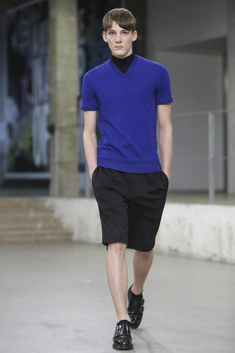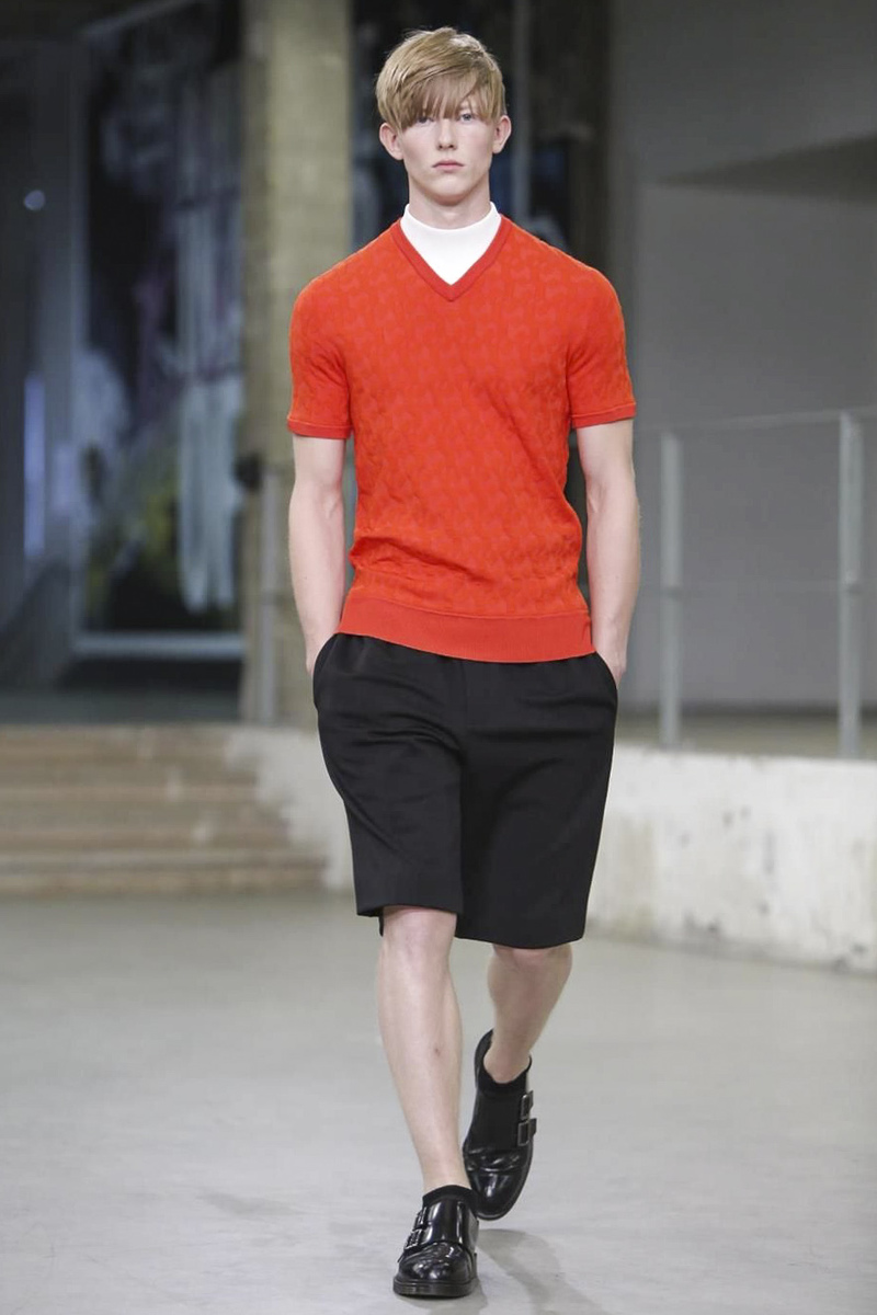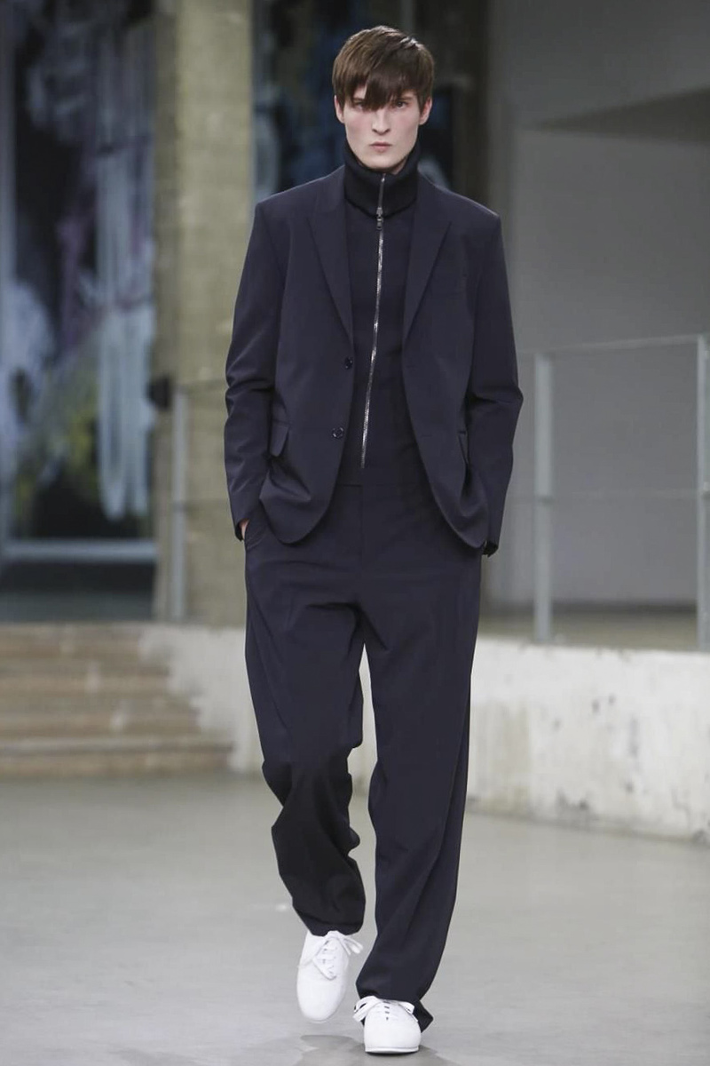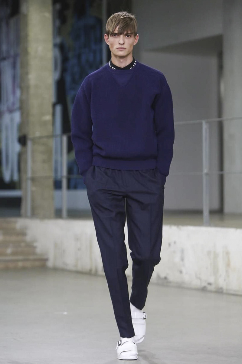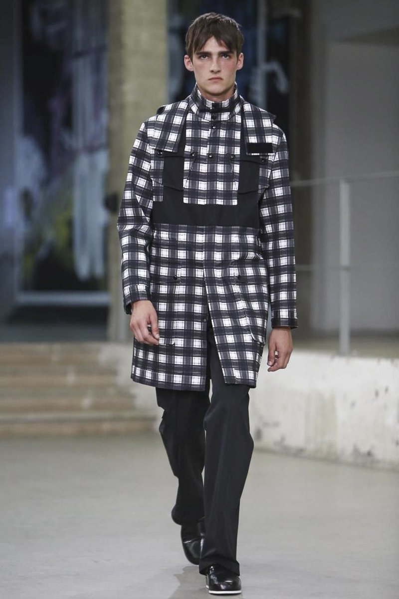 Carven at Paris Fashion Week presented his Menswear. Inspired by the working class, British designer Guillaume Henry brought a simple focus to Carven for spring/summer 2015. Simplifying his designs, Henry contributed to a season that has overall renewed a focus in wearable fashions. Crafting a simple wardrobe with clean lines and relaxed fits, sleek belted coats, jackets with narrow lapels, zipped turtlenecks and v-neck tops were among the accessible pieces offered. Using color blocking for a series of essentials that played with proportions, Henry produced shirting in black and white, constructed with boxy sleeves and a lean fit.