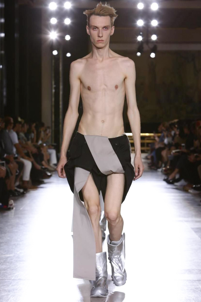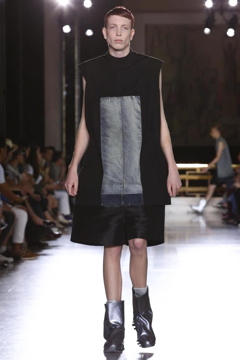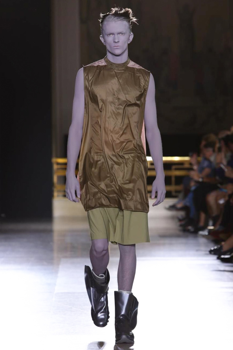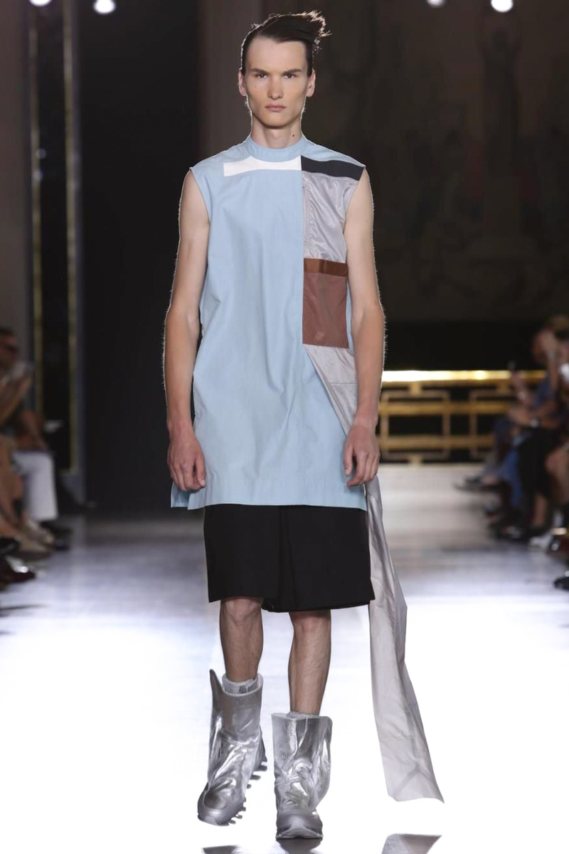 Richard Saturnino Owens , known as Rick Owens, is an American fashion designer from Porterville, California. Leave it to American designer Rick Owens to think out of this world when it comes to spring/summer 2015. No stranger to unorthodox ideas, Owens sent models down the catwalk with hair obstructing their faces and some even painted odd colors head to toe. Presenting his own take on alien chic, Owens, known for his shades of black, infused the range with color, going from marble gray to blue and plum. Long double-breasted coats and draped elongated tops fit right in with color blocked sarongs. Sleeveless tops were paired with loose minimal shorts. Completing the collection with harnesses and below the knee coats that could easily serve as a look in its own, the last element to take in was the collection’s slouchy boots, Owens’ own take on the moon boot perhaps.