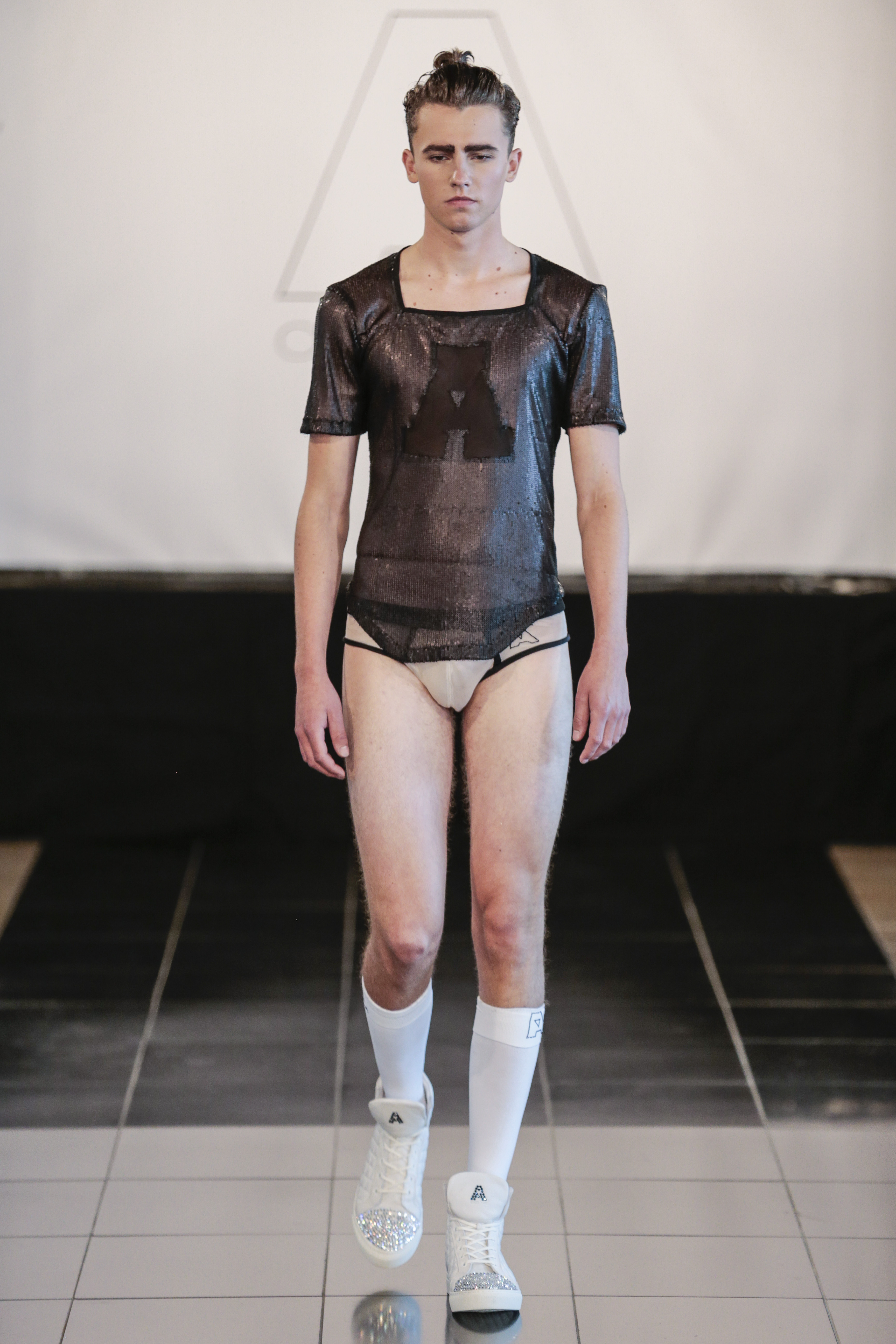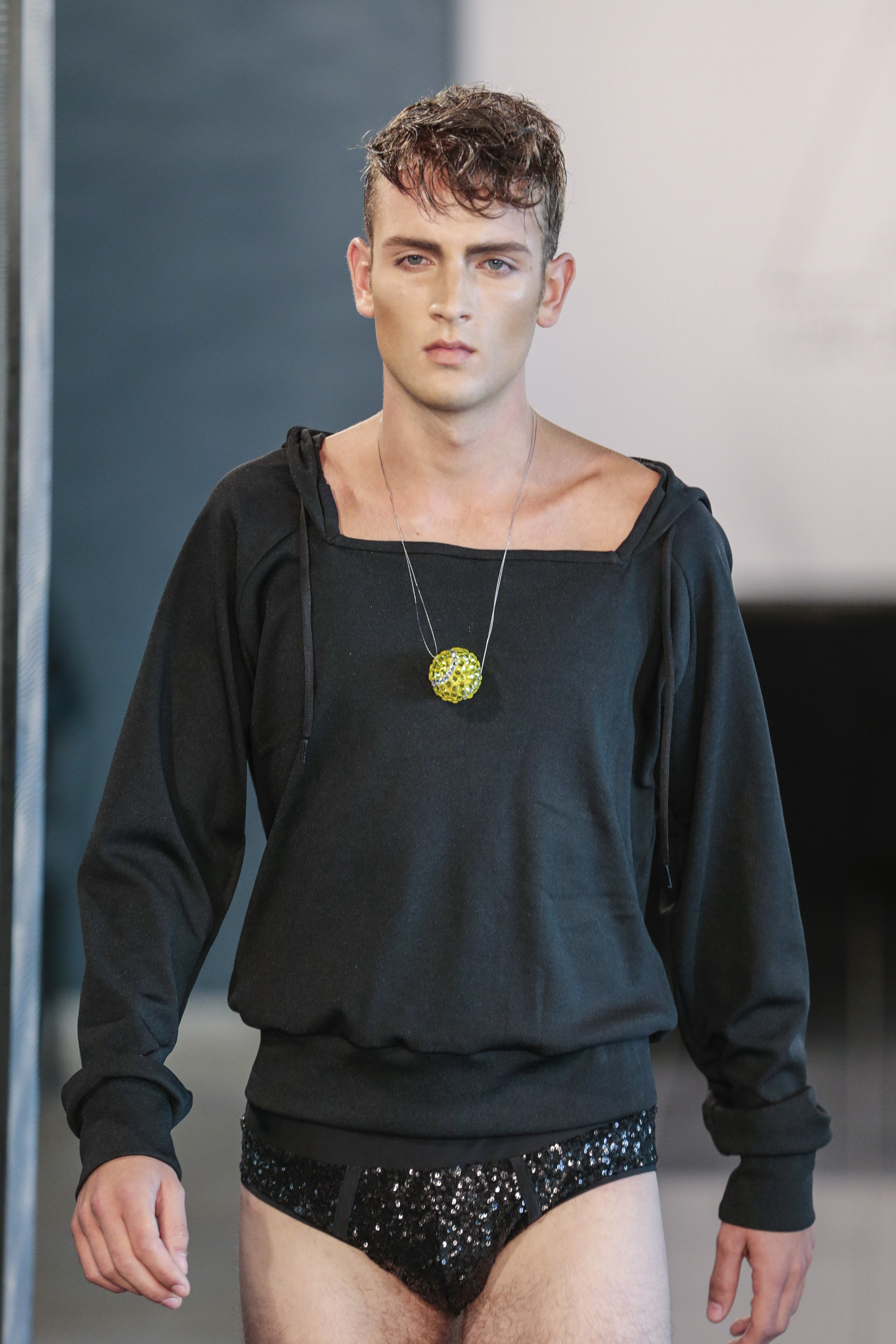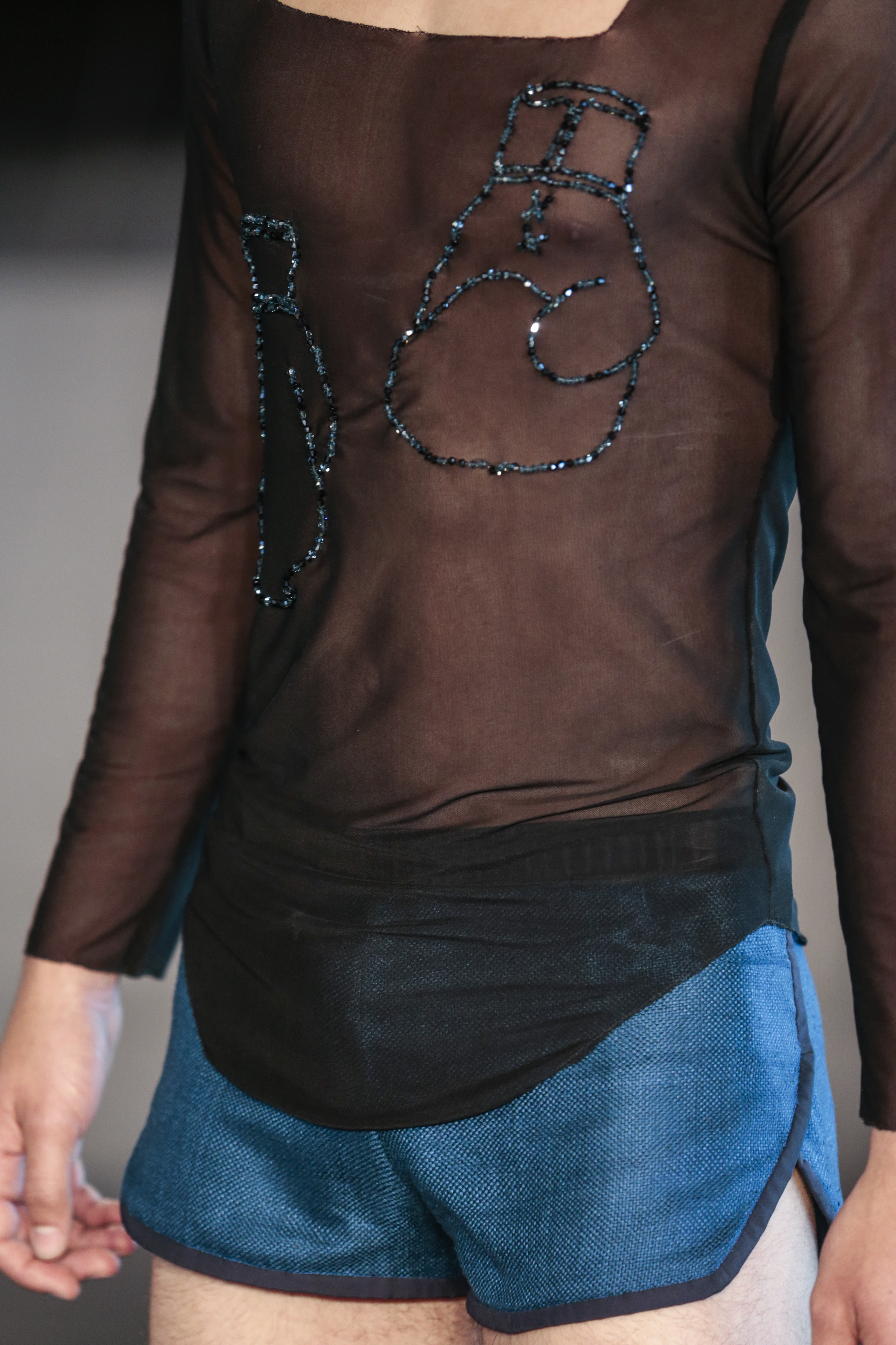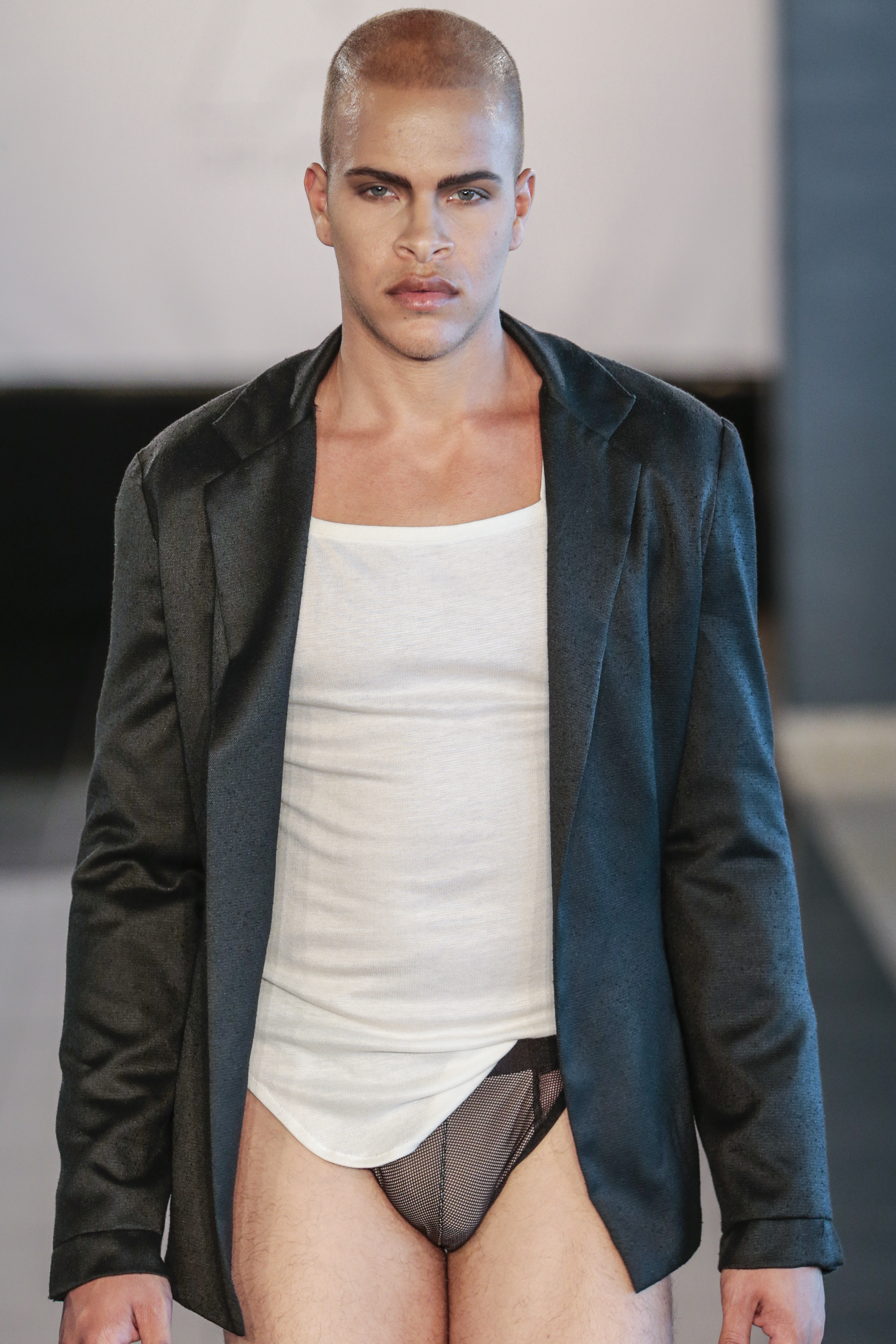Particularly I love all details behind, those tennis shoes with rhinestones, the see-thru blazer is fabulous, and classic but chic bags for men, the tiny briefs and see-thru white shirt over there, are a blast!