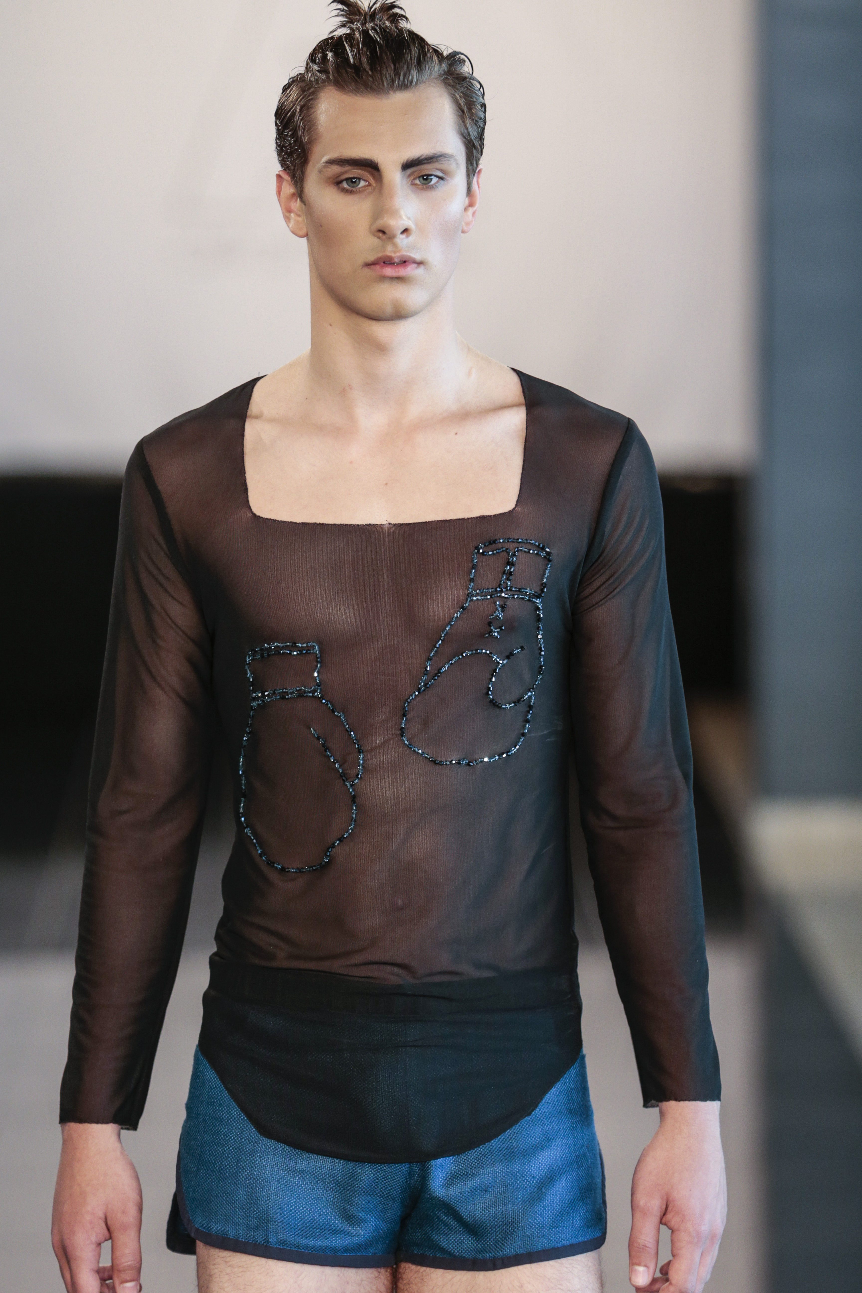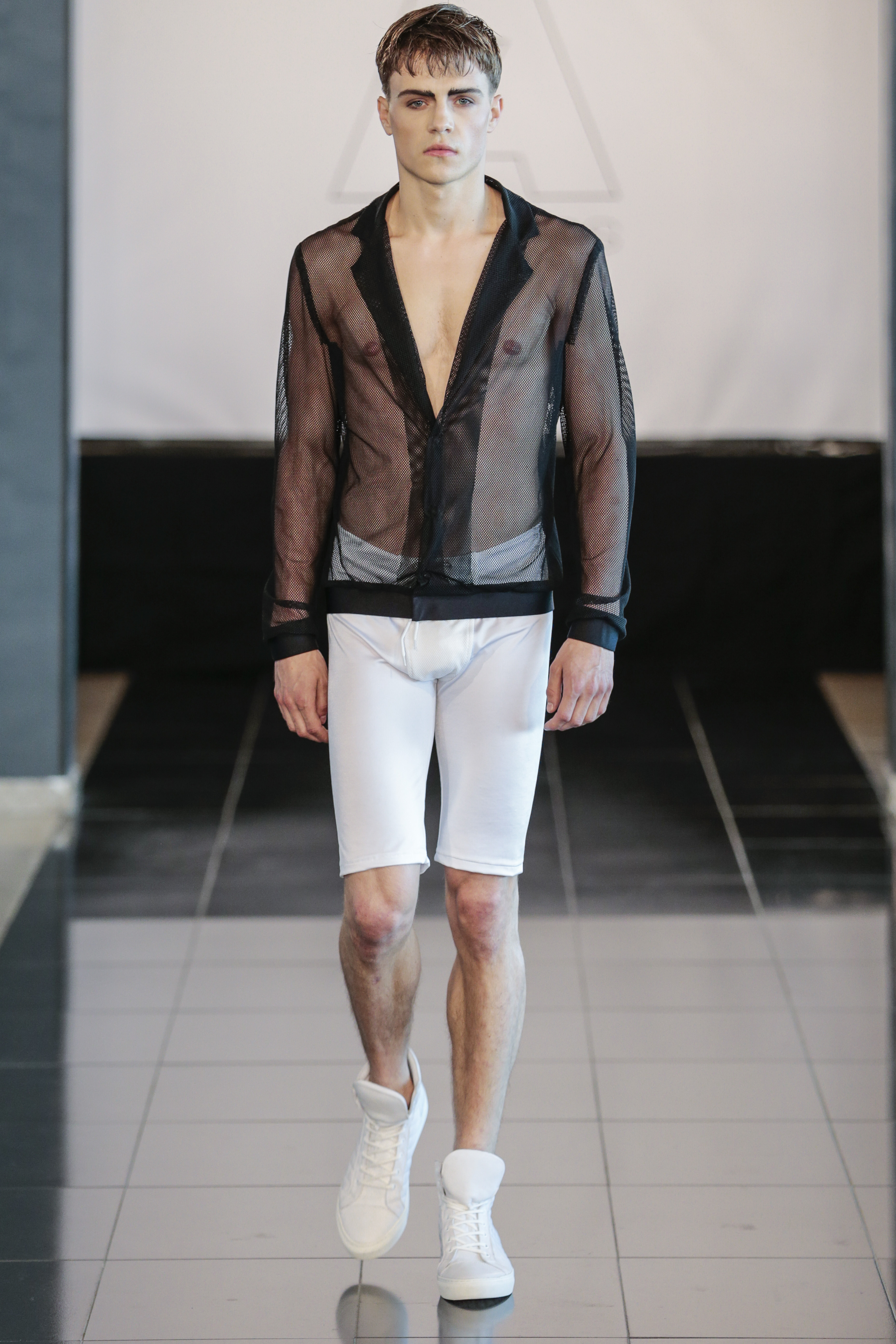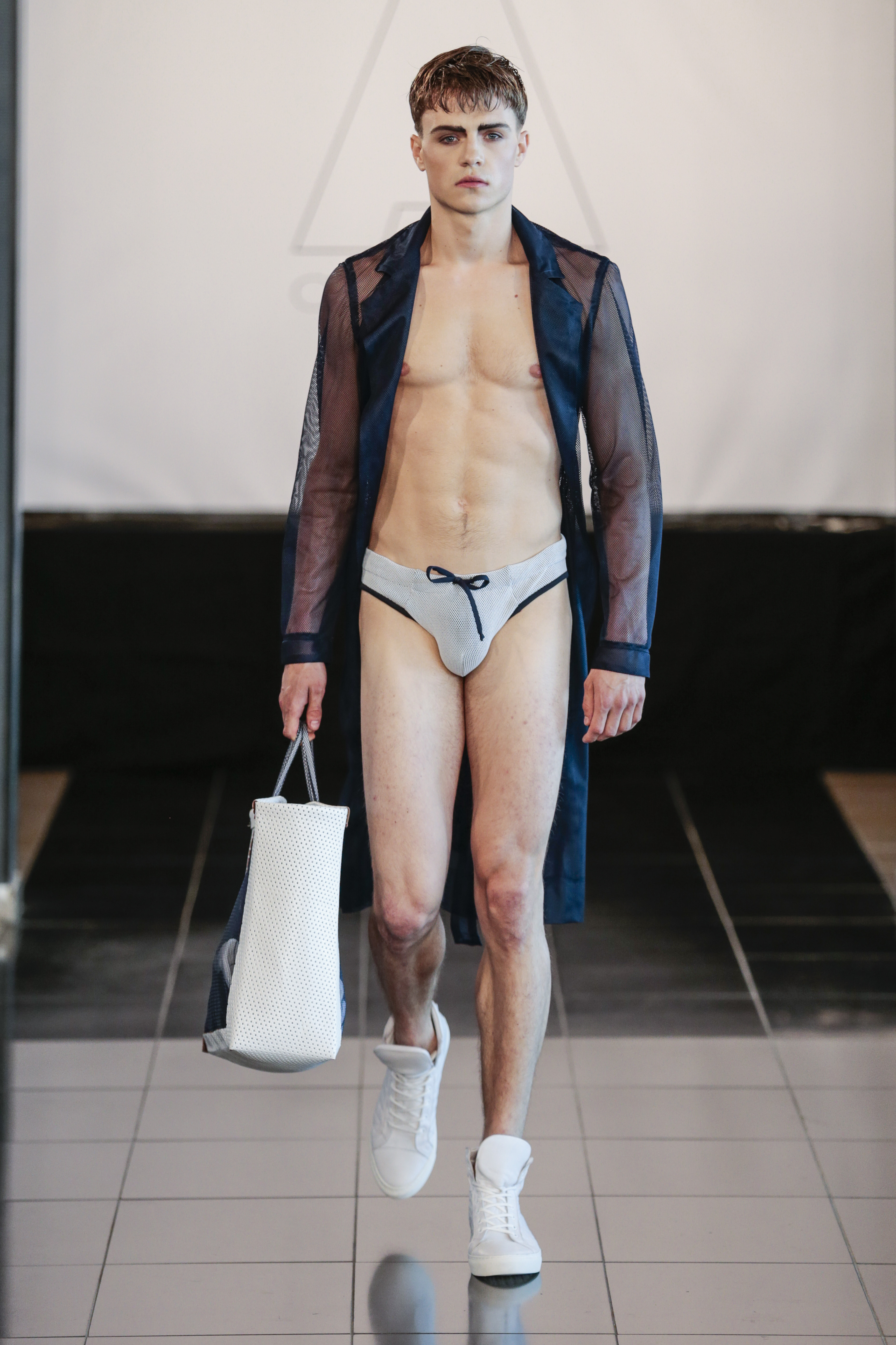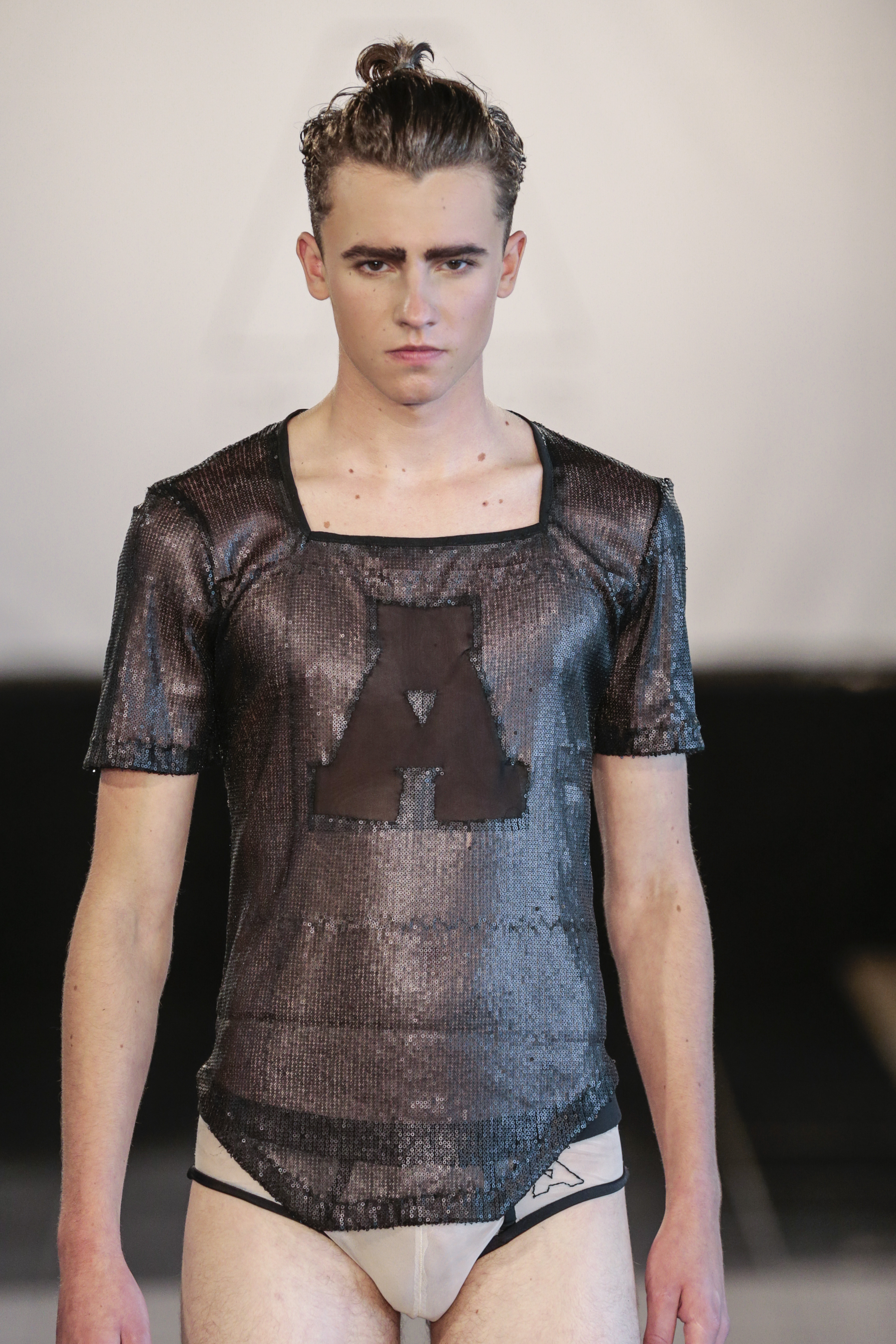 Particularly I love all details behind, those tennis shoes with rhinestones, the see-thru blazer is fabulous, and classic but chic bags for men, the tiny briefs and see-thru white shirt over there, are a blast!