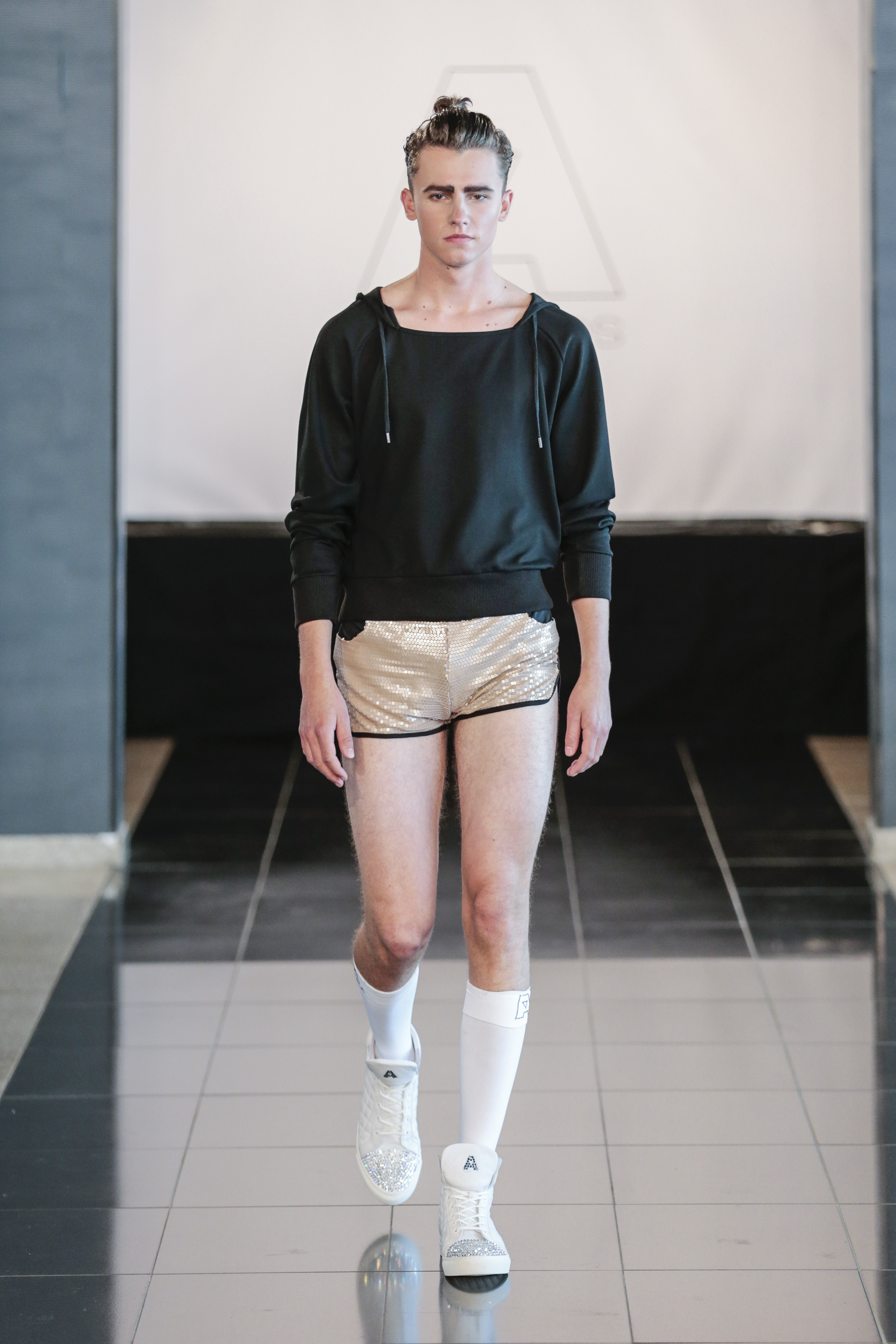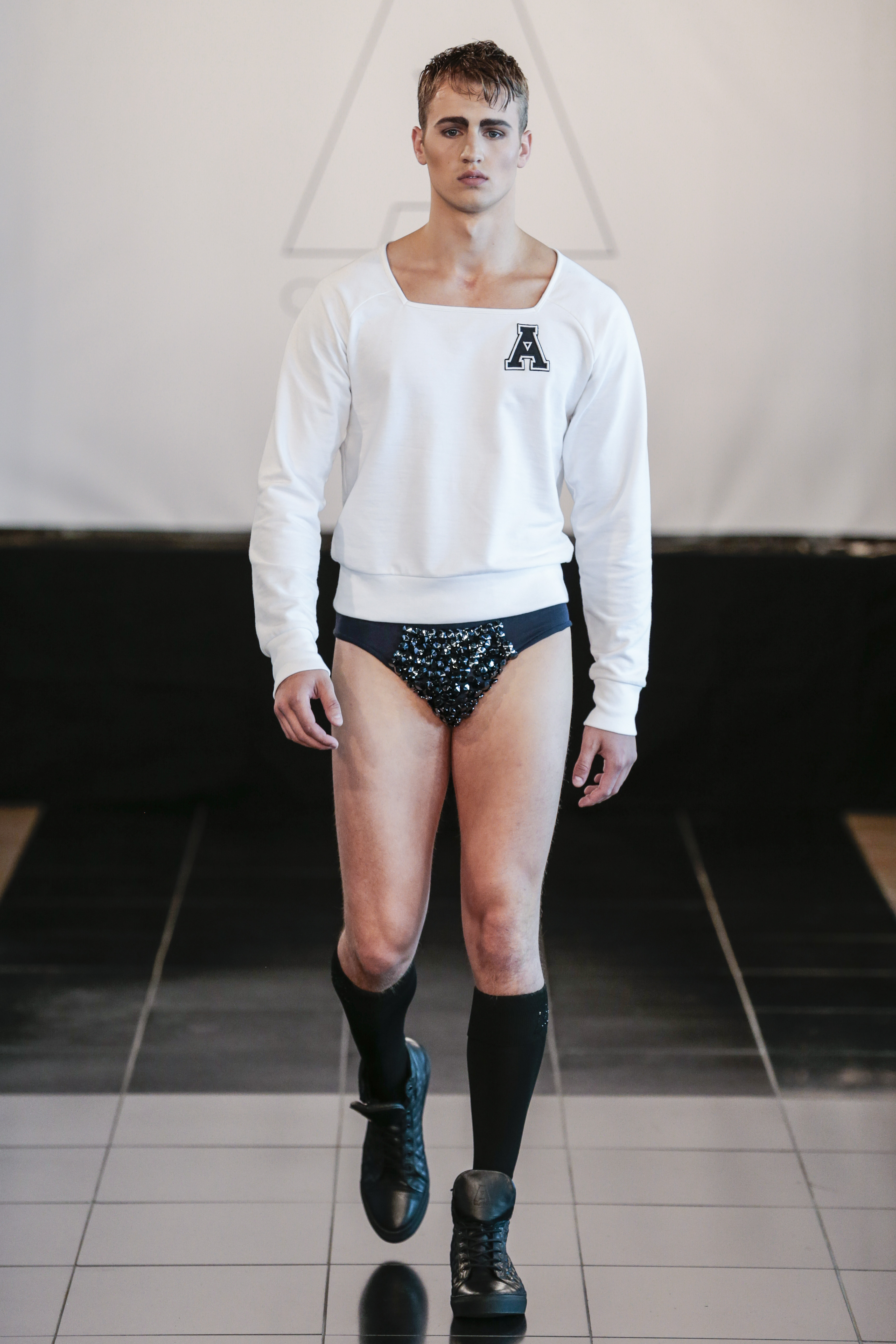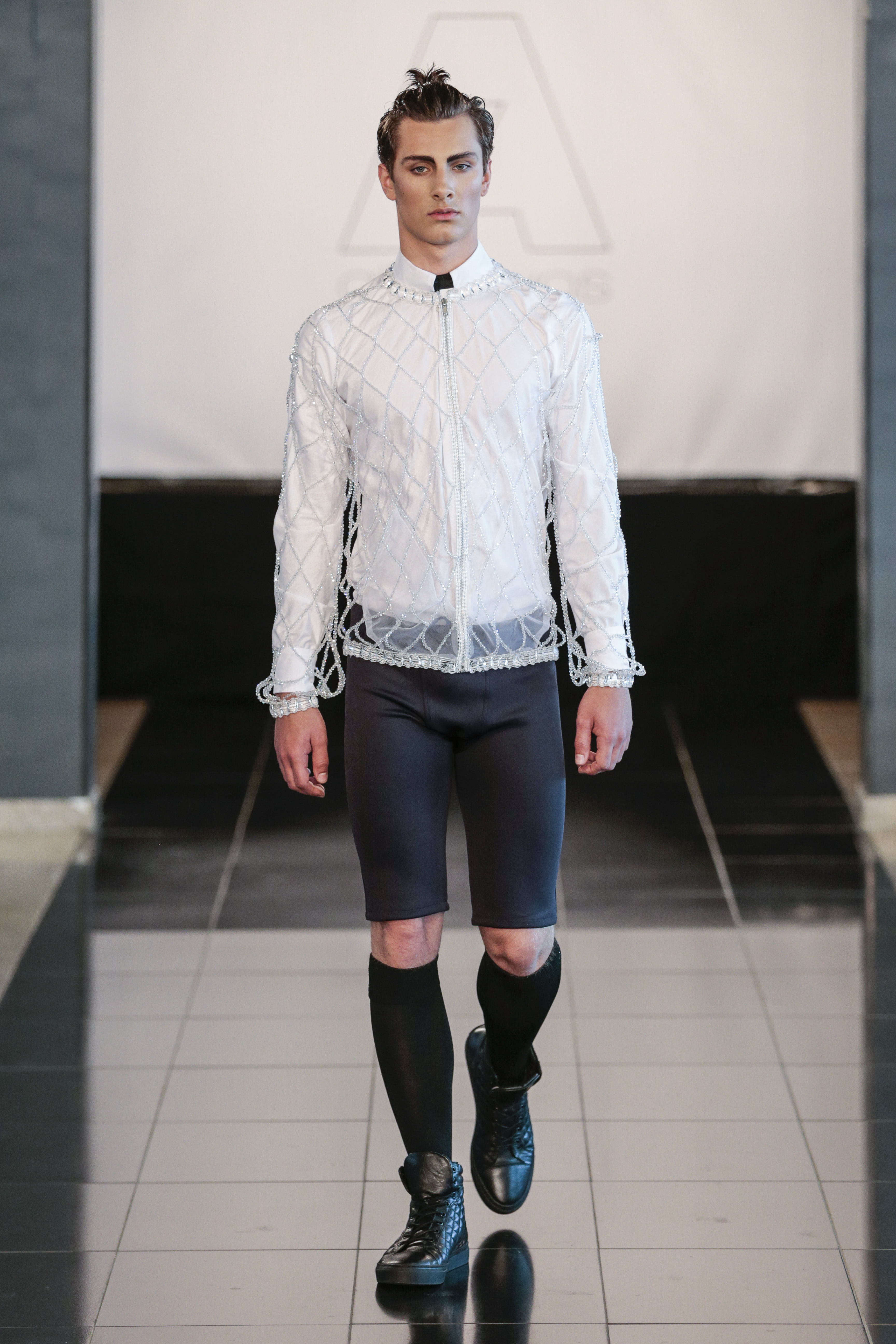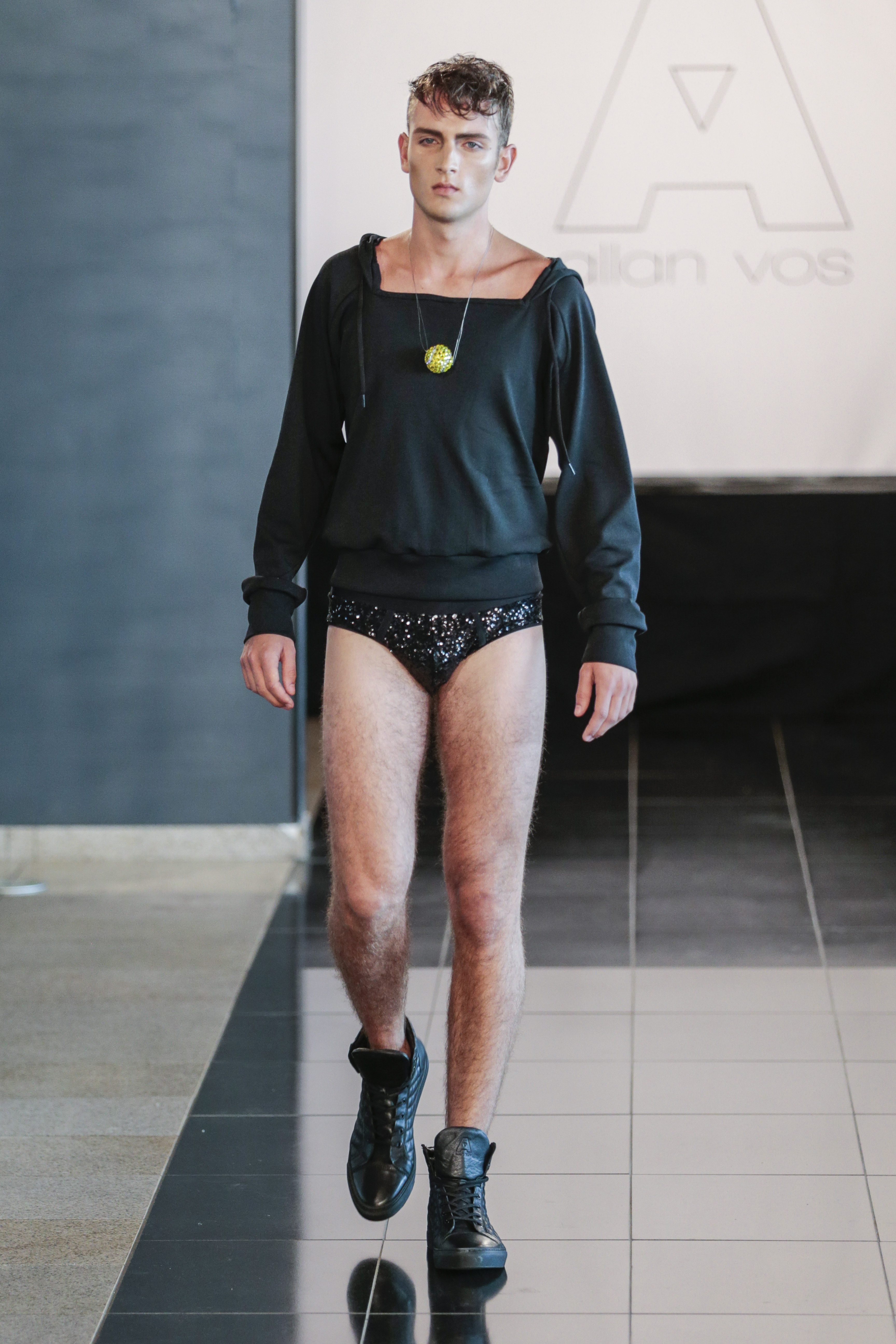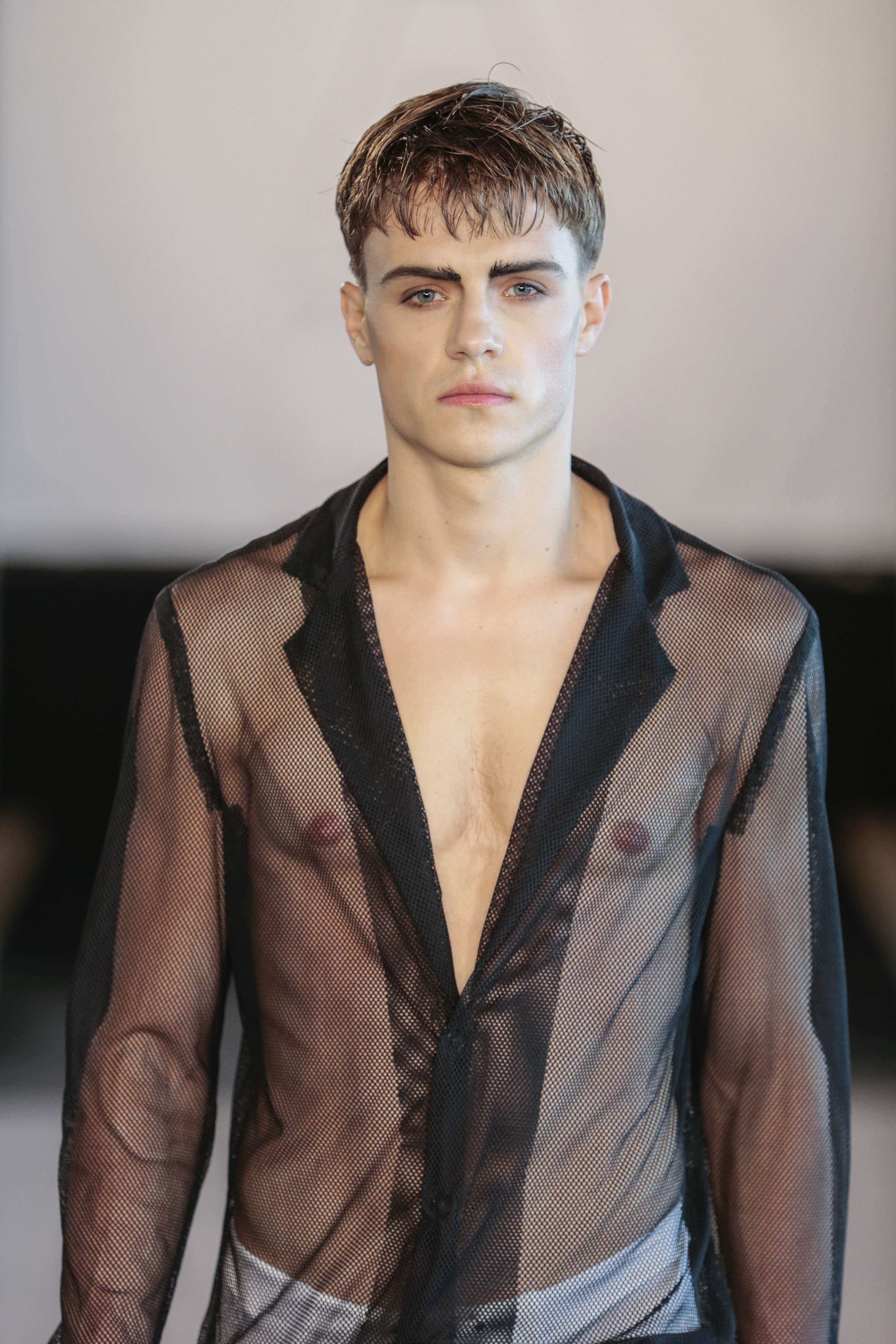 Particularly I love all details behind, those tennis shoes with rhinestones, the see-thru blazer is fabulous, and classic but chic bags for men, the tiny briefs and see-thru white shirt over there, are a blast!