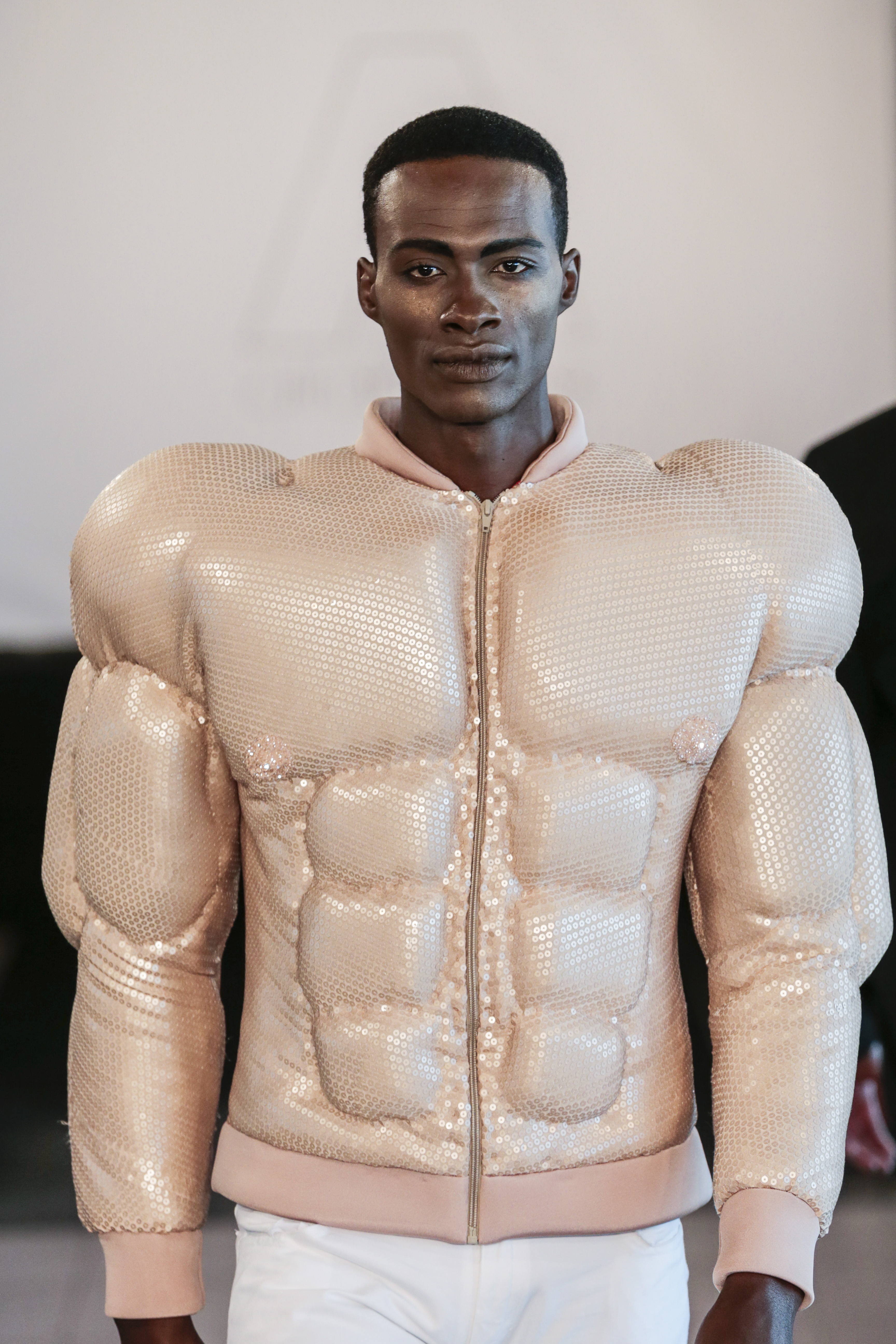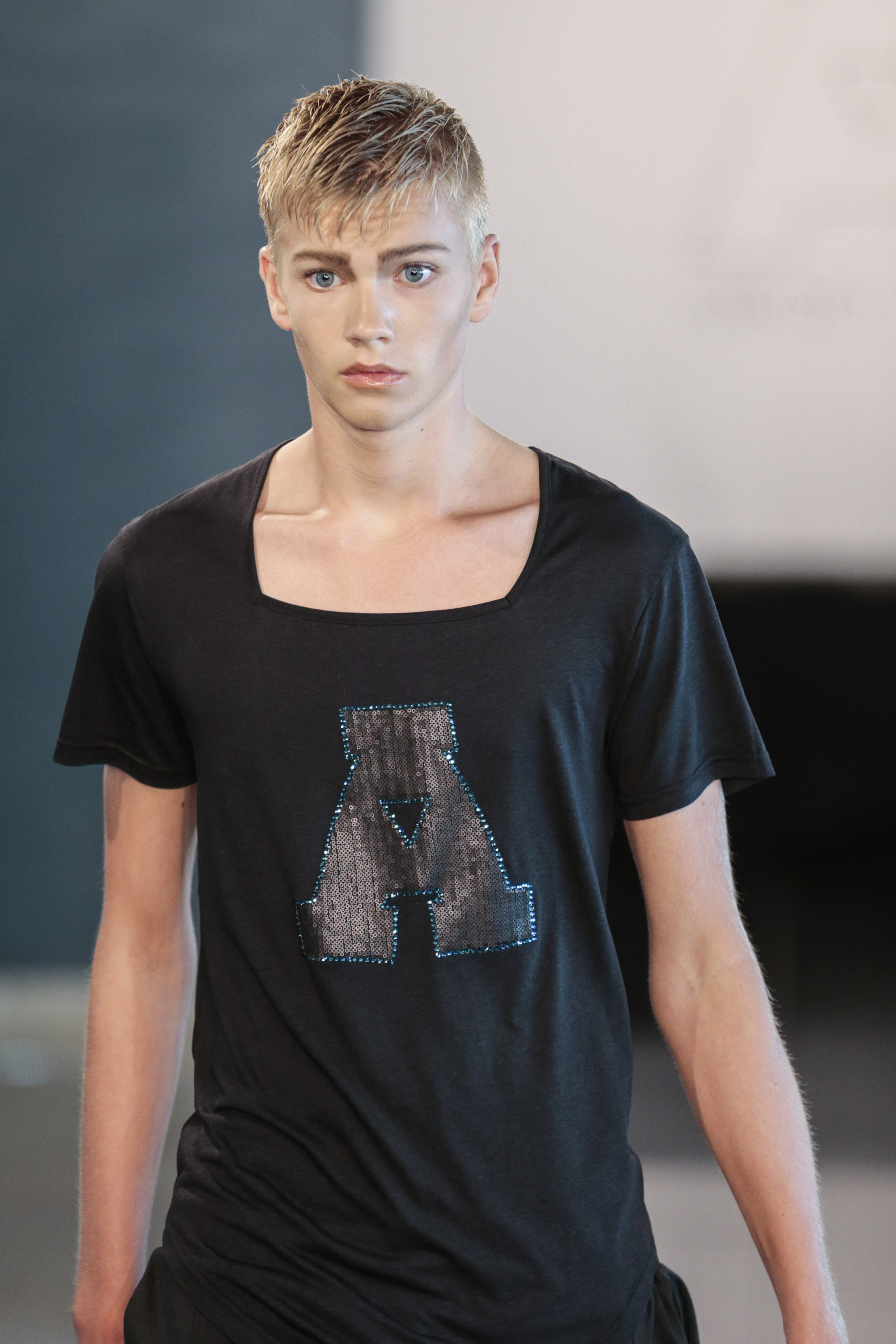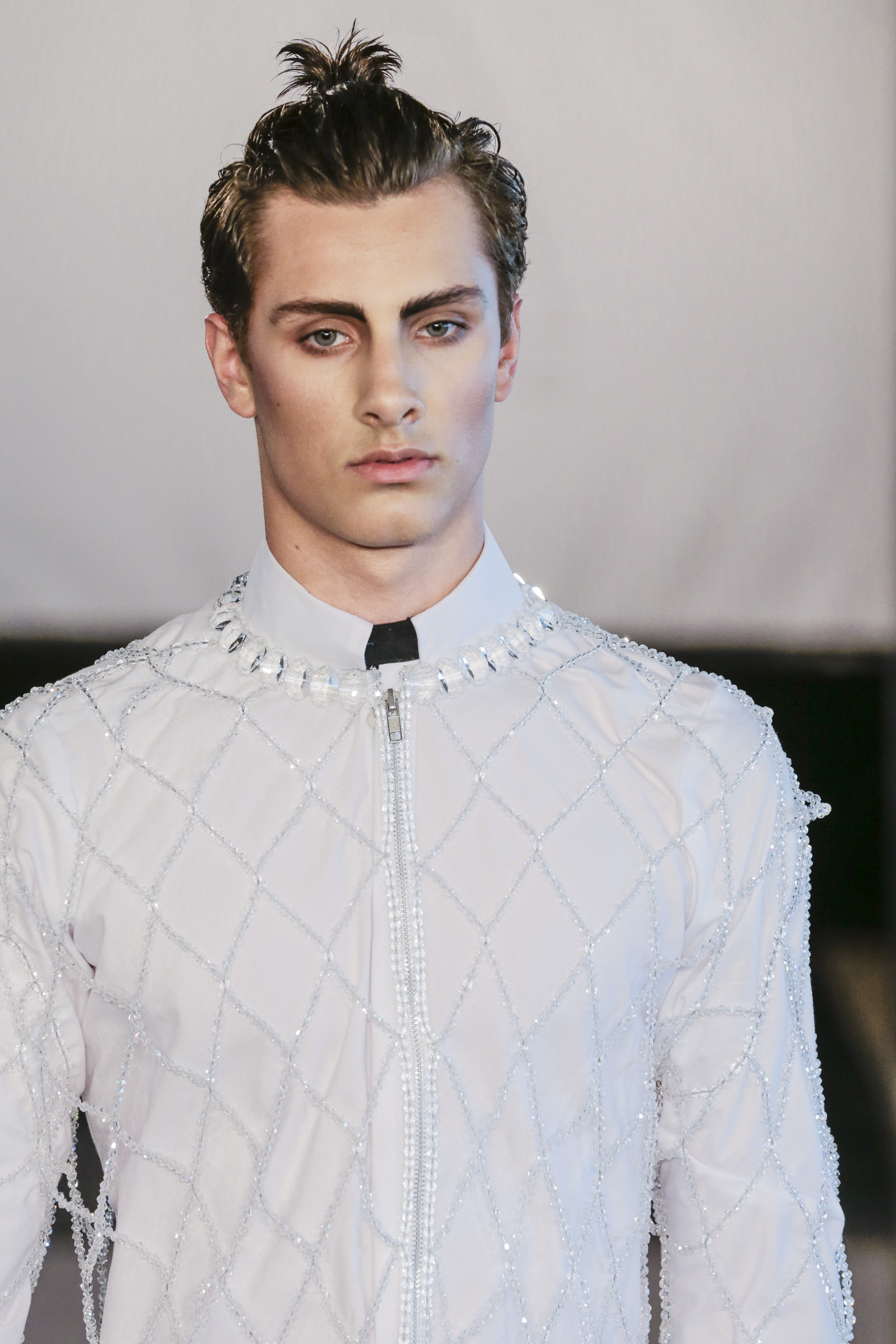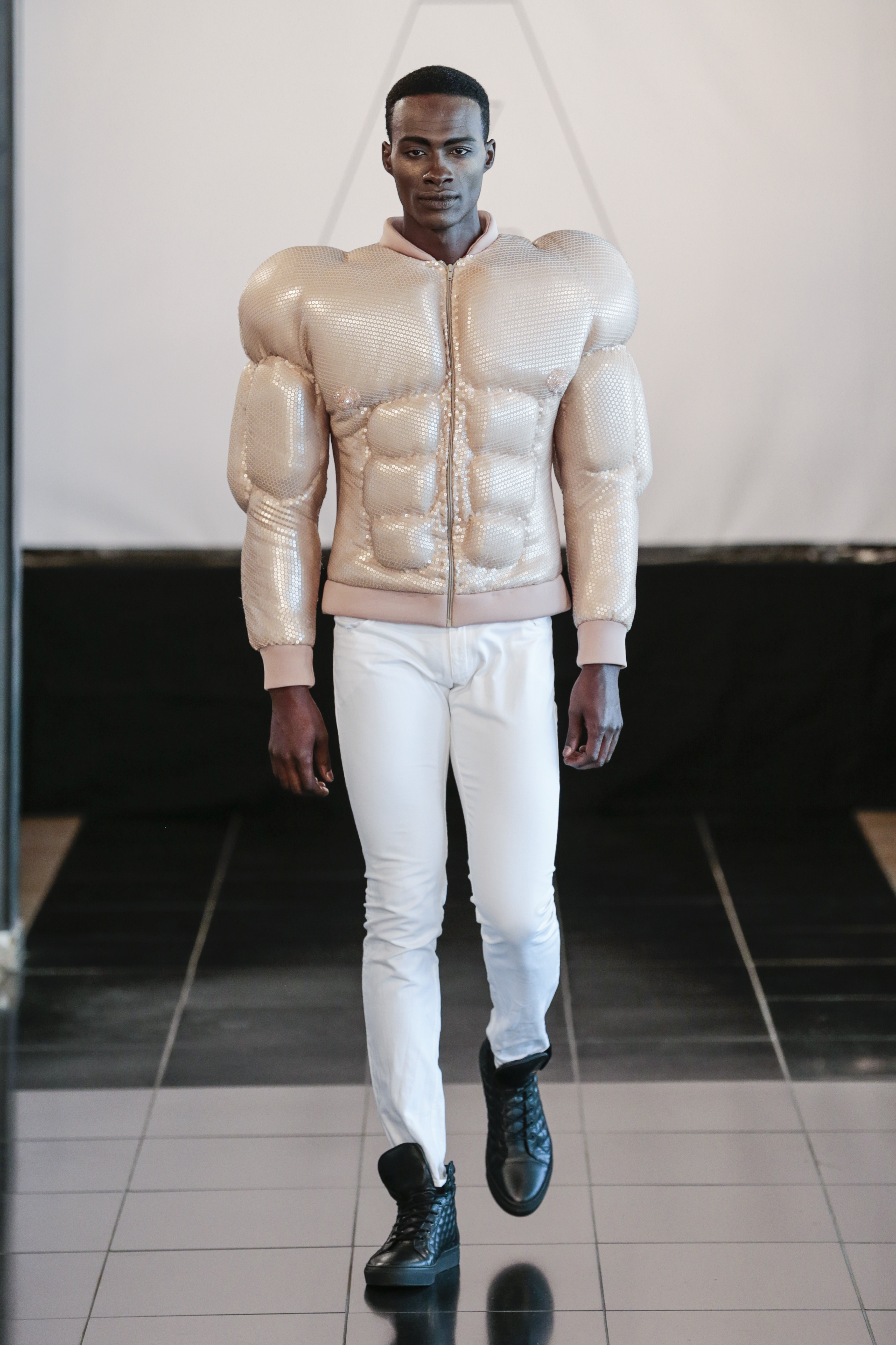 Particularly I love all details behind, those tennis shoes with rhinestones, the see-thru blazer is fabulous, and classic but chic bags for men, the tiny briefs and see-thru white shirt over there, are a blast!