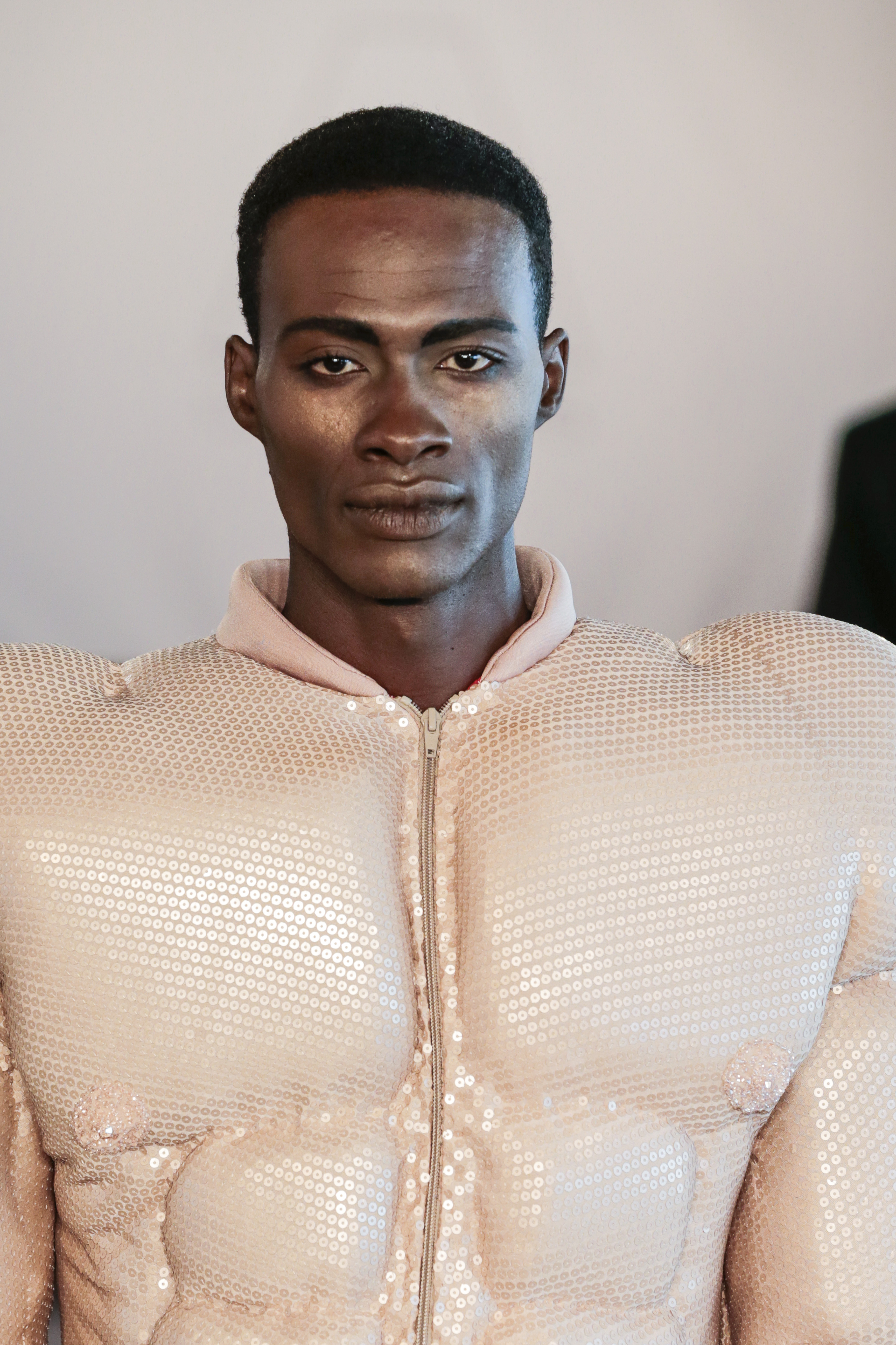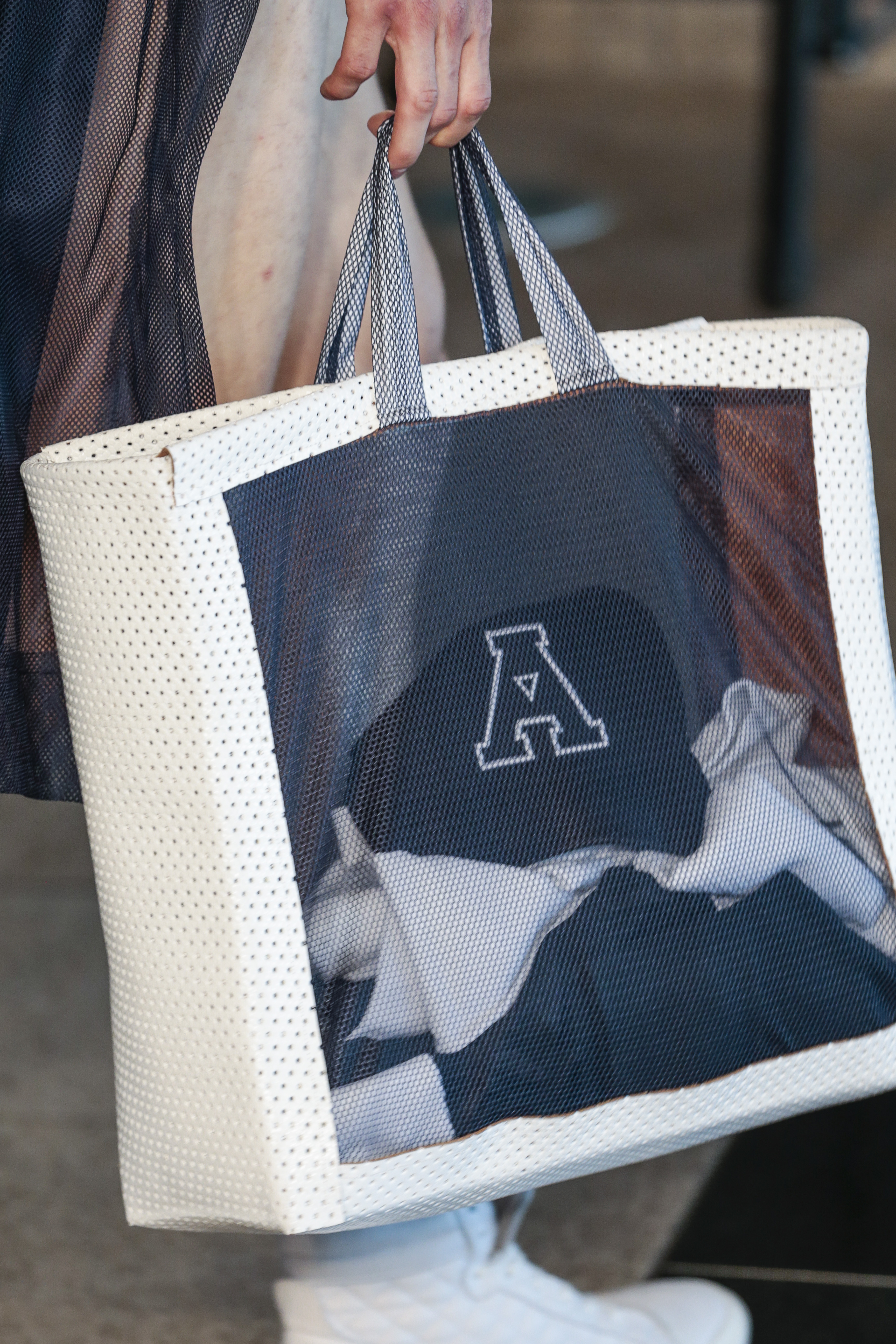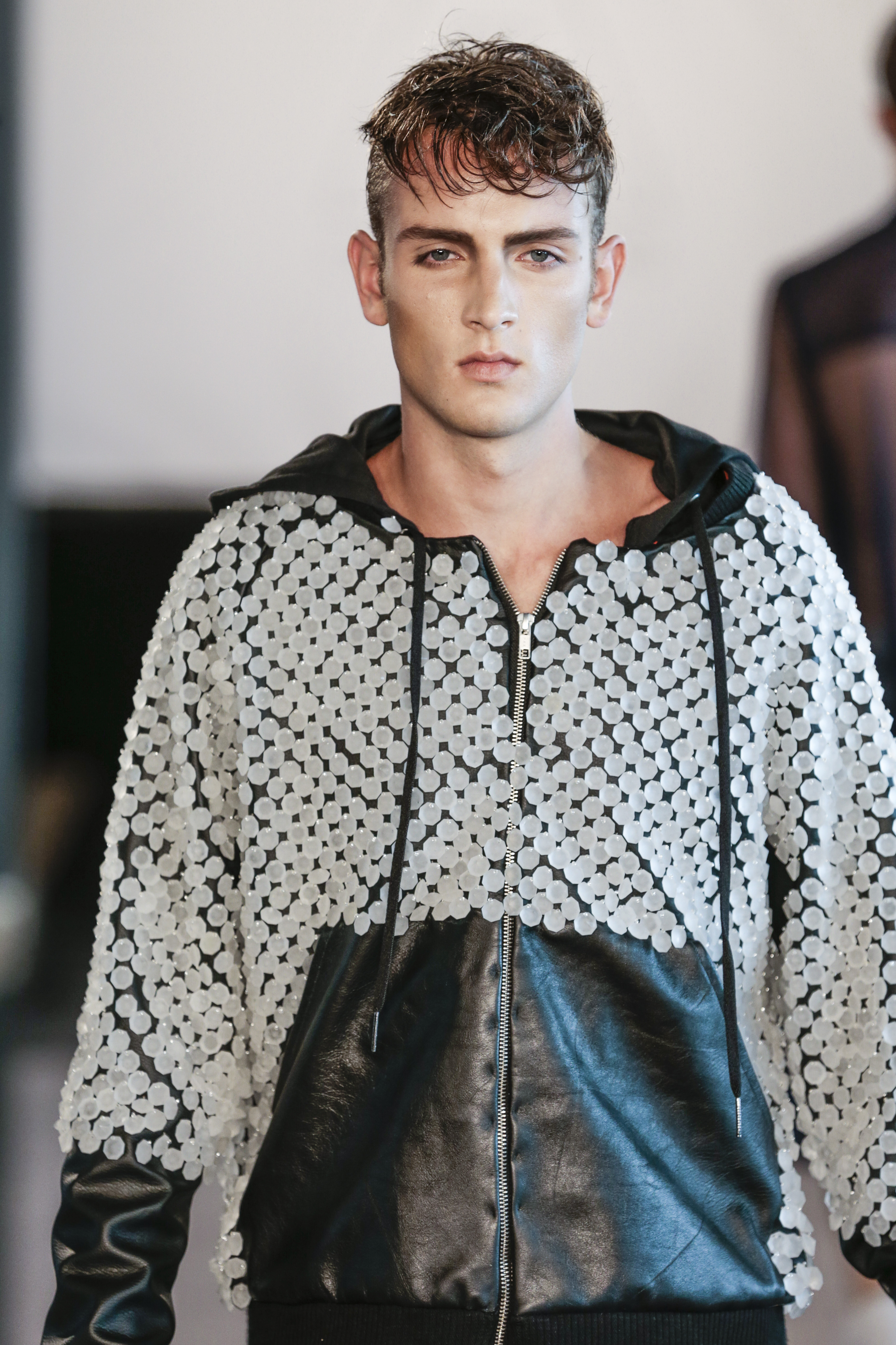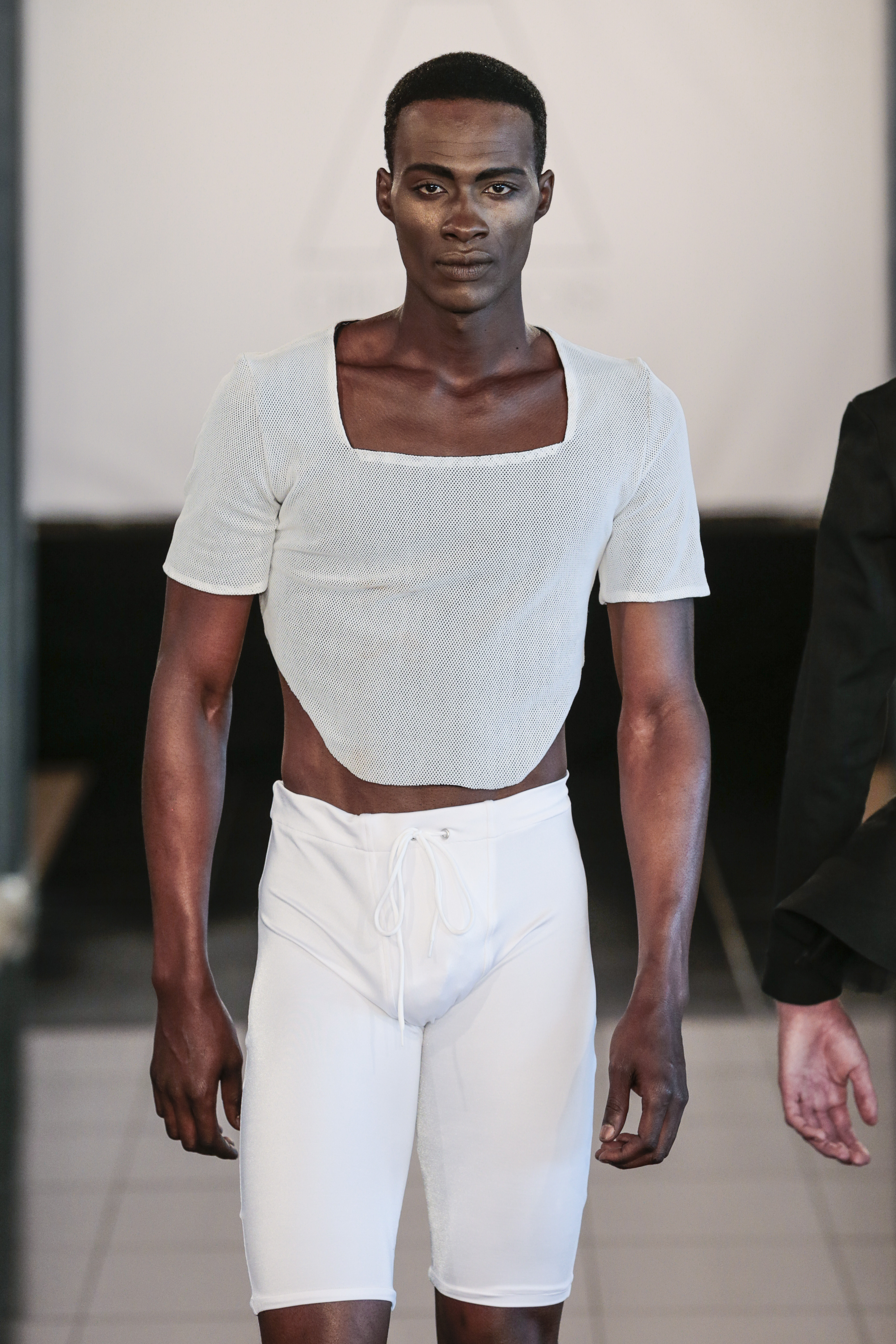 Particularly I love all details behind, those tennis shoes with rhinestones, the see-thru blazer is fabulous, and classic but chic bags for men, the tiny briefs and see-thru white shirt over there, are a blast!