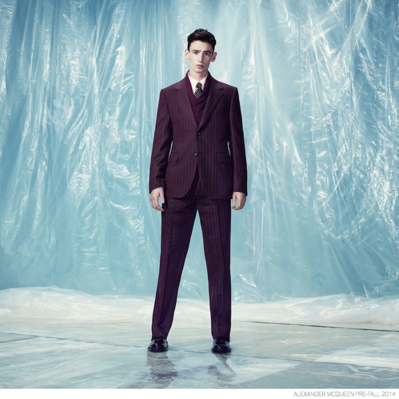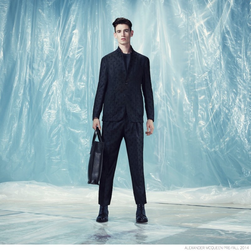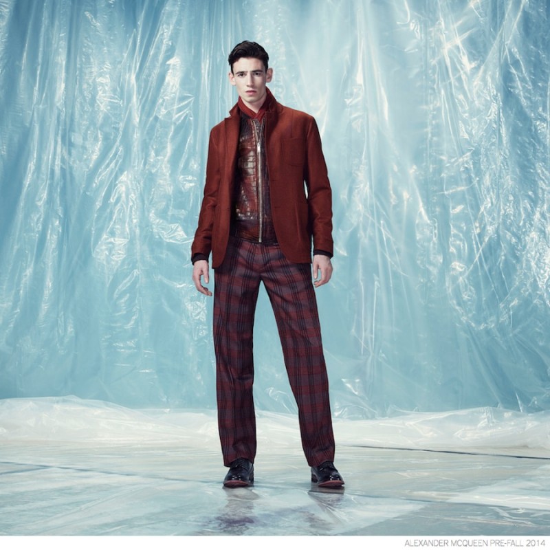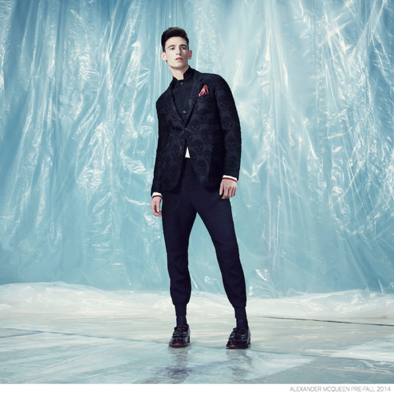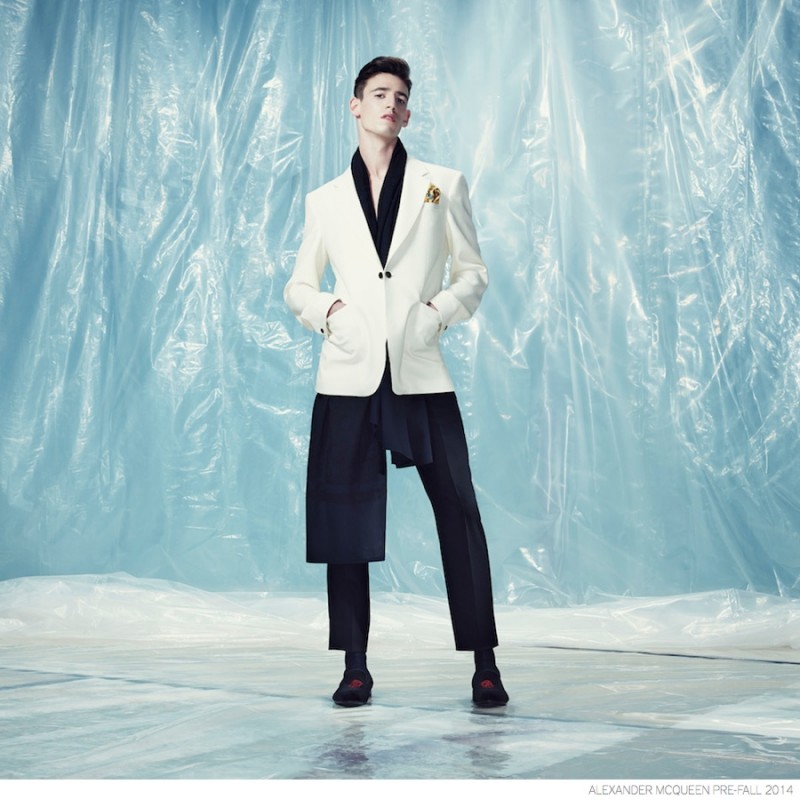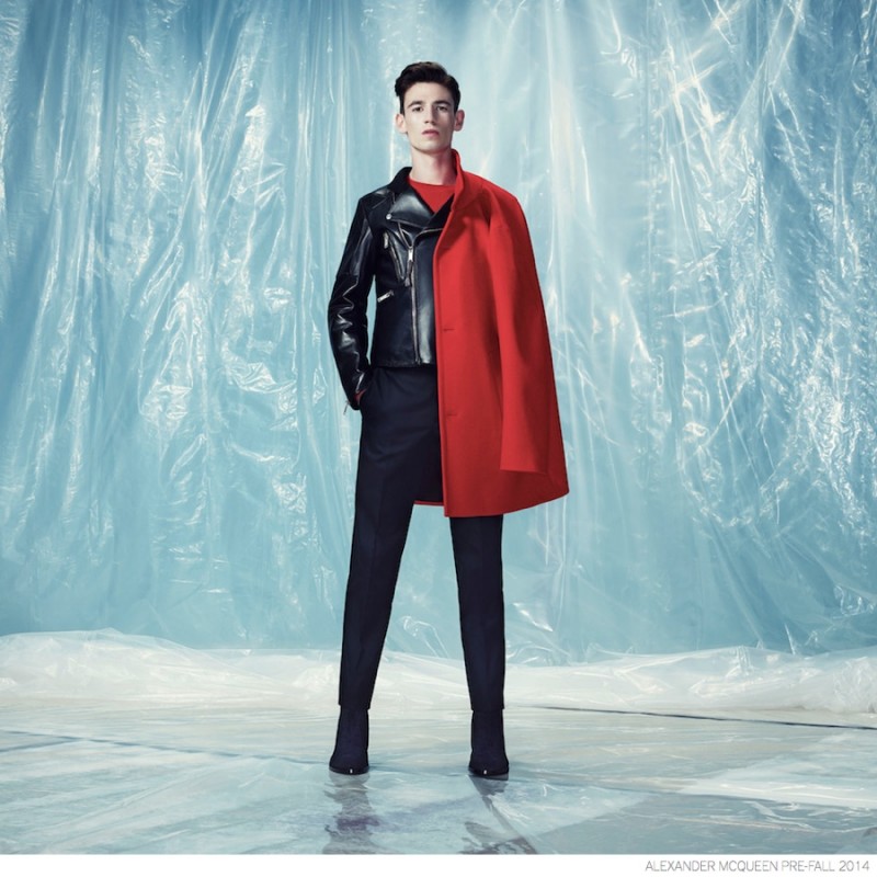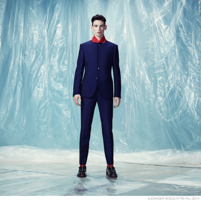 There’s an atmosphere of severe refinement around Alexander McQueen’s pre-fall 2014 menswear collection. It’s an almost nostalgic aura that pervades Sarah Burton’s designs, which capture the essence of modern menswear. Focusing on refined silhouettes, the label delivers a pre-fall offering which is a tribute to the elegance of historical dandies, Oscar Wilde above all. With its impeccably cut proportions, Alexander McQueen’s collection isn’t focused only on dandyish styles. The functional sportswear aesthetic influences in fact a selection of garments, that get mixed with more sophisticated pieces, creating smart styles with a confident personality. This season, shapes are simpler and trousers shorter, stopping at the ankle, while the collection’s main colors are essential, often illuminated by frosty white hues or vivid fiery tones.