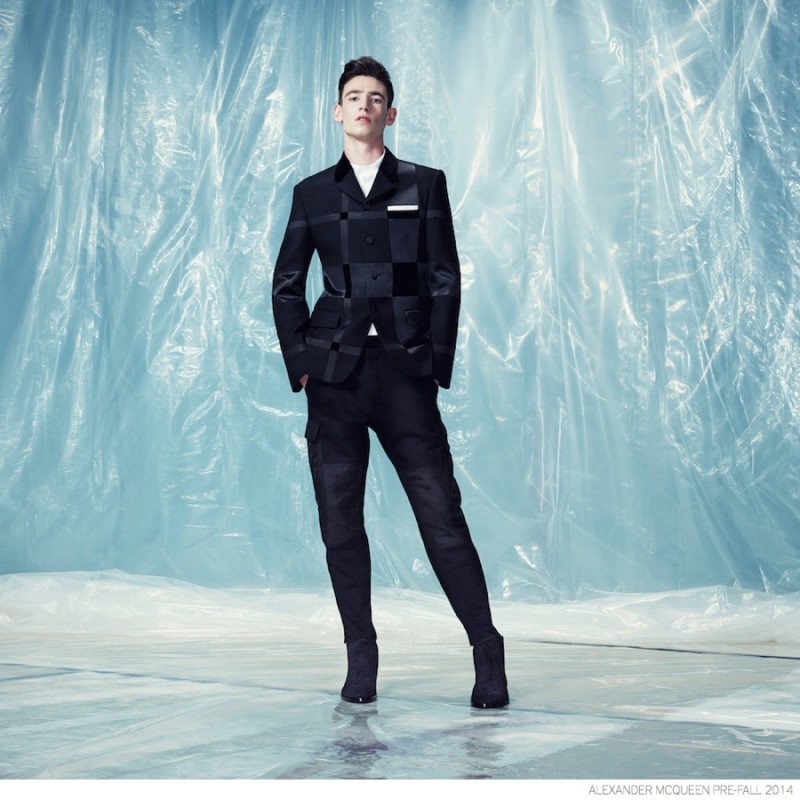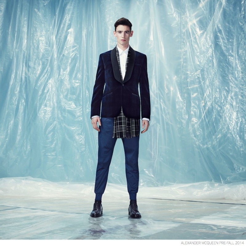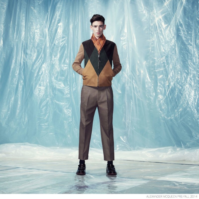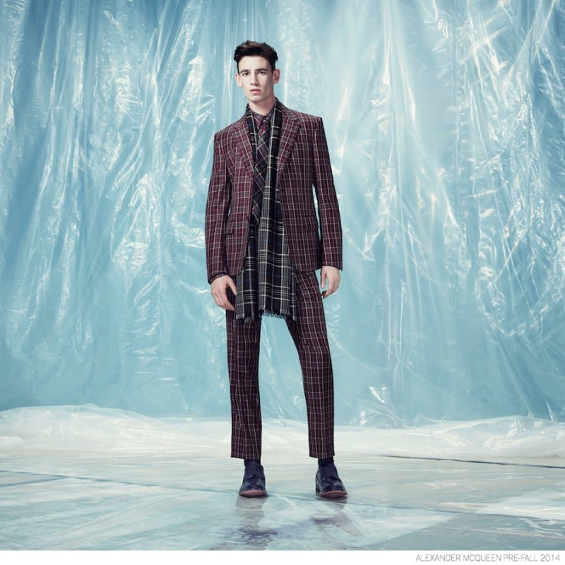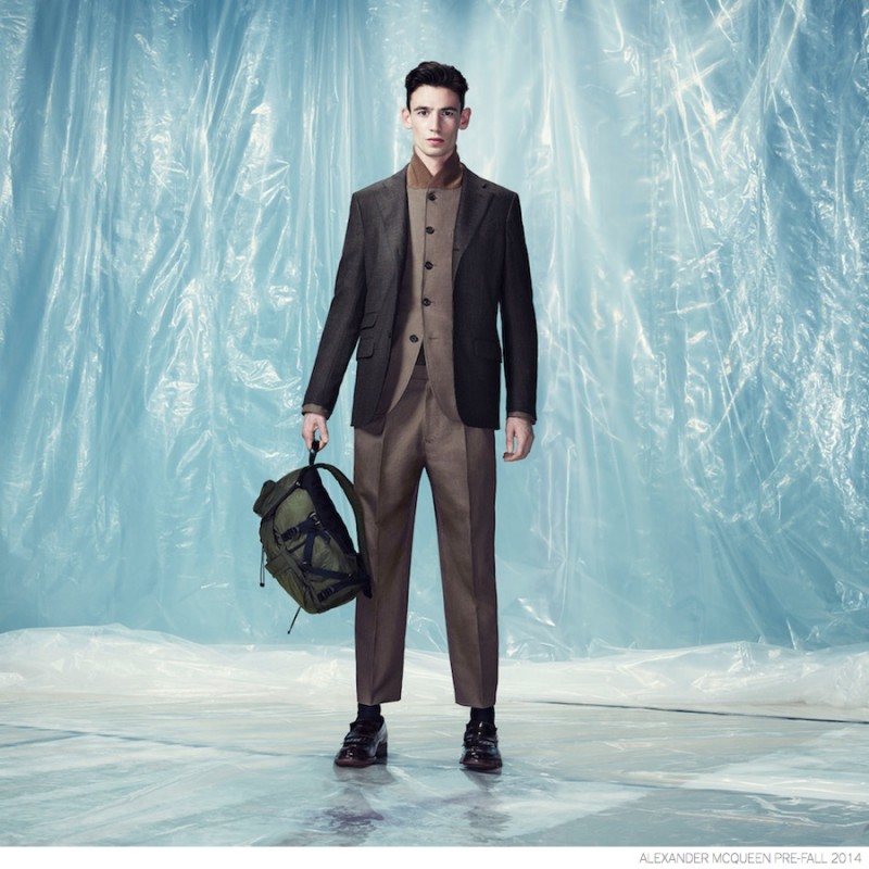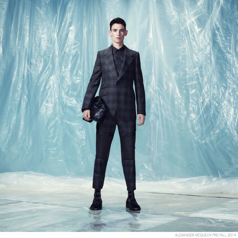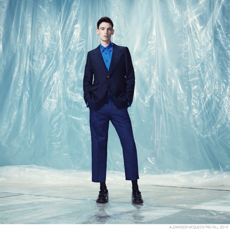 There’s an atmosphere of severe refinement around Alexander McQueen’s pre-fall 2014 menswear collection. It’s an almost nostalgic aura that pervades Sarah Burton’s designs, which capture the essence of modern menswear. Focusing on refined silhouettes, the label delivers a pre-fall offering which is a tribute to the elegance of historical dandies, Oscar Wilde above all. With its impeccably cut proportions, Alexander McQueen’s collection isn’t focused only on dandyish styles. The functional sportswear aesthetic influences in fact a selection of garments, that get mixed with more sophisticated pieces, creating smart styles with a confident personality. This season, shapes are simpler and trousers shorter, stopping at the ankle, while the collection’s main colors are essential, often illuminated by frosty white hues or vivid fiery tones.