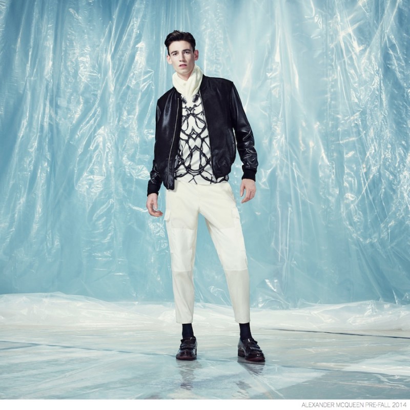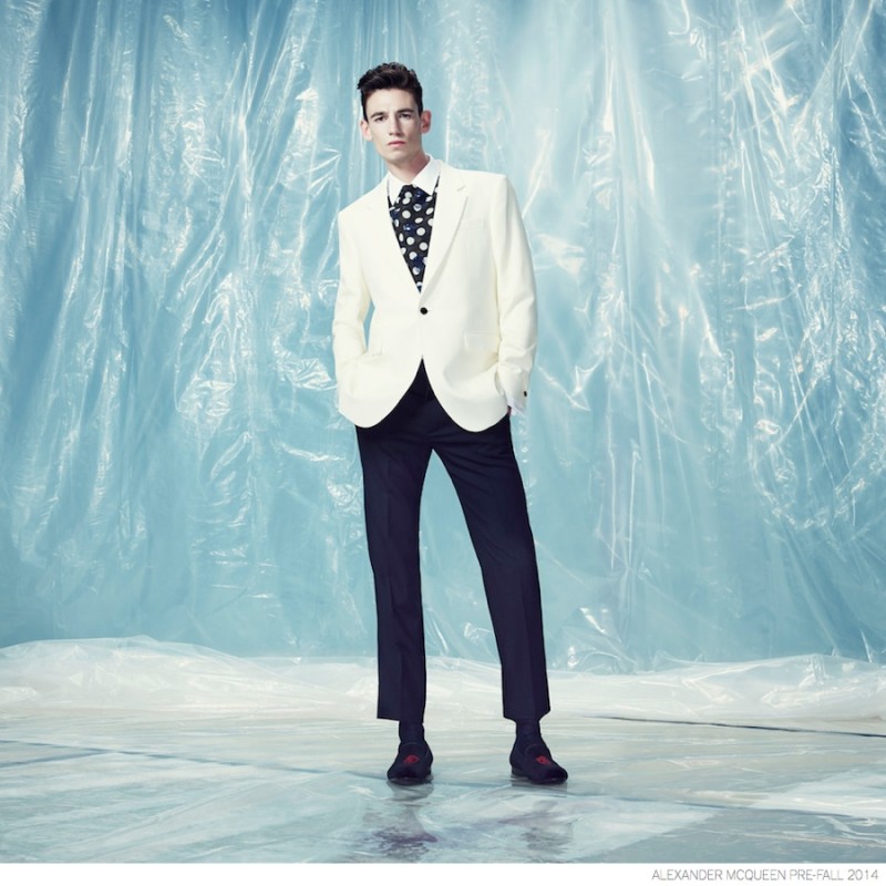 There’s an atmosphere of severe refinement around Alexander McQueen’s pre-fall 2014 menswear collection. It’s an almost nostalgic aura that pervades Sarah Burton’s designs, which capture the essence of modern menswear. Focusing on refined silhouettes, the label delivers a pre-fall offering which is a tribute to the elegance of historical dandies, Oscar Wilde above all. With its impeccably cut proportions, Alexander McQueen’s collection isn’t focused only on dandyish styles. The functional sportswear aesthetic influences in fact a selection of garments, that get mixed with more sophisticated pieces, creating smart styles with a confident personality. This season, shapes are simpler and trousers shorter, stopping at the ankle, while the collection’s main colors are essential, often illuminated by frosty white hues or vivid fiery tones.