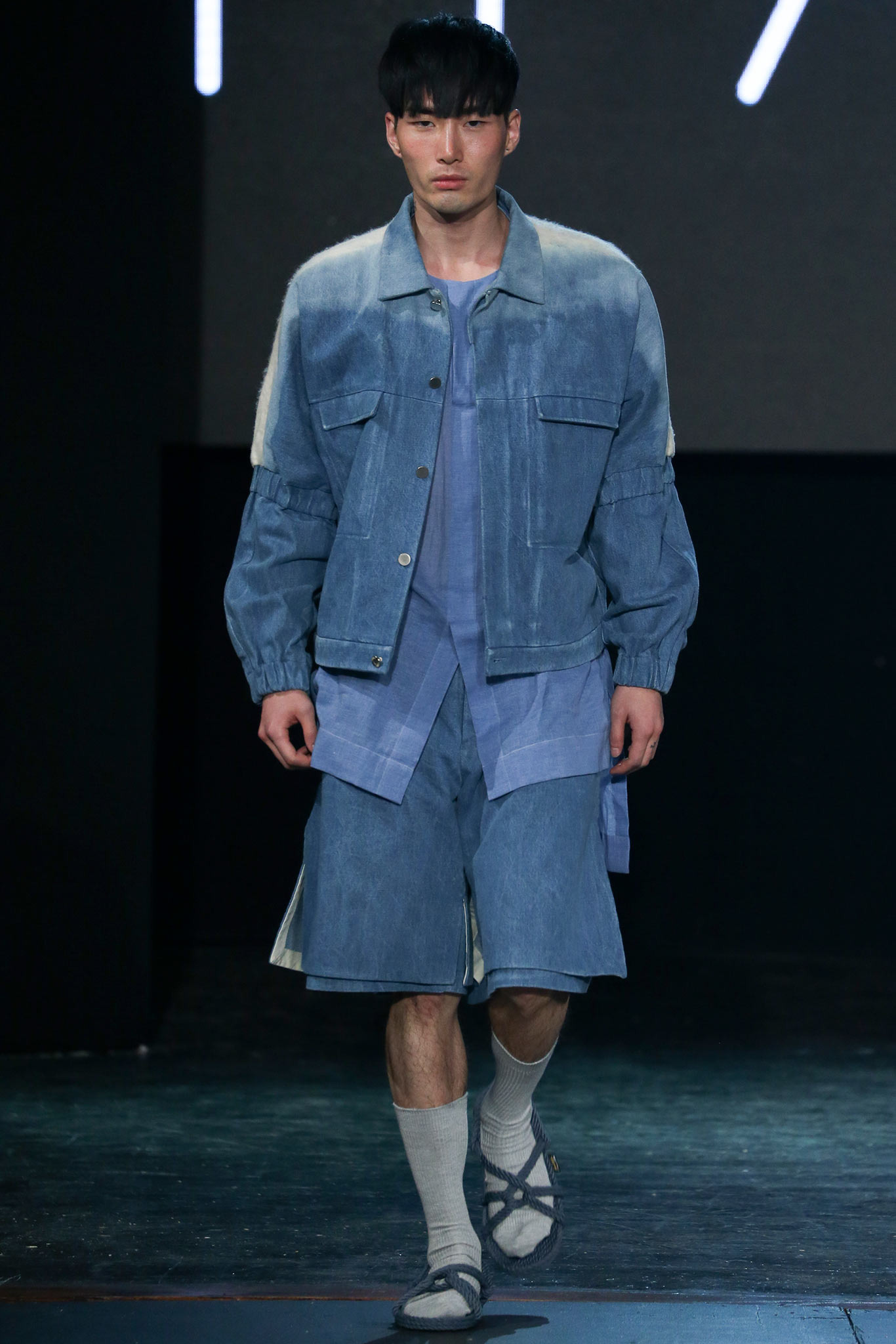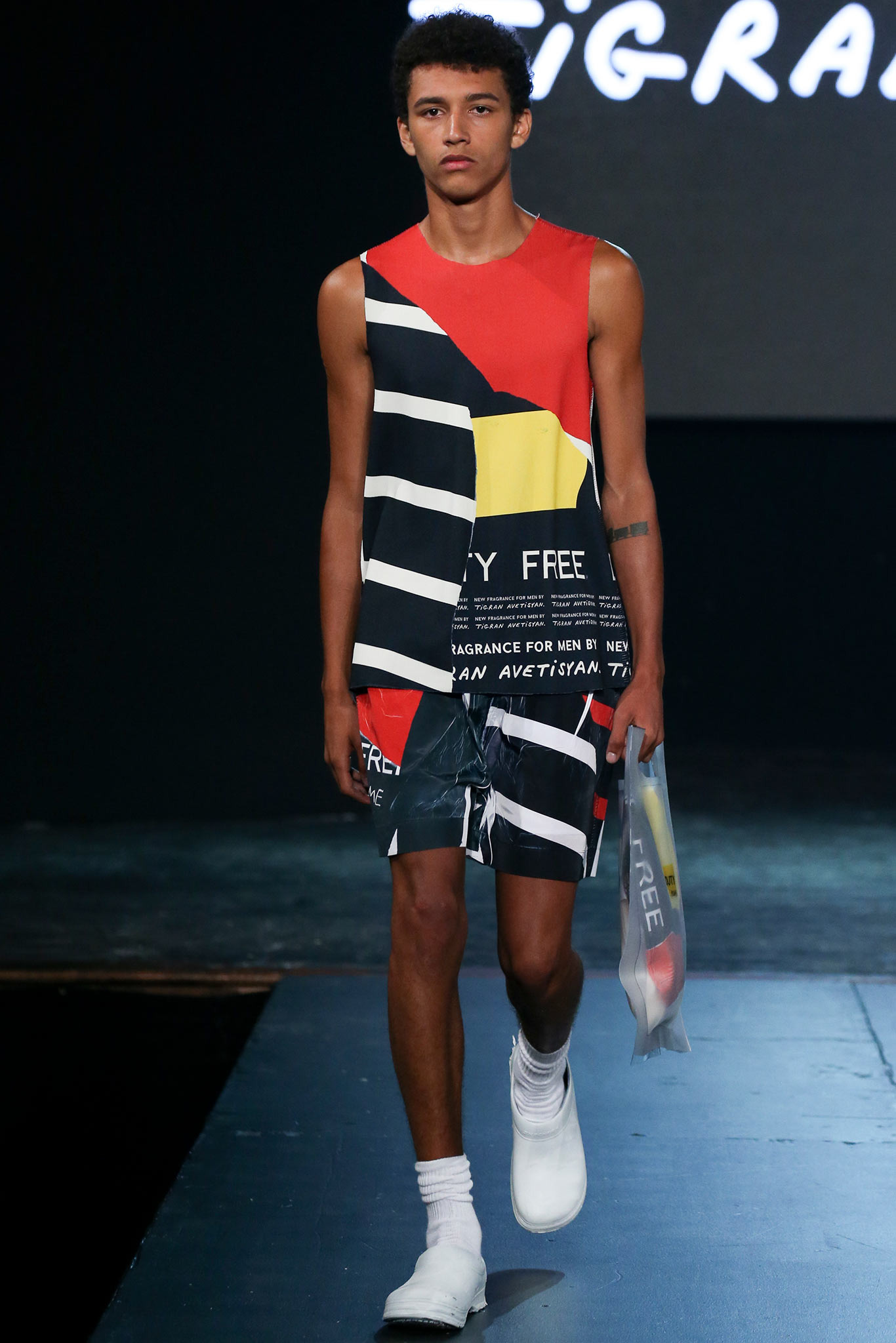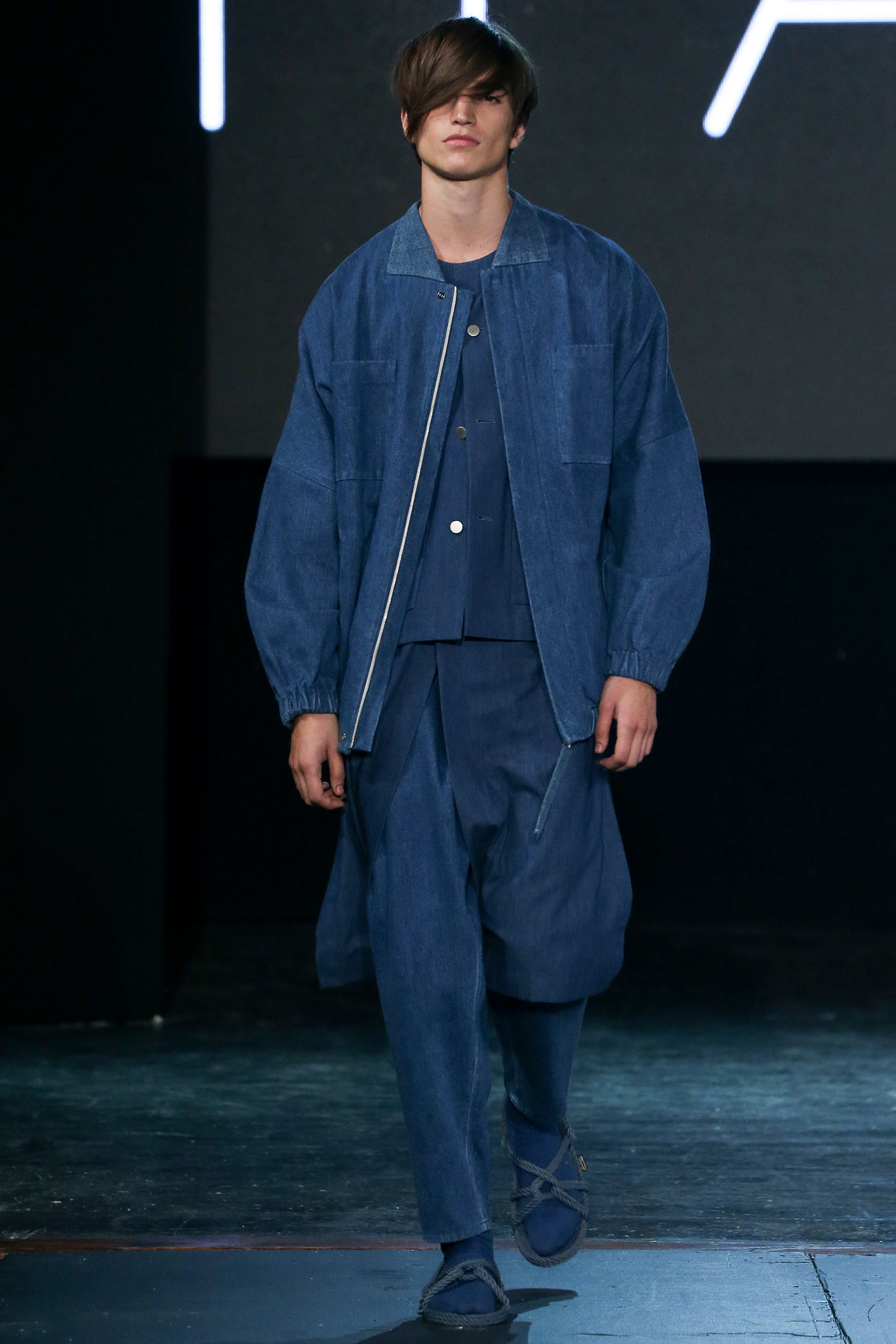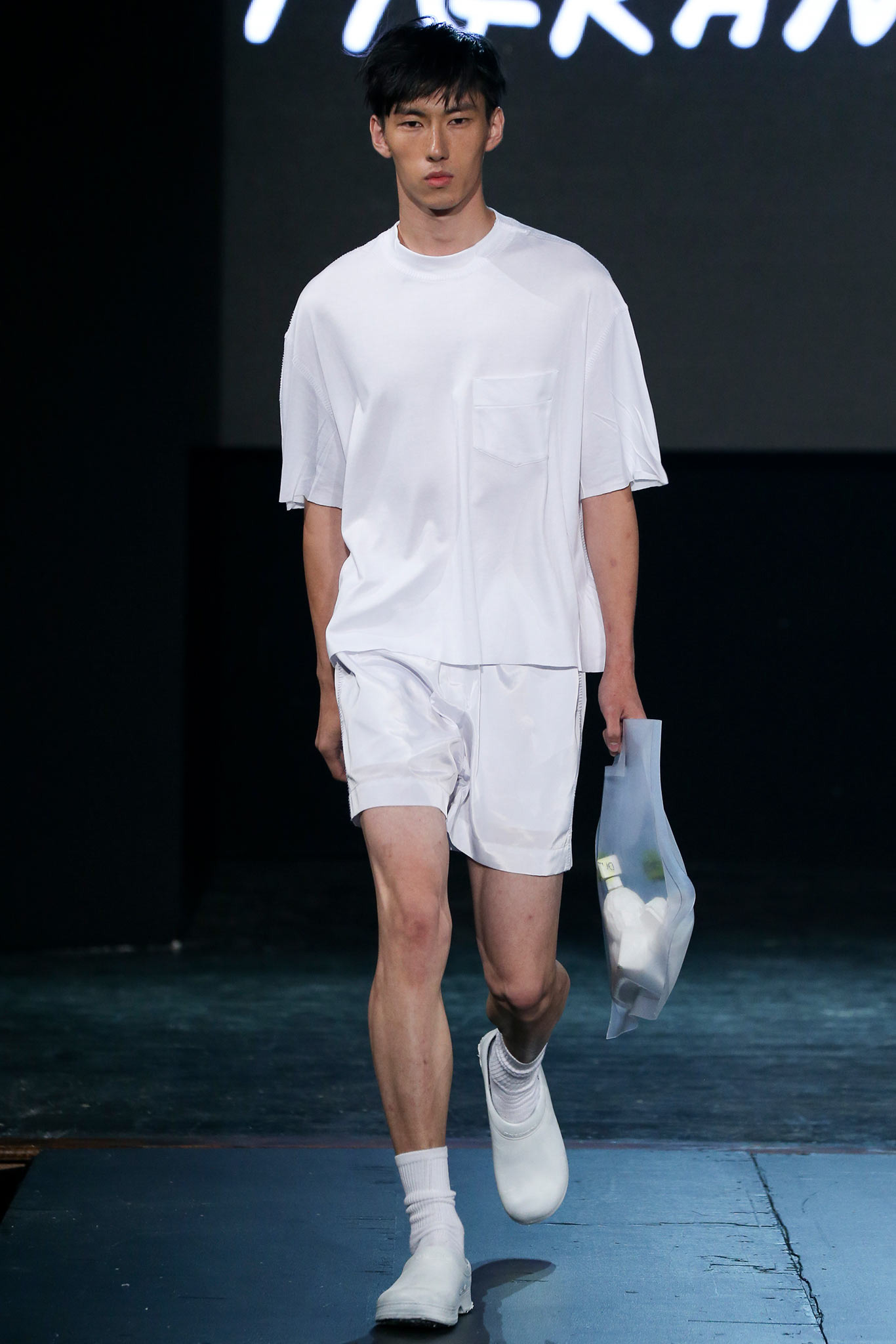 The democratic process of allowing designers anywhere to upload pictures and videos of their work to VFiles naturally favors extremes in shapes, colors, and concepts. The first and most promising of the group, Tigran Avestiyan, exhibited these in spades. The graduate of Central Saint Martins in London, who returned to his native Russia to found his label, based his collection on five actual bottles of name-brand fragrances he bought from duty-free stores in airports and fused them together into one unwieldy bottle that his models carried in clear plastic bags. They also wore tunics and shorts with a mishmash of crinkles and flashes of the words “Duty Free”—just enough to suggest cellophane packaging. The designer’s message, that of the corruptive, corrosive nature of globalism, came through loud and clear. “It’s good to be outside of fashion, seeing it from a distance,” he said with a grin backstage, quickly adding, “Not that I wouldn’t love to work in New York!” Next up was Hye Gin Hamm. Graduating from Parsons earlier this year, she drew inspiration from, she said, “a mix of American and Korean cultures,” specifically, American denim and bulky silhouettes evocative of traditional Korean monks. Careful hand-bleaching of each oversized and layered item gave the collection an alluringly timeless, placeless quality. Showings by ZDDZ’s Dasha Selyanova, another Russian, and Detto Kazuma of D.TT.K, both of whom produced highly graphic, slightly athletic collections, rounded out the very international showcase. Given the excellent IRL platform of VFiles, which is only a year old, it’ll be interesting to see how these young hopefuls matriculate through the global fashion system. “It was challenging to choose four designers out of the hundreds who entered,” said founder Julie Anne Quay, “but we work closely with our community and mentors [to look] for a point of view, salability, quality, and that’s something special.” |
