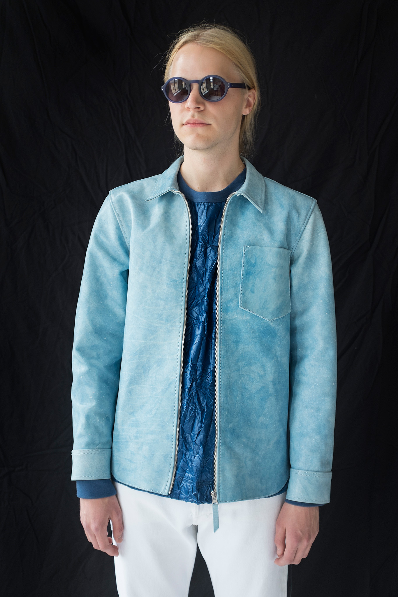 This season the brand found new ways to reduce uniform pieces to their most basic concepts, then tweak them in unexpected ways. Most noteworthy was the inventive approach to fabric—a leather shirt, stiff enough to stand on its own, was indigo dyed so that it brought to mind tropical seawater; coated linen gave basic suiting an out-of-the-ordinary feel; and textured nylon was tie-dyed to look like an oil slick and cut into boxy outerwear. Traces of the earth’s creative (and destructive) power could be found throughout the collection. Double-layer linen was distressed to resemble cracked earth. Pure raw silk gave a soft, mossy feel to shirting. Synthetic outerwear pieces were permanently crinkled into glacial forms. Prints looked scorched and rust stained.