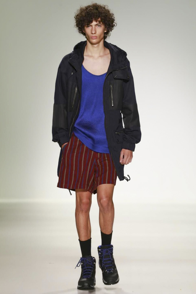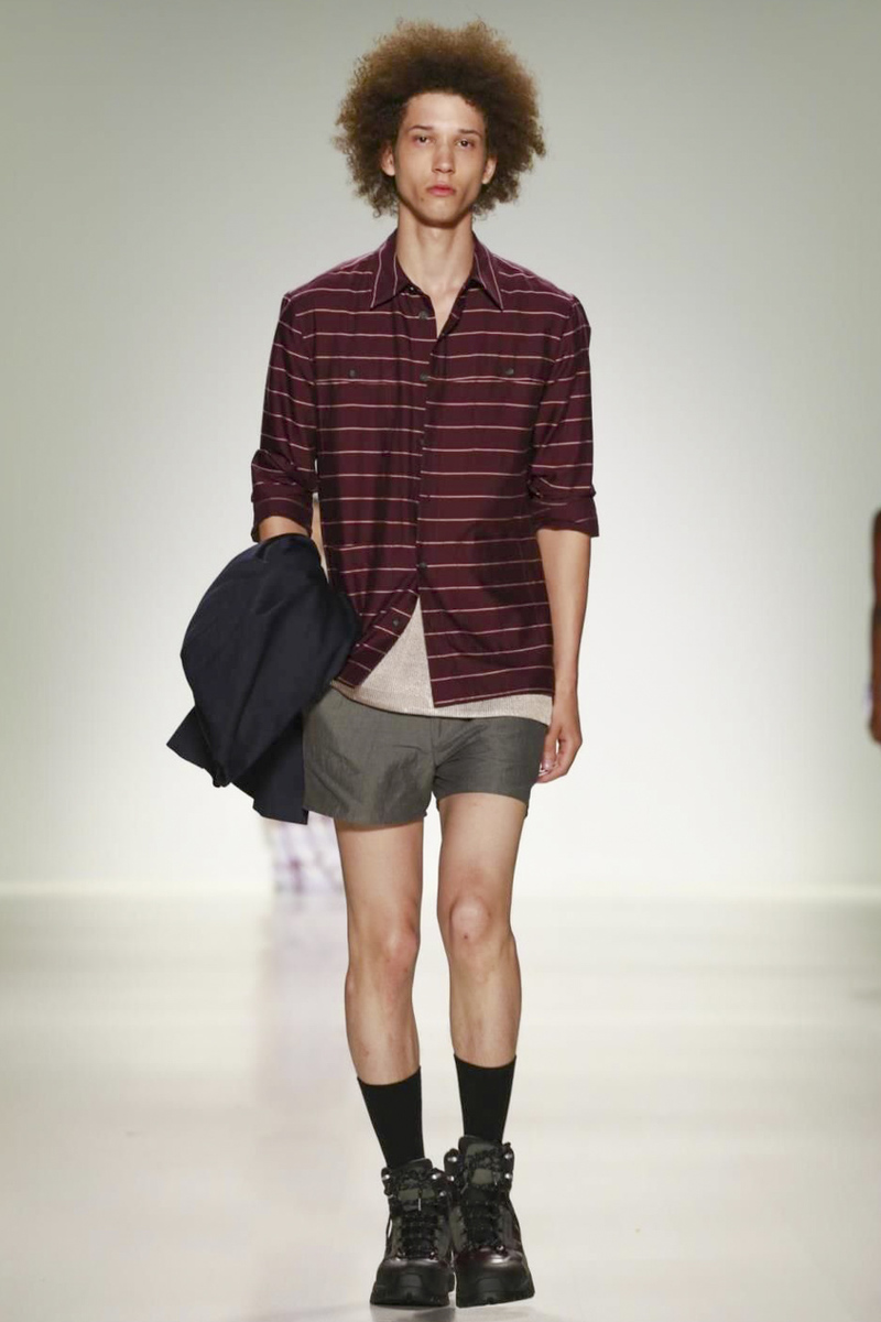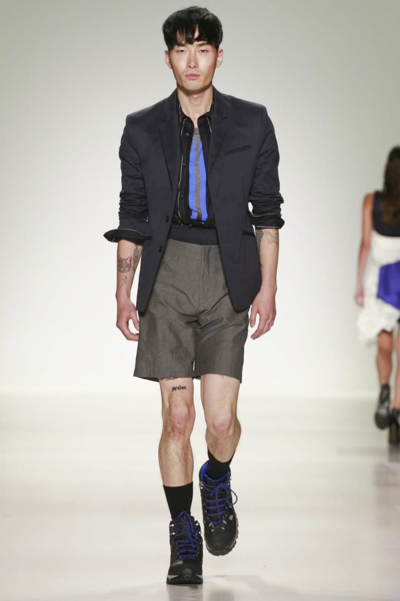 Richard Chai’s men’s portion, expanded for spring, looked stronger than the women’s primarily because his signature athletic and streetwear references were well-executed and very on-trend. Bonus: Chai broke with tradition through his modern use of prints, bold stripes and paneling elements on shirts, shorts and jackets. And in a collaboration with Timberland, hiking boot-sneaker hybrids empowered the overall look.