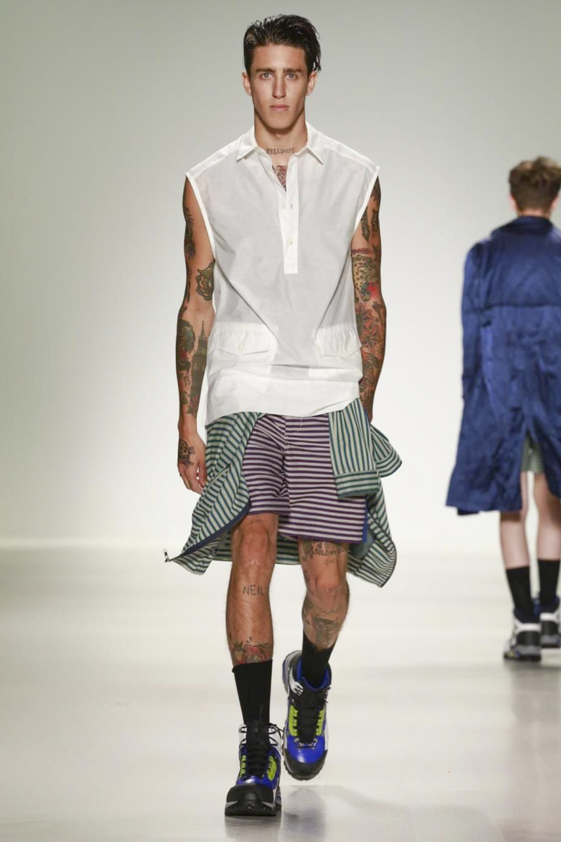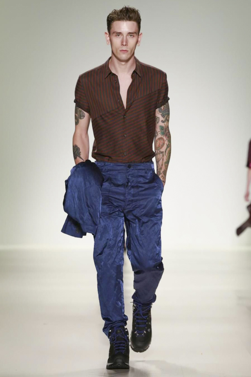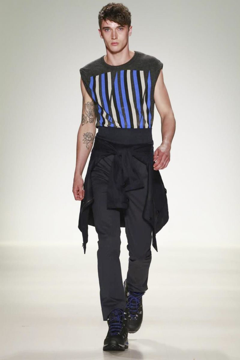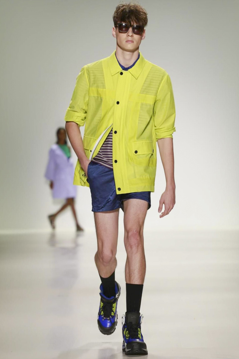Richard Chai’s men’s portion, expanded for spring, looked stronger than the women’s primarily because his signature athletic and streetwear references were well-executed and very on-trend. Bonus: Chai broke with tradition through his modern use of prints, bold stripes and paneling elements on shirts, shorts and jackets. And in a collaboration with Timberland, hiking boot-sneaker hybrids empowered the overall look.