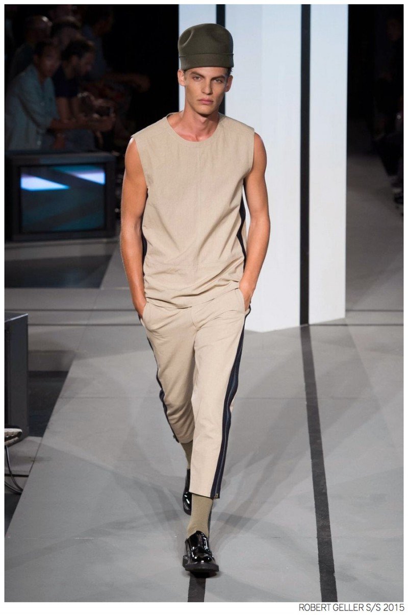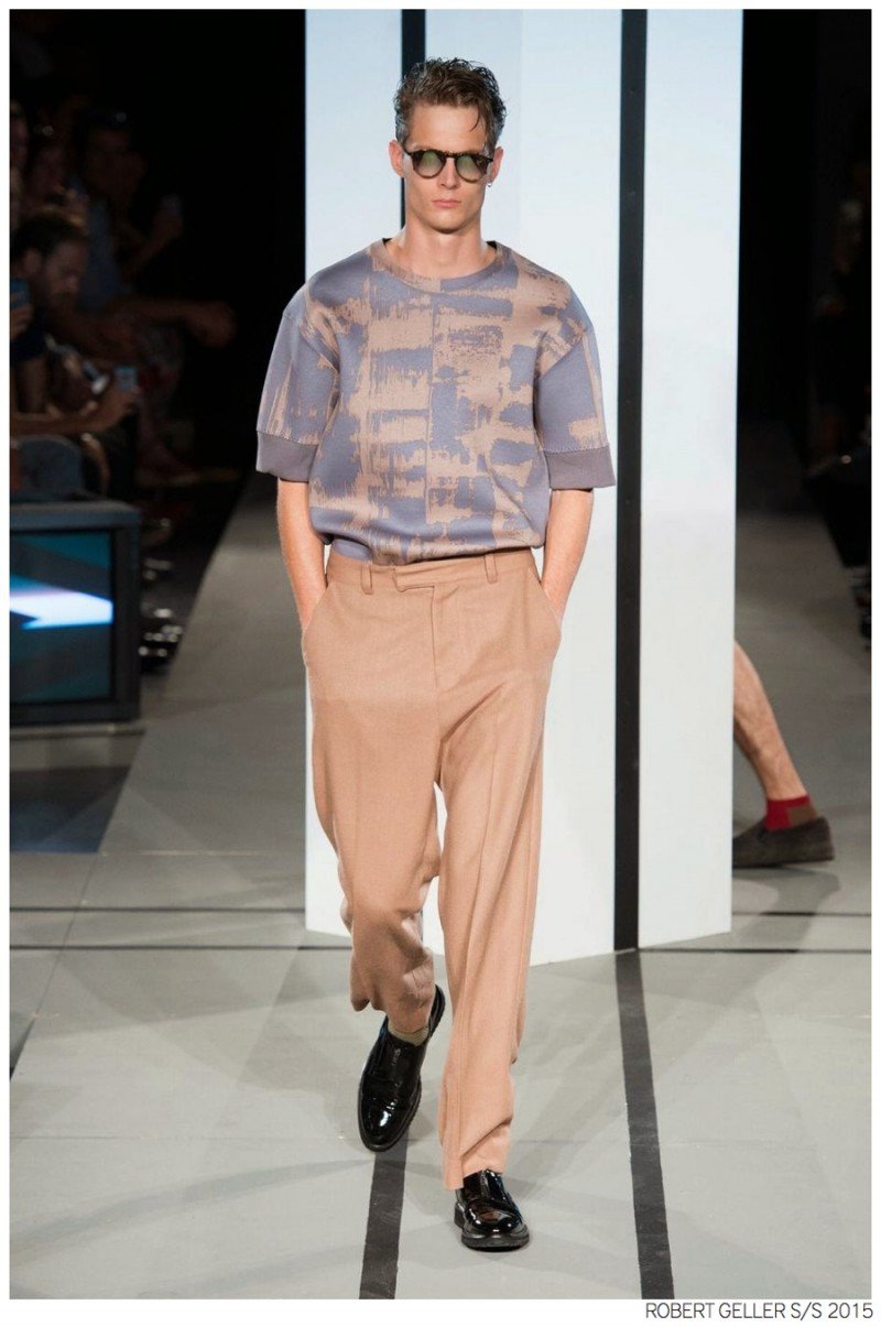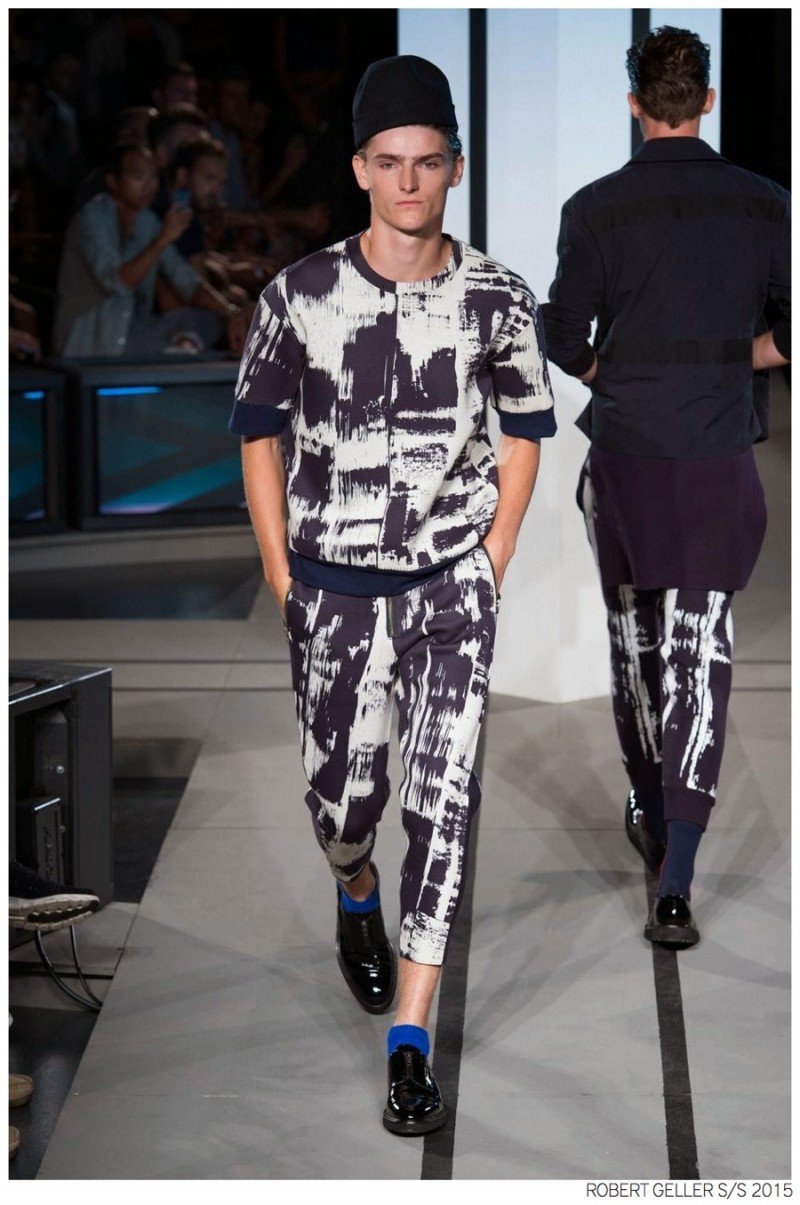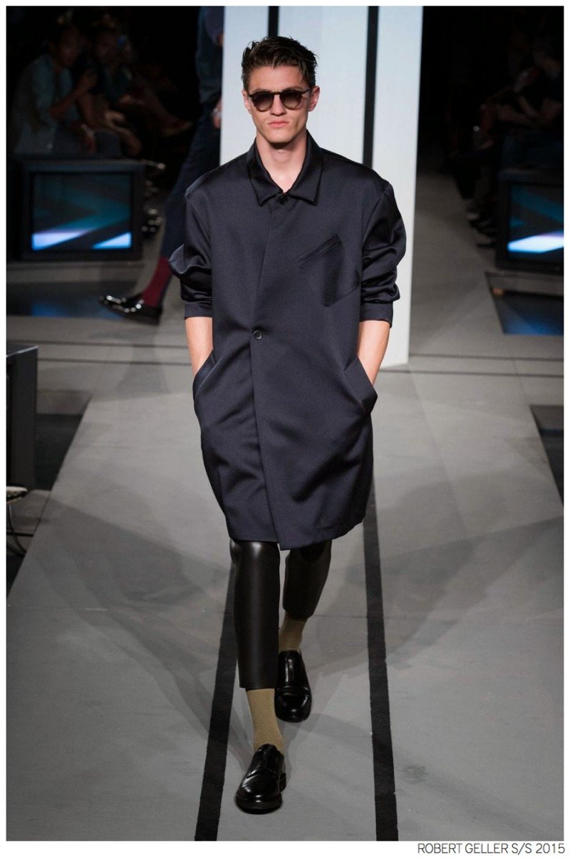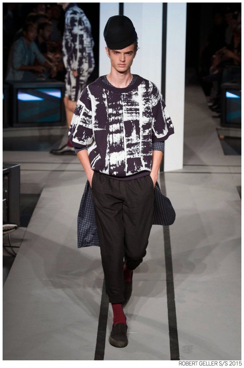 When it comes to the Robert Geller man, style is laid-back and simple is a positive but don’t mistake that philosophy for boring. For spring 2015, Geller reworked menswear essentials with elongated lengths and loose, slouchy fits. Minimal tops found their match in sleek long coats, while relaxed t-shirts were given a new life with engaging prints. Meanwhile, joggers and bomber jackets were included as part of the contemporary mix that has become an everyday staple for the modern man. Rounded out by cropped semi-lean trousers, sleeveless tops, lightweight knitwear and more, Geller delivered a collection that was both aspirational and applicable to the real world.