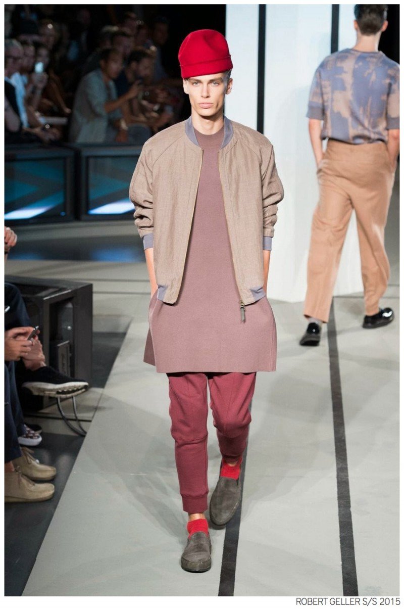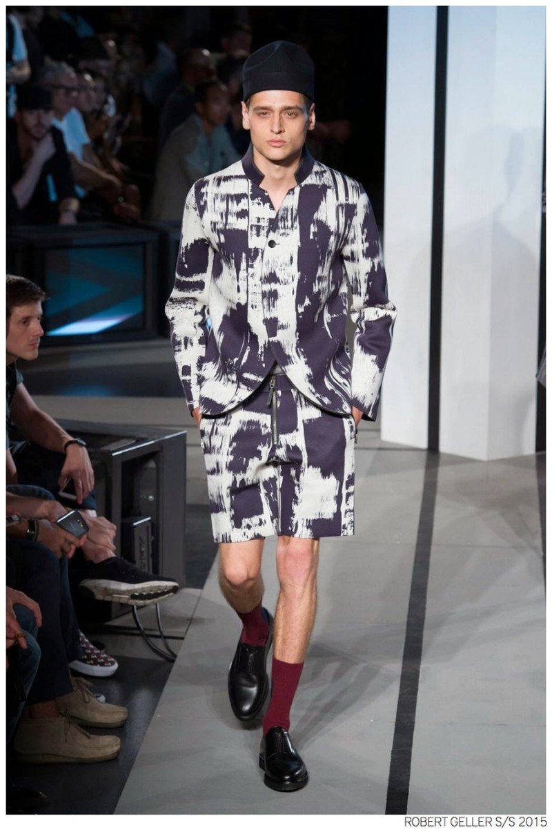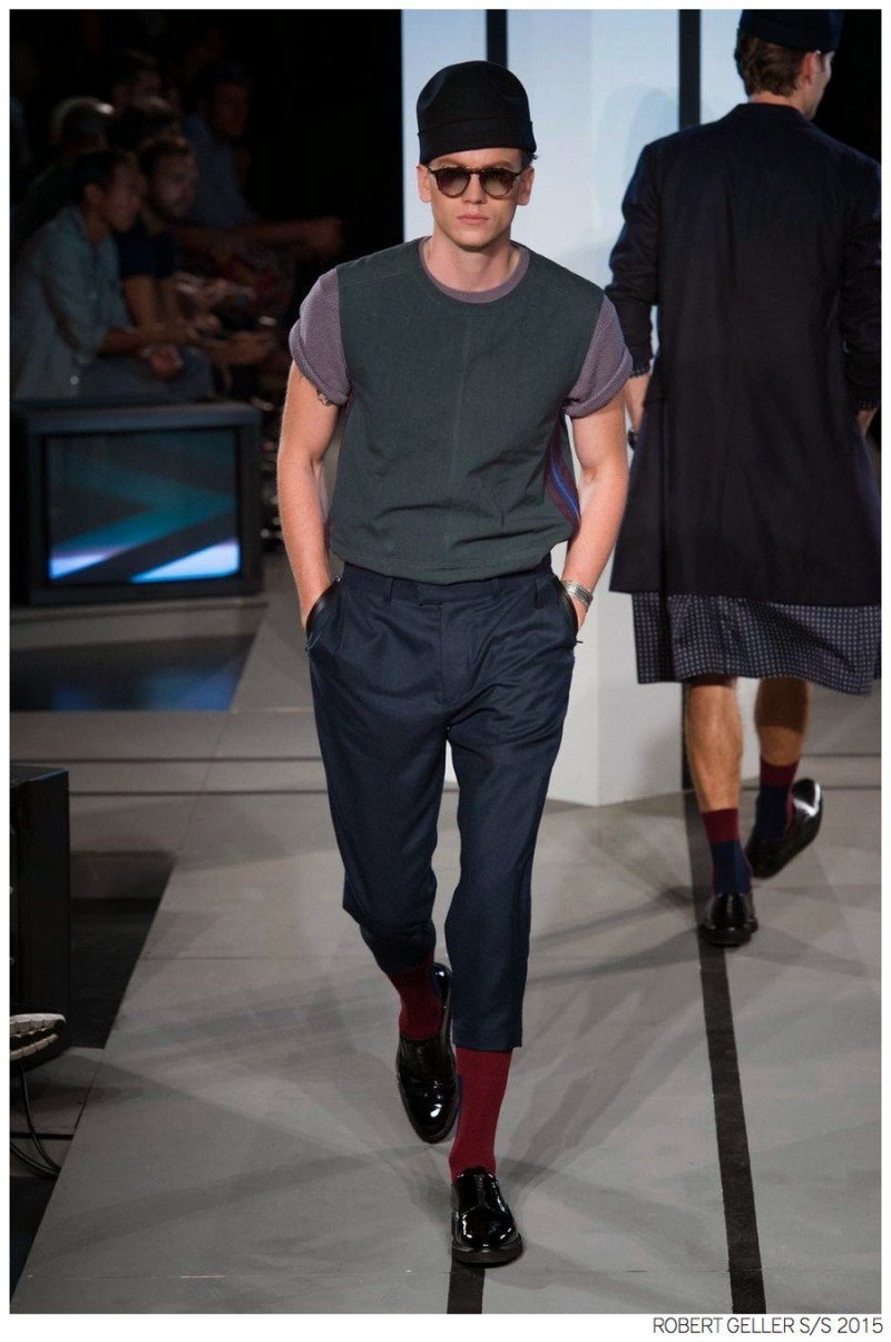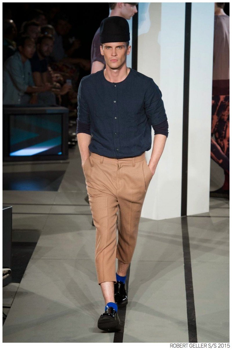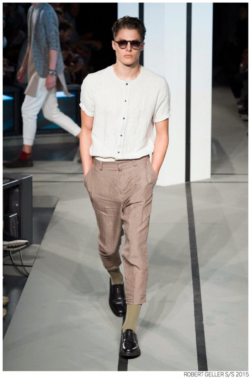 When it comes to the Robert Geller man, style is laid-back and simple is a positive but don’t mistake that philosophy for boring. For spring 2015, Geller reworked menswear essentials with elongated lengths and loose, slouchy fits. Minimal tops found their match in sleek long coats, while relaxed t-shirts were given a new life with engaging prints. Meanwhile, joggers and bomber jackets were included as part of the contemporary mix that has become an everyday staple for the modern man. Rounded out by cropped semi-lean trousers, sleeveless tops, lightweight knitwear and more, Geller delivered a collection that was both aspirational and applicable to the real world.