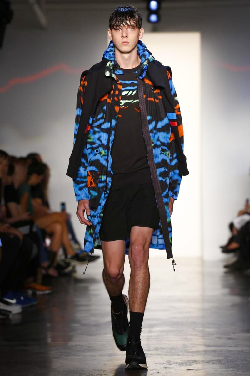 Tim Coppens has never shied away from his sporty leanings, each season refining his man’s easygoing sense of style. Balancing tailoring and comfort, Coppens’ design aesthetic evolves for spring 2015, formalizing a casual attitude with certain quirks. Creating a uniform of relaxed garments that still maintain sharp lines, the collection unveils draped sweatshirts, color blocked bomber jackets, slouchy tanks and other laid-back essentials. For this season’s prints, the etchings of parrots dress coats, jackets, layered shirts and lean trousers, rounding out a strong decisive outing.