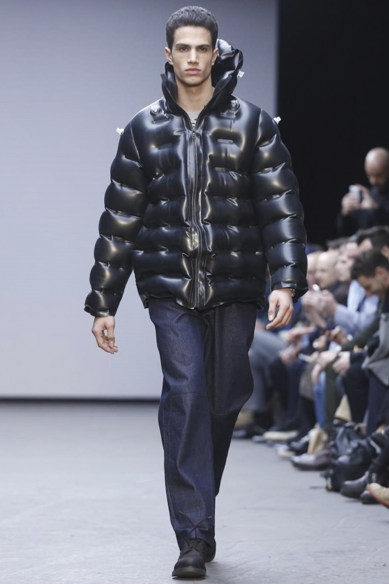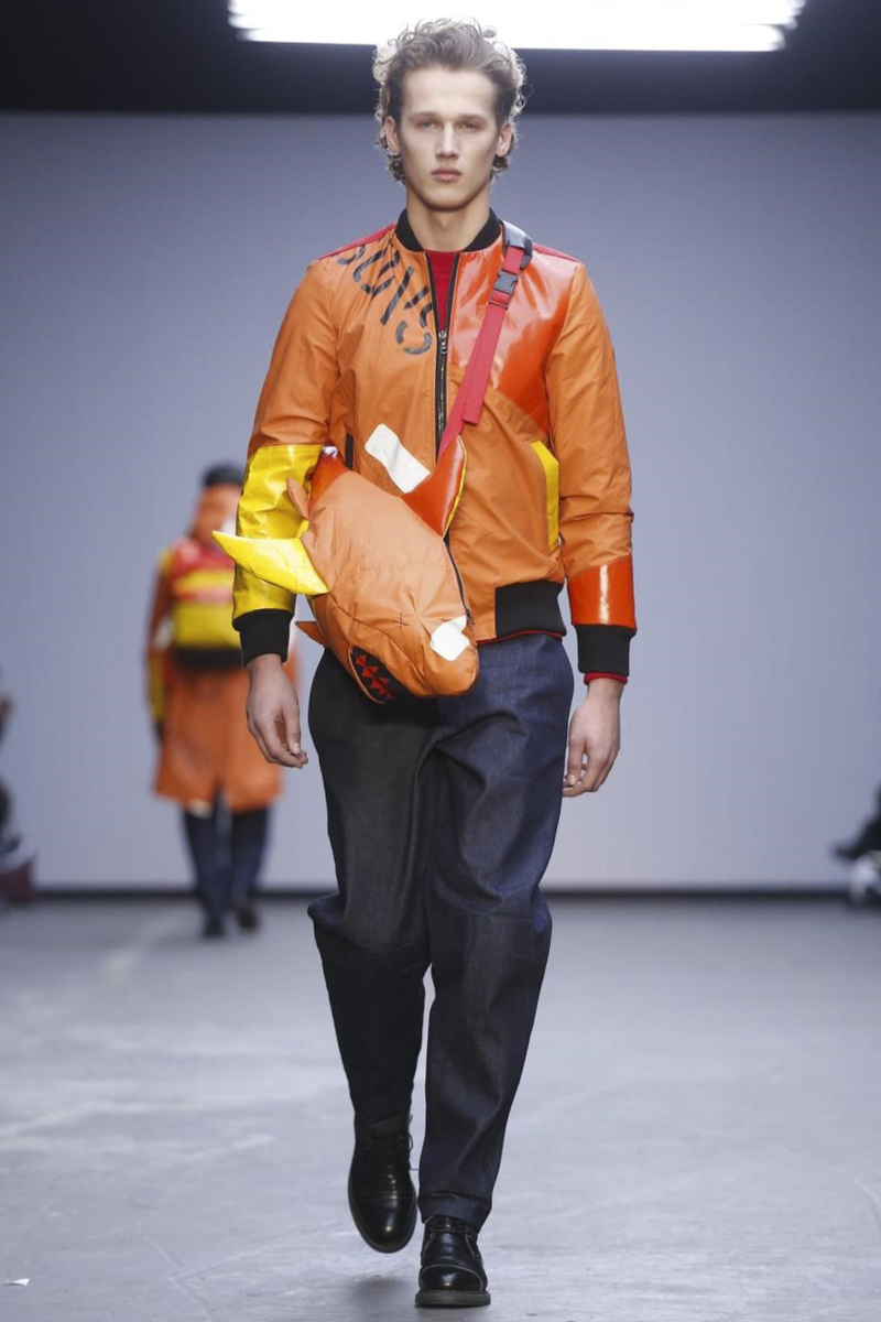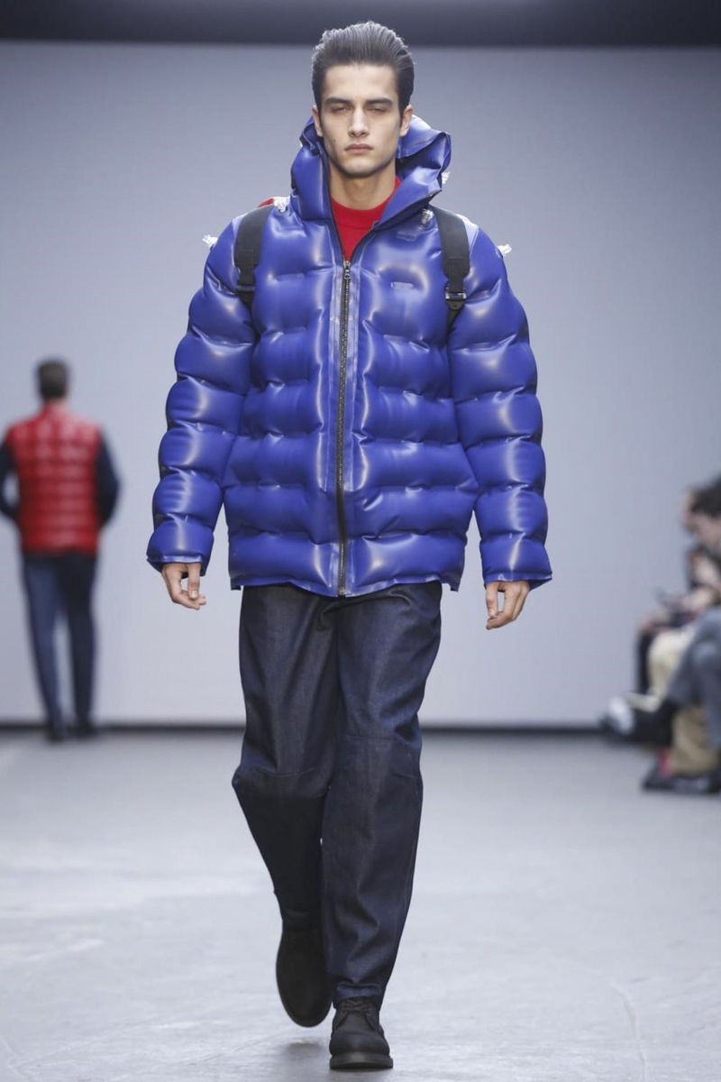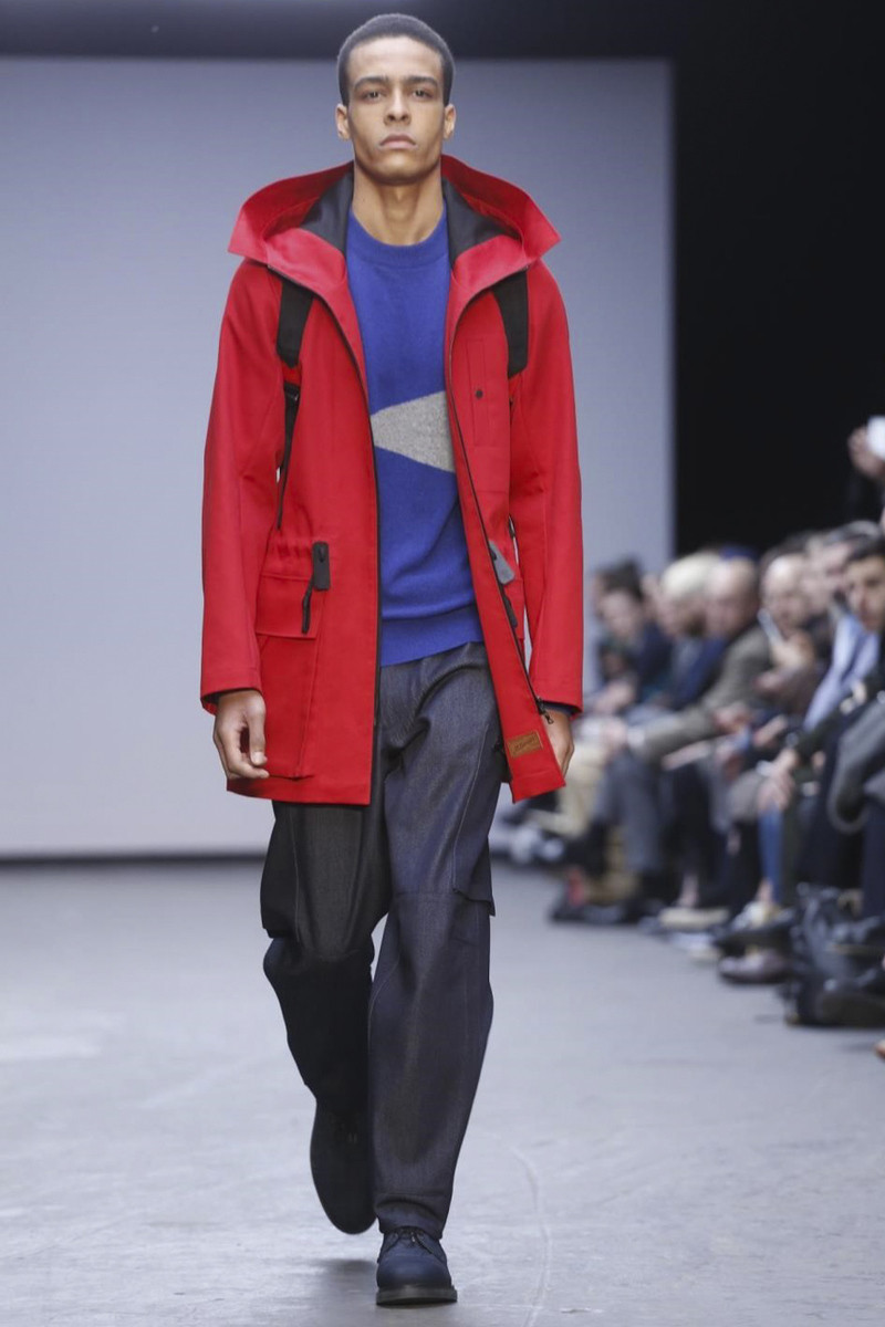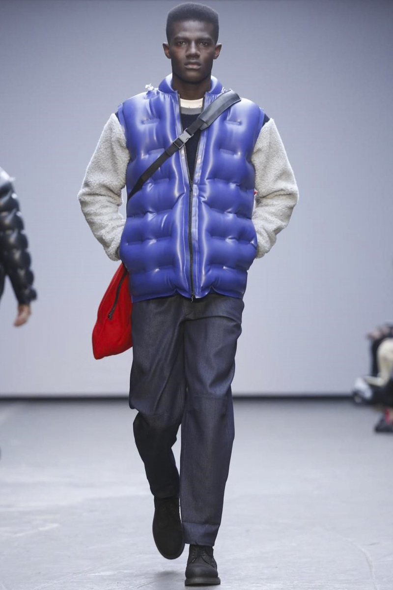 Vibrant colors on synthetic materials are materialized by the collection with sports air of Christopher Raeburn Fall/Winter 2015 during the London Collections: MEN, jackets and inflatable vests, wide leg pants and prints in solid colors.
