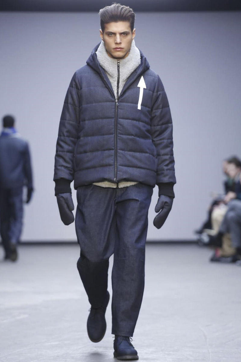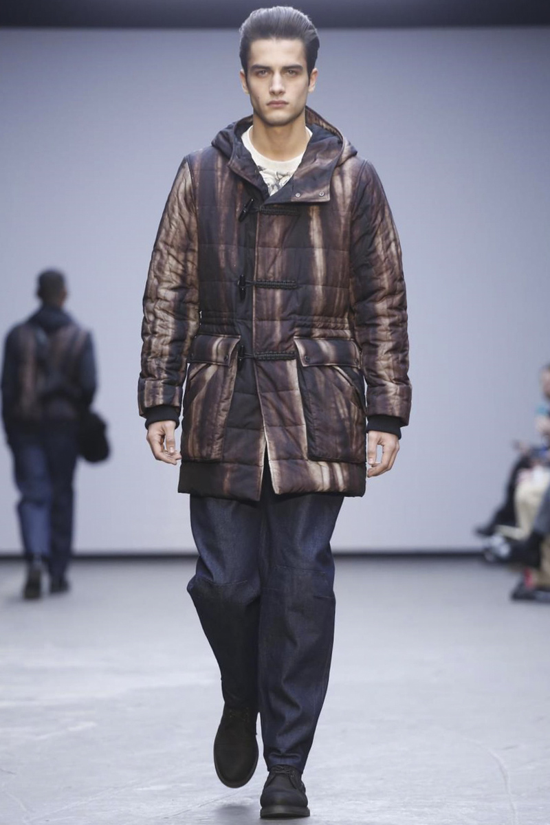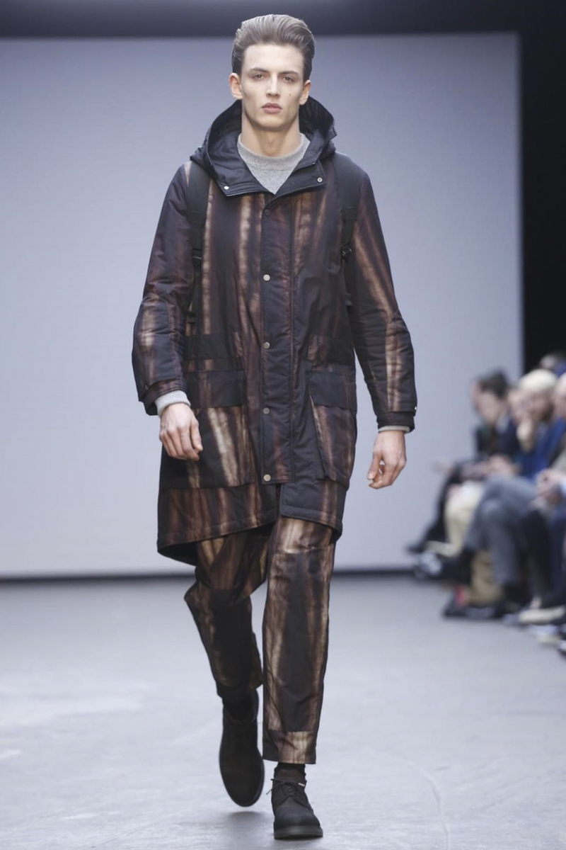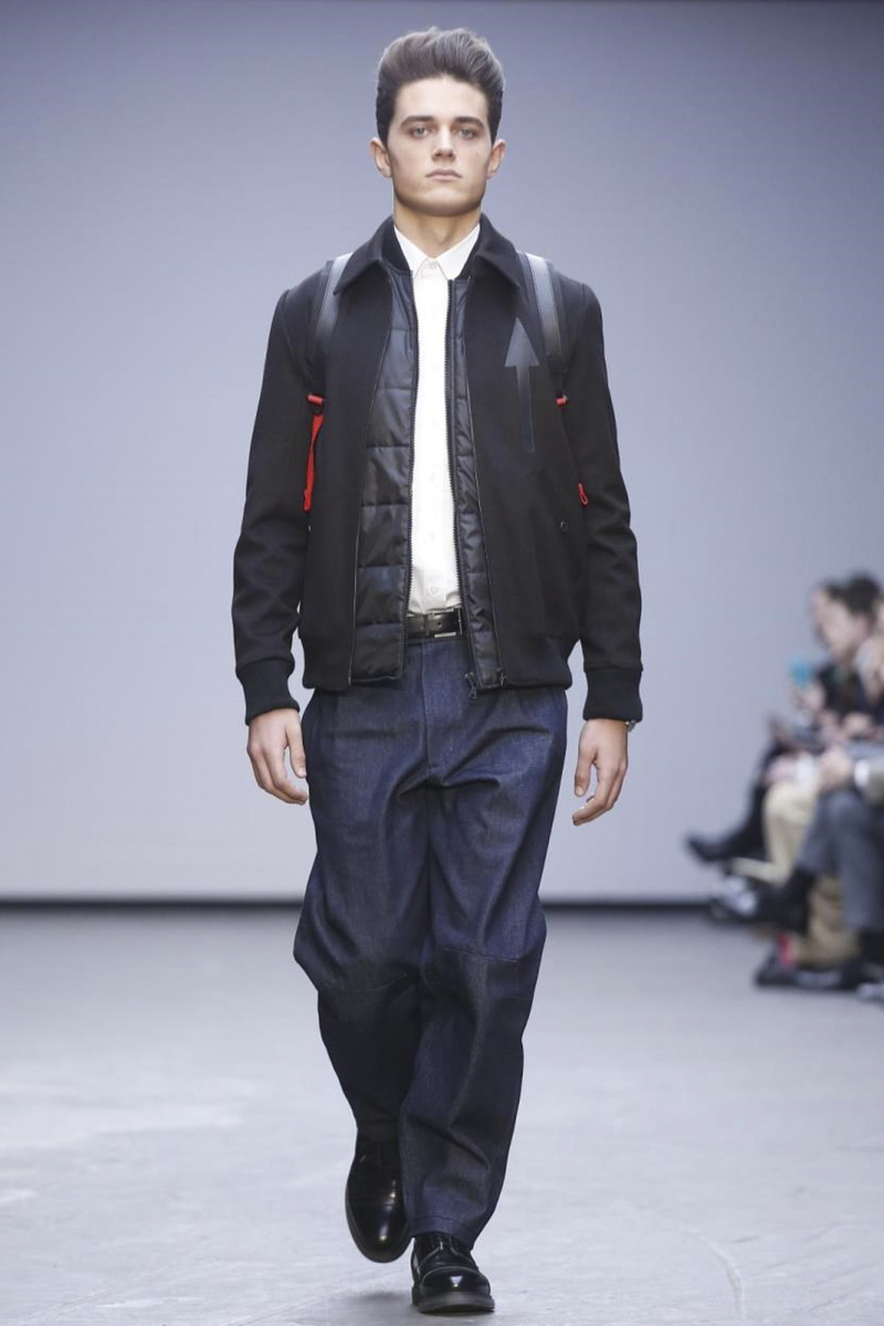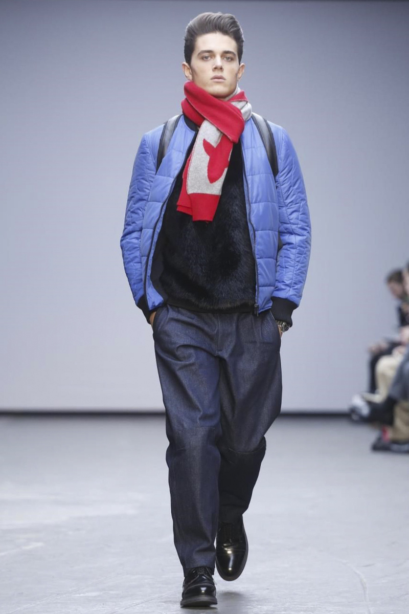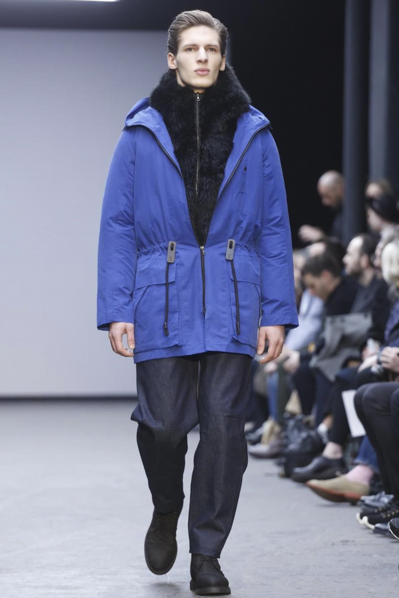 Vibrant colors on synthetic materials are materialized by the collection with sports air of Christopher Raeburn Fall/Winter 2015 during the London Collections: MEN, jackets and inflatable vests, wide leg pants and prints in solid colors.