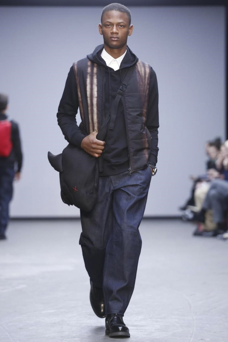 Vibrant colors on synthetic materials are materialized by the collection with sports air of Christopher Raeburn Fall/Winter 2015 during the London Collections: MEN, jackets and inflatable vests, wide leg pants and prints in solid colors.