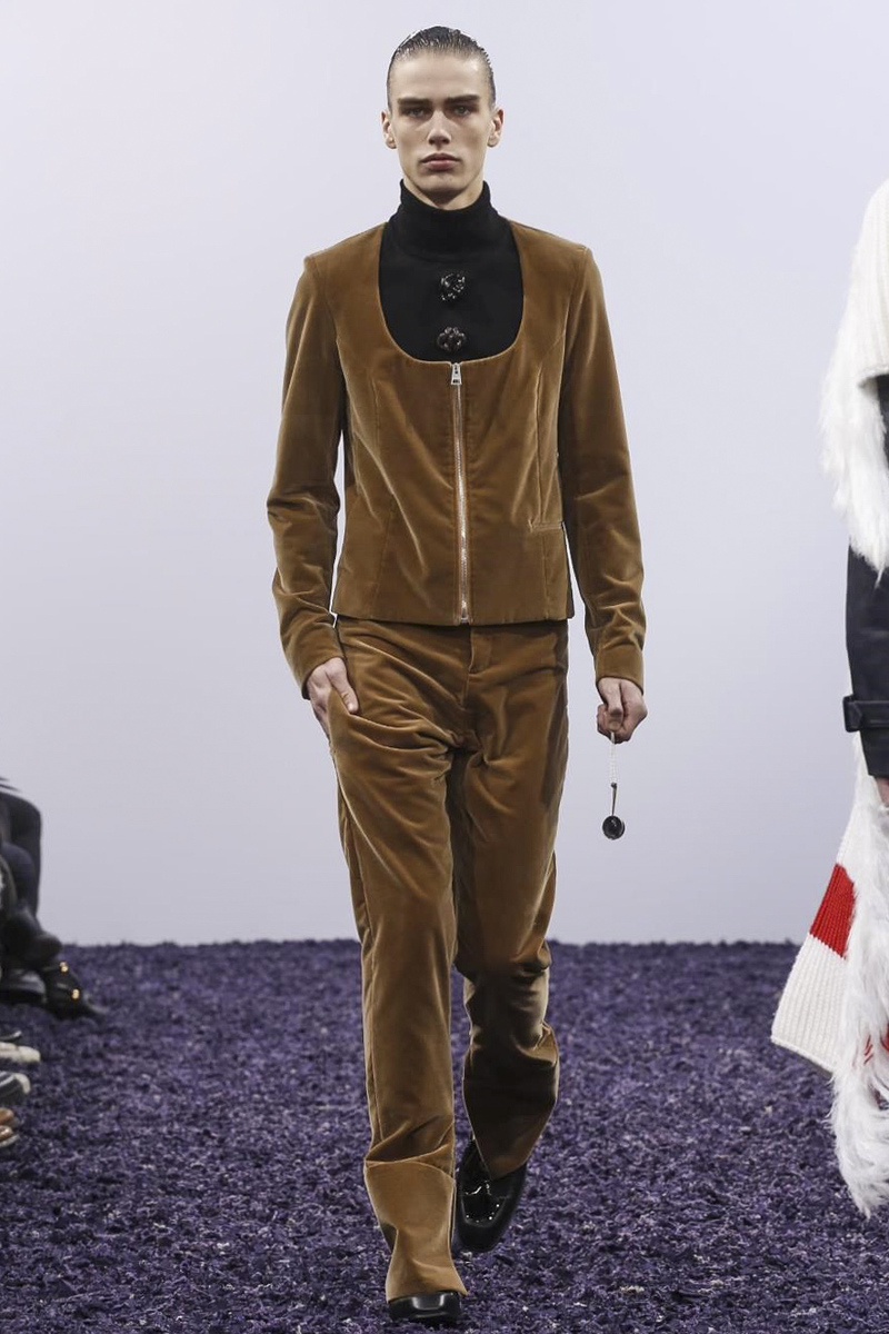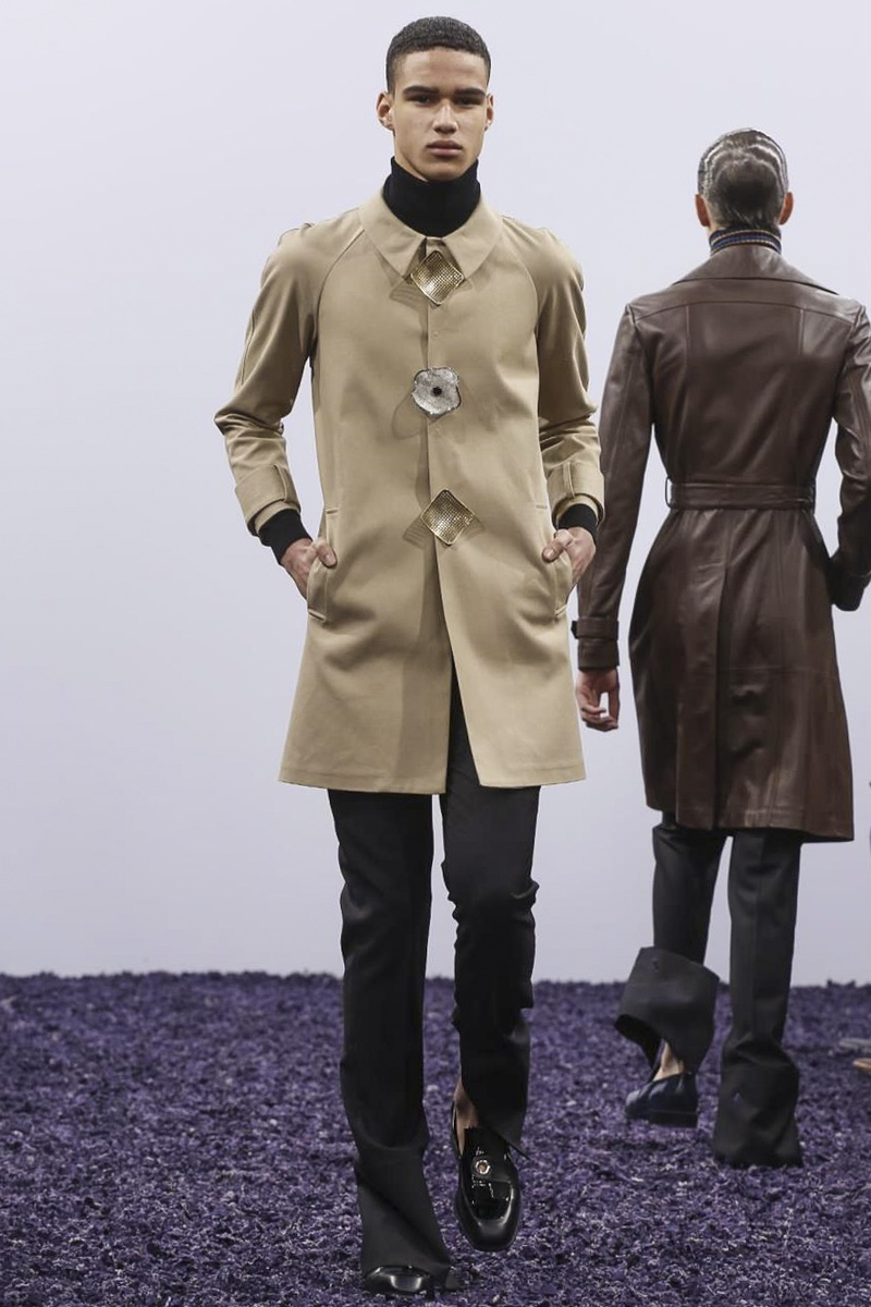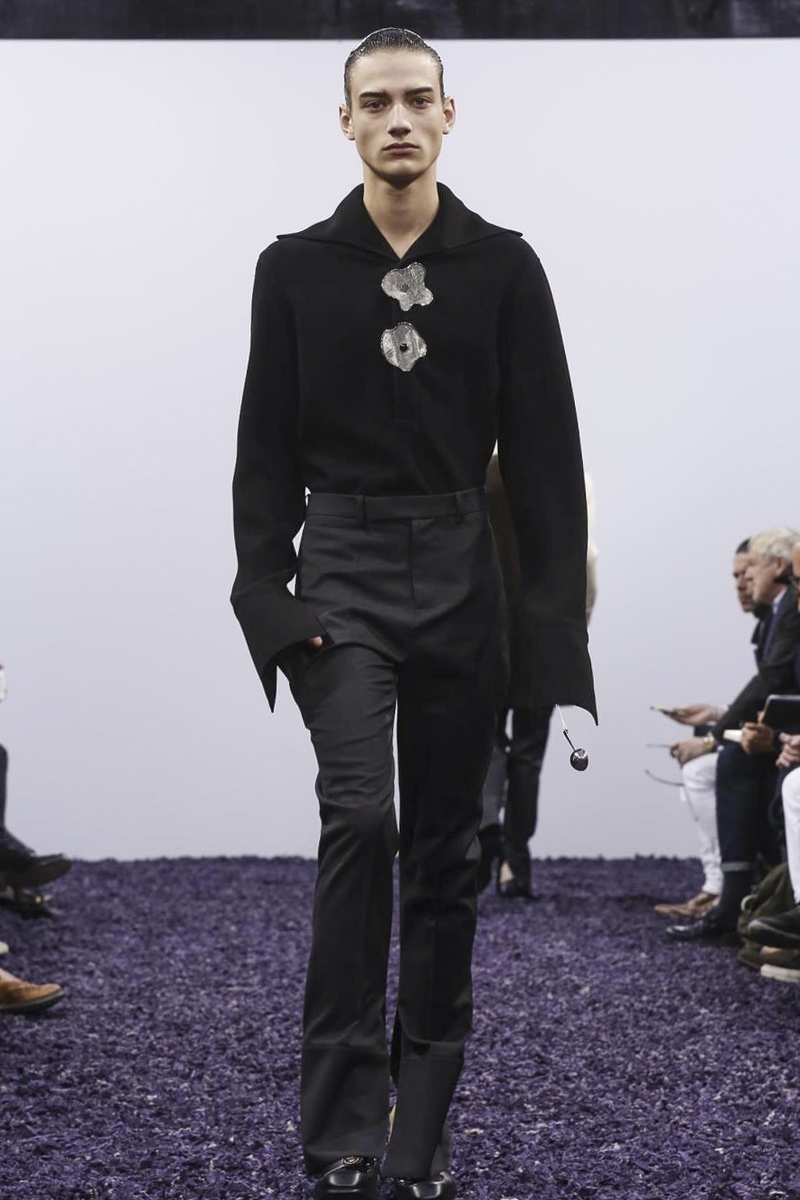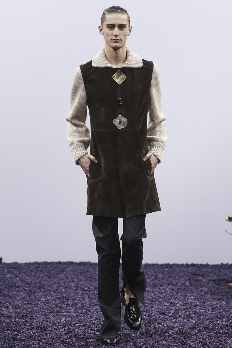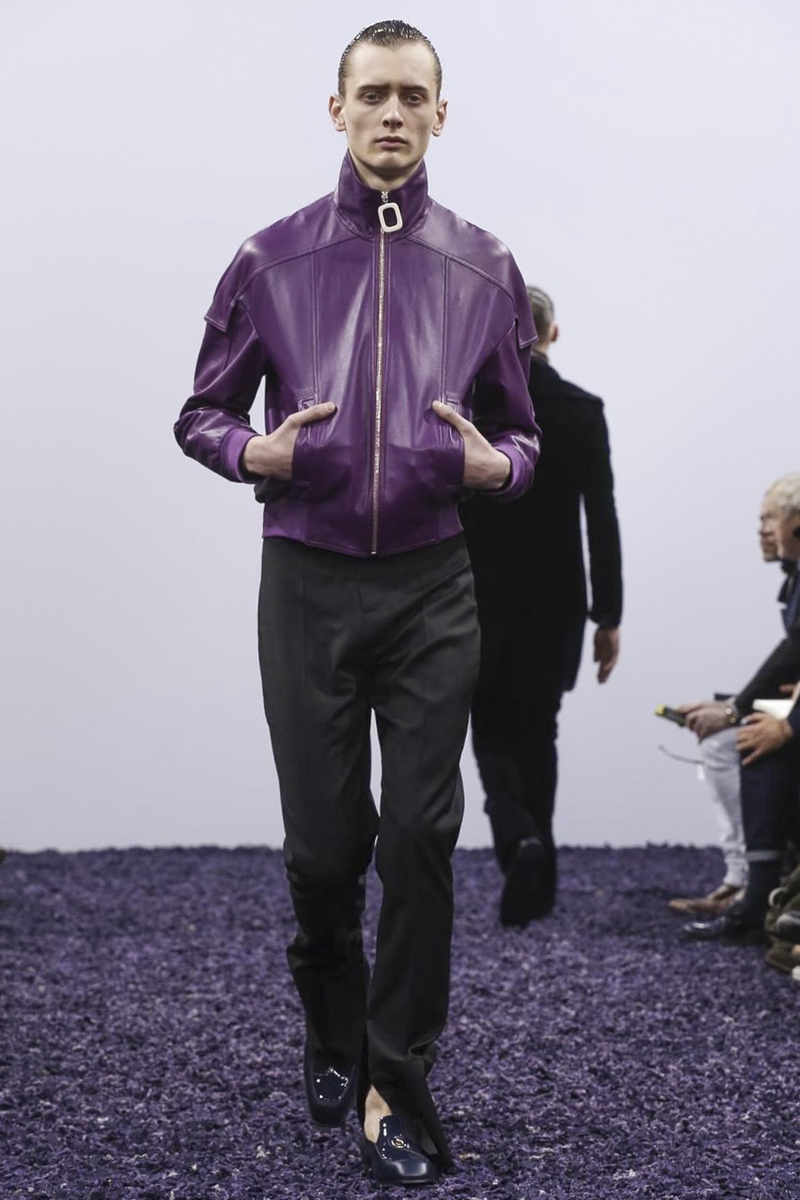 J.W. Anderson’s F/W 2015, home base at the Yeomanry House was laden with a violet crystal-like tapestry made of recycled tires, hinting at the post-apocalyptic show that was about to ensue. Ray Bradbury’s “There will come soft rains” immediately rang to mind depicting a world brought to ruins by Man. In a chat backstage, Anderson mentioned that the “idea felt a little bit apocalyptic…a bit George Orwell”, highlighting the poem that opened the show. Anderson switched his usual Ratatat-style discordant track for a recording of “The Imperfect List” by Big Hard Excellent Fish narrated by Josie Jones — the chilling sobering track that used to open every Morrissey concert. The words to the poem read, “scouse impersonator. silly pathetic girlies. silly pathetic woman. macho dickhead. Bonnie langford. neighbours. lost keys. phoney friend. ungrateful accusing mate. the royal family. stock aitken & waterman. smiling judas.”