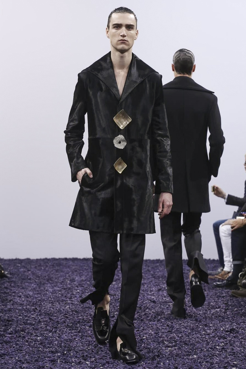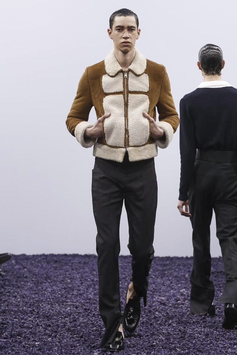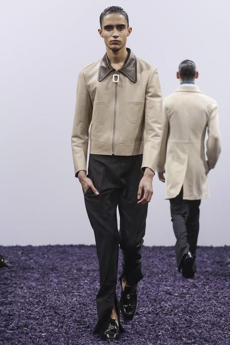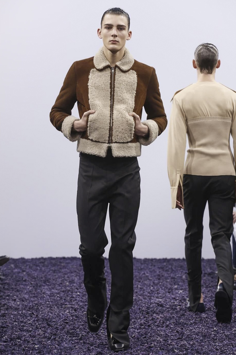 J.W. Anderson’s F/W 2015, home base at the Yeomanry House was laden with a violet crystal-like tapestry made of recycled tires, hinting at the post-apocalyptic show that was about to ensue. Ray Bradbury’s “There will come soft rains” immediately rang to mind depicting a world brought to ruins by Man. In a chat backstage, Anderson mentioned that the “idea felt a little bit apocalyptic…a bit George Orwell”, highlighting the poem that opened the show. Anderson switched his usual Ratatat-style discordant track for a recording of “The Imperfect List” by Big Hard Excellent Fish narrated by Josie Jones — the chilling sobering track that used to open every Morrissey concert. The words to the poem read, “scouse impersonator. silly pathetic girlies. silly pathetic woman. macho dickhead. Bonnie langford. neighbours. lost keys. phoney friend. ungrateful accusing mate. the royal family. stock aitken & waterman. smiling judas.”
