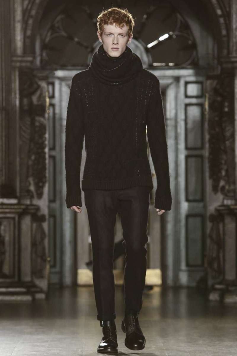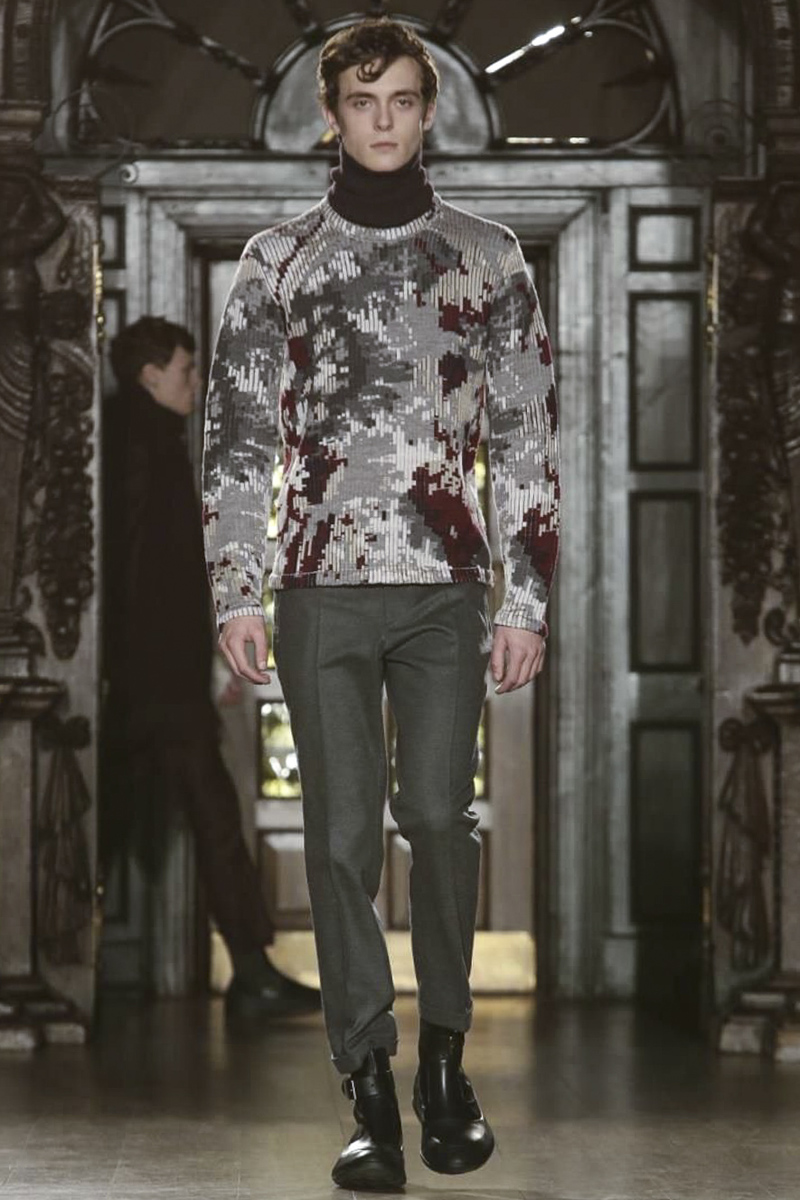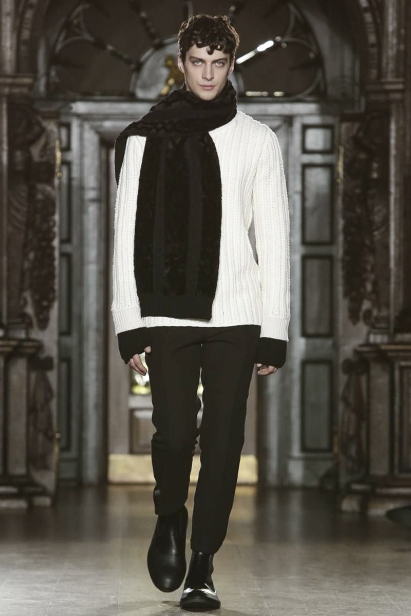 That seemed to be the message at today’s Pringle of Scotland show, held to celebrate the label’s 200th anniversary. There was an element of back-to-roots simplicity about the collection as a whole, with charcoal, black and white ribbed knits dominating the lineup. As ever, there was plenty of interest in the fabrication, whether in panels of contrast-knit technique and texture, or on more dramatic inversions like soft-structured coats which sprouted chunky Aran detailing. There were plenty of subtler touches, too, from tartan patterns woven from planes of contrasting matt and gloss to greyscale interpretations of the house’s pastel-twee Argyll print. And thrown into the mix was a worn, pixilated carpet-floral knit which offered an elegant nod to the label’s long history — a history which has run from humble homespun roots through Victorian wealth, Fifties glamour, Eighties golf-pro naffness and provocative Noughties reinventions. There’s been a lot of swerves in direction over the label’s two centuries. What was impressive, looking at today’s show, was that Pringle had managed to unite so many disparate, diverging facets of the label into something with confident, unforced coherence.