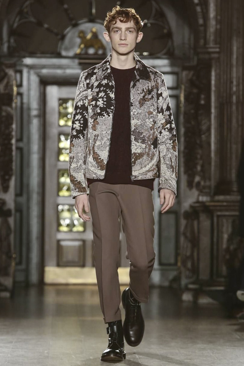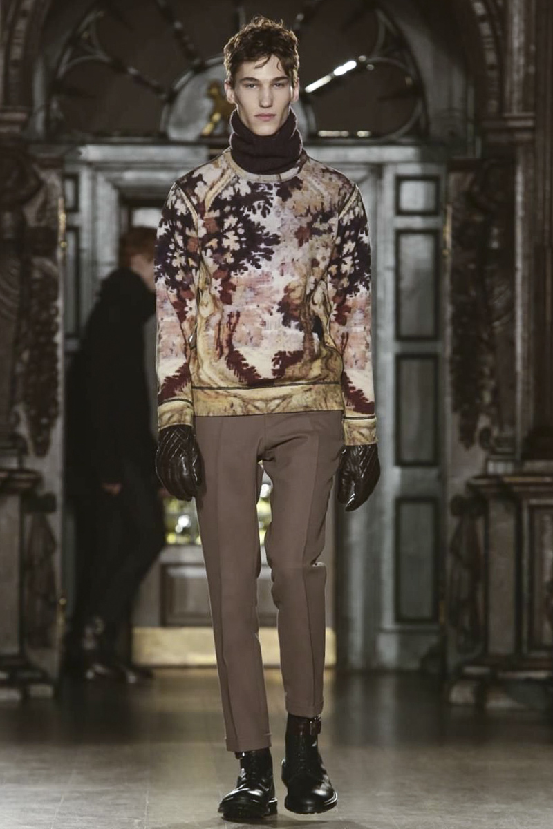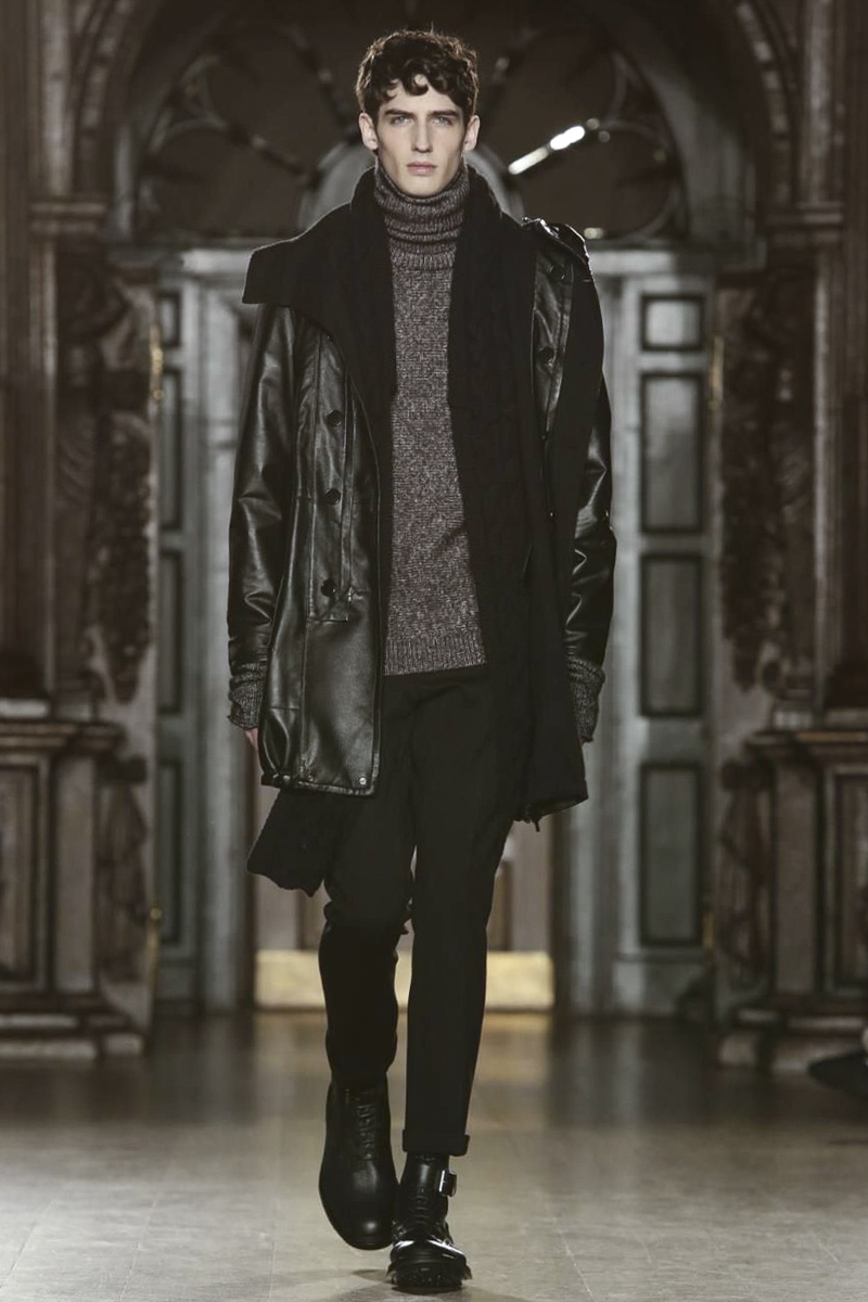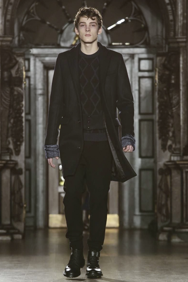 That seemed to be the message at today’s Pringle of Scotland show, held to celebrate the label’s 200th anniversary. There was an element of back-to-roots simplicity about the collection as a whole, with charcoal, black and white ribbed knits dominating the lineup. As ever, there was plenty of interest in the fabrication, whether in panels of contrast-knit technique and texture, or on more dramatic inversions like soft-structured coats which sprouted chunky Aran detailing. There were plenty of subtler touches, too, from tartan patterns woven from planes of contrasting matt and gloss to greyscale interpretations of the house’s pastel-twee Argyll print. And thrown into the mix was a worn, pixilated carpet-floral knit which offered an elegant nod to the label’s long history — a history which has run from humble homespun roots through Victorian wealth, Fifties glamour, Eighties golf-pro naffness and provocative Noughties reinventions. There’s been a lot of swerves in direction over the label’s two centuries. What was impressive, looking at today’s show, was that Pringle had managed to unite so many disparate, diverging facets of the label into something with confident, unforced coherence.