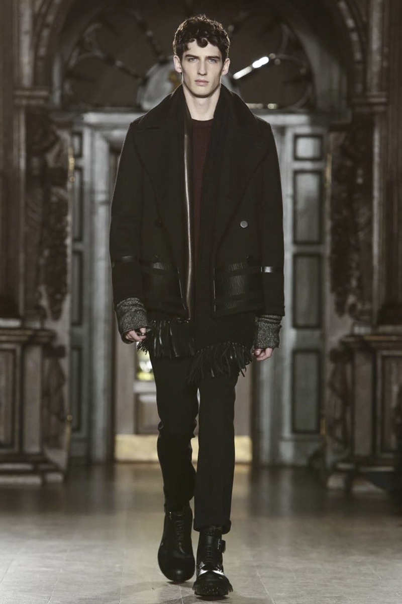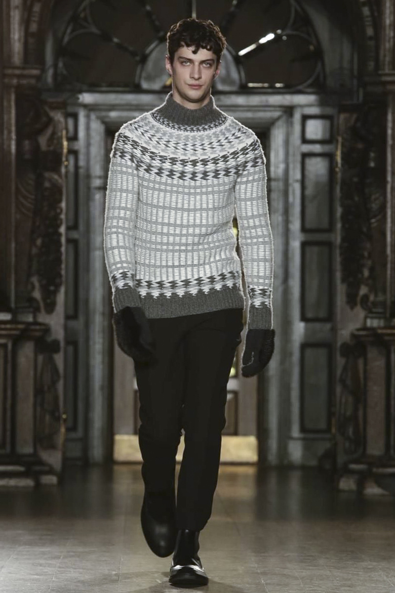 That seemed to be the message at today’s Pringle of Scotland show, held to celebrate the label’s 200th anniversary. There was an element of back-to-roots simplicity about the collection as a whole, with charcoal, black and white ribbed knits dominating the lineup. As ever, there was plenty of interest in the fabrication, whether in panels of contrast-knit technique and texture, or on more dramatic inversions like soft-structured coats which sprouted chunky Aran detailing. There were plenty of subtler touches, too, from tartan patterns woven from planes of contrasting matt and gloss to greyscale interpretations of the house’s pastel-twee Argyll print. And thrown into the mix was a worn, pixilated carpet-floral knit which offered an elegant nod to the label’s long history — a history which has run from humble homespun roots through Victorian wealth, Fifties glamour, Eighties golf-pro naffness and provocative Noughties reinventions. There’s been a lot of swerves in direction over the label’s two centuries. What was impressive, looking at today’s show, was that Pringle had managed to unite so many disparate, diverging facets of the label into something with confident, unforced coherence.