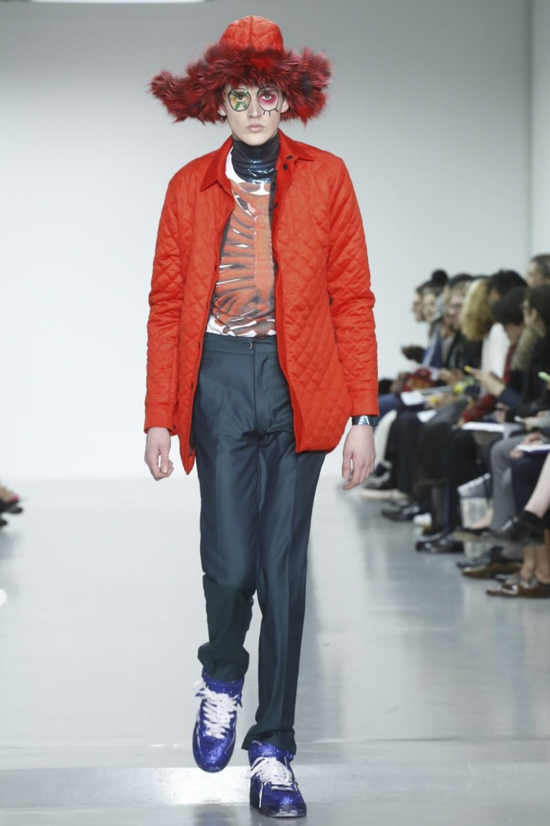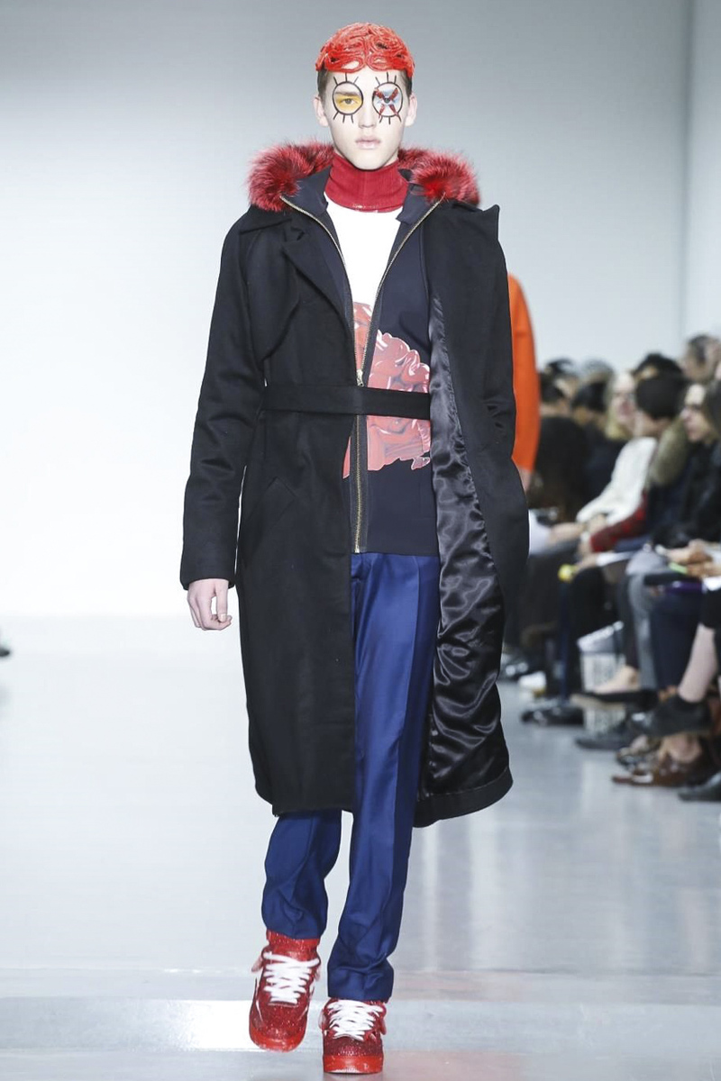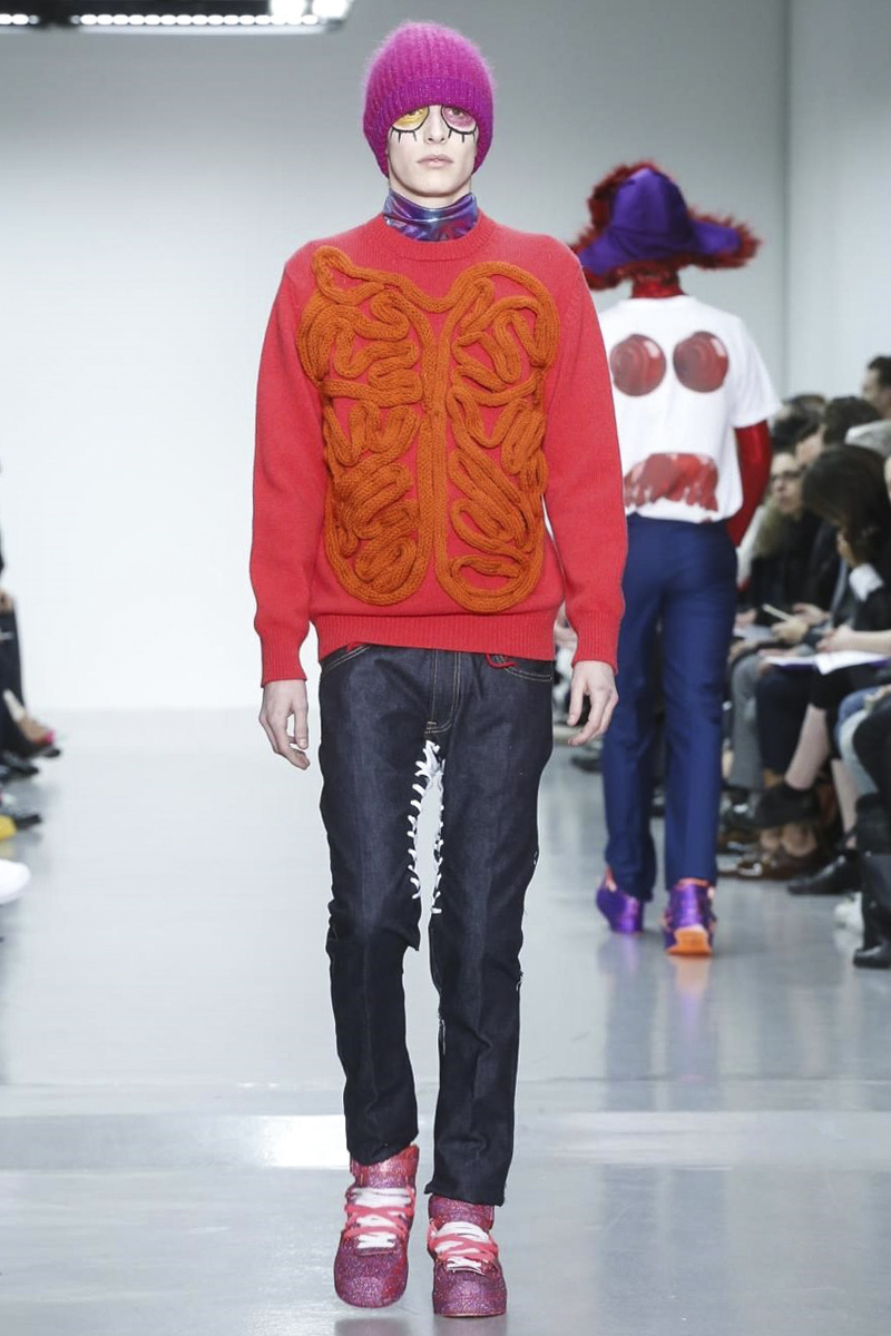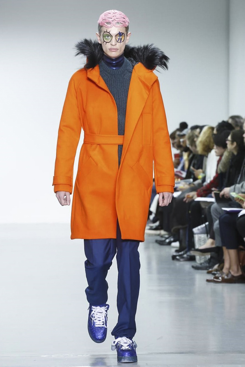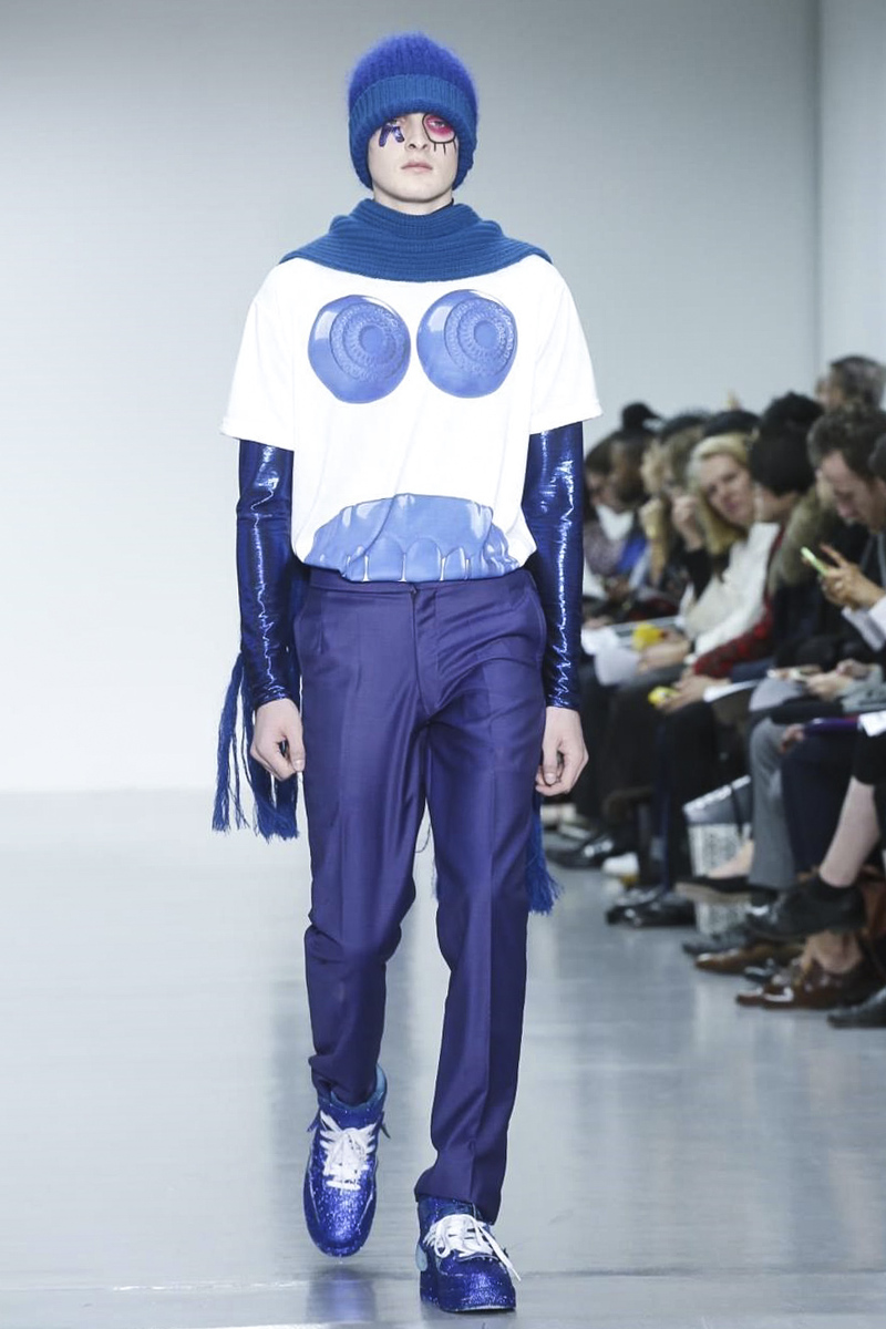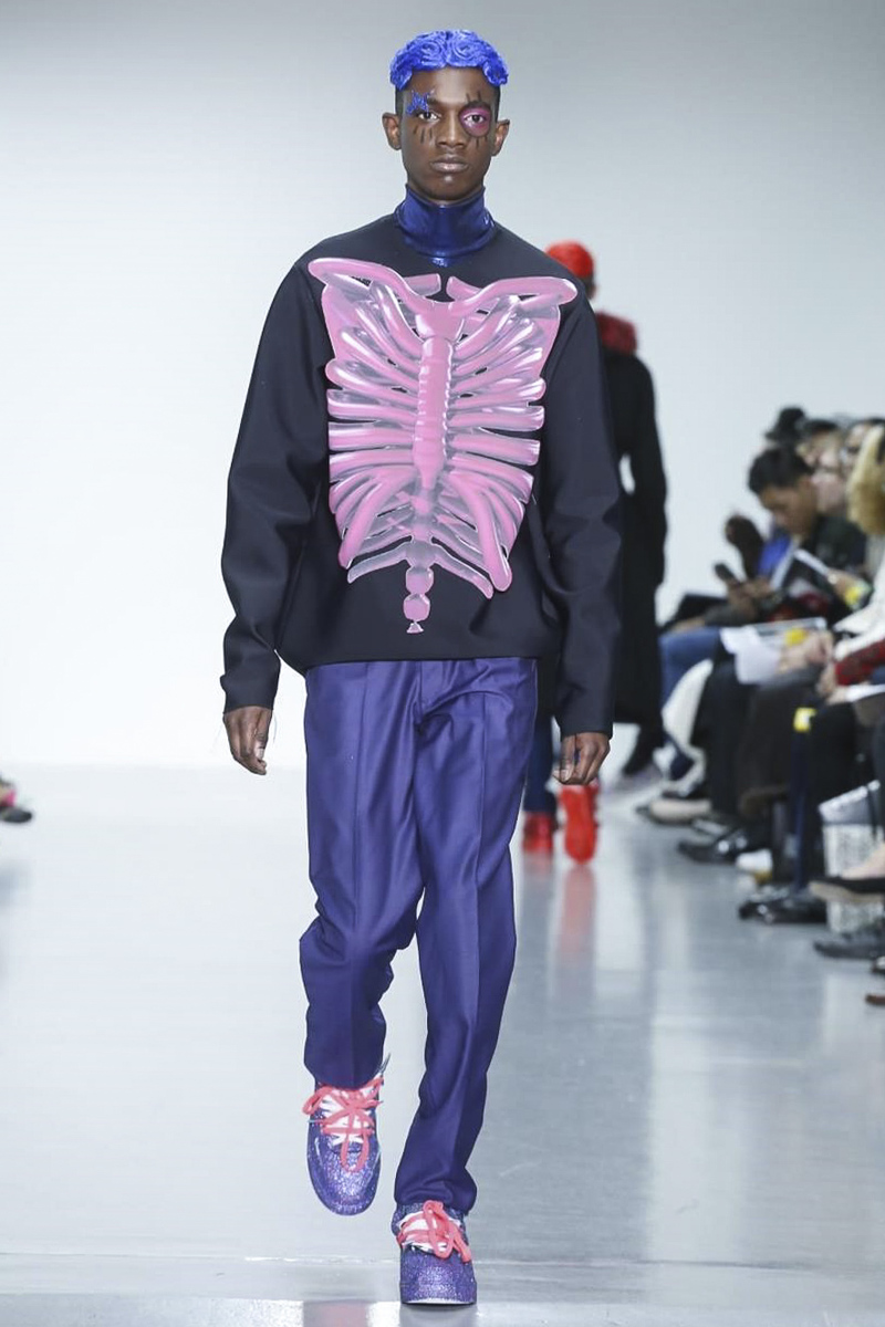 Post-Pop kitsch to the nth degree – Katie Eary’s show left the audience reeling back slightly during the blackout just before the curtain call. Owing the acid-toned collection to two of her favorite contemporary artists, Jeff Koons and Kaws, it became clear why the image on the invite – which also happened to be the leading motif today – was a crossbreed between KAWS iconic brain sculptures and Koons’ balloons. It was quite the antithesis to the sentimentality of Craig Green’s collection that featured immediately before Eary’s.