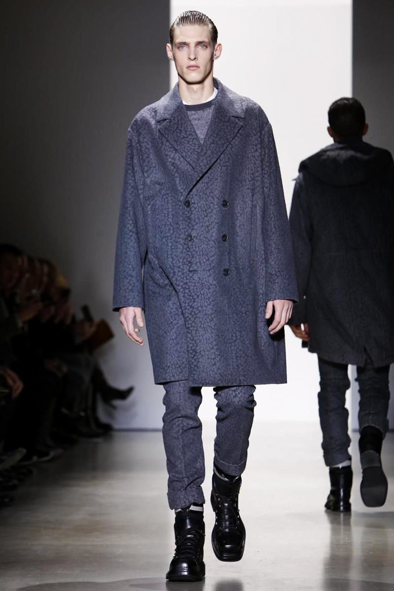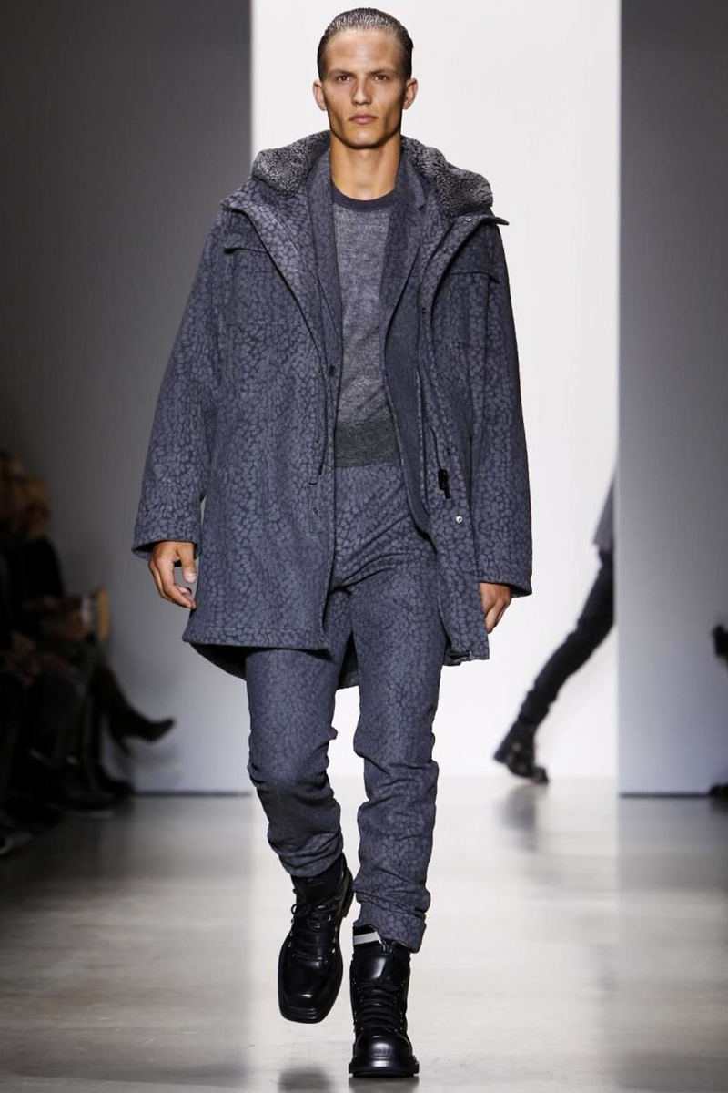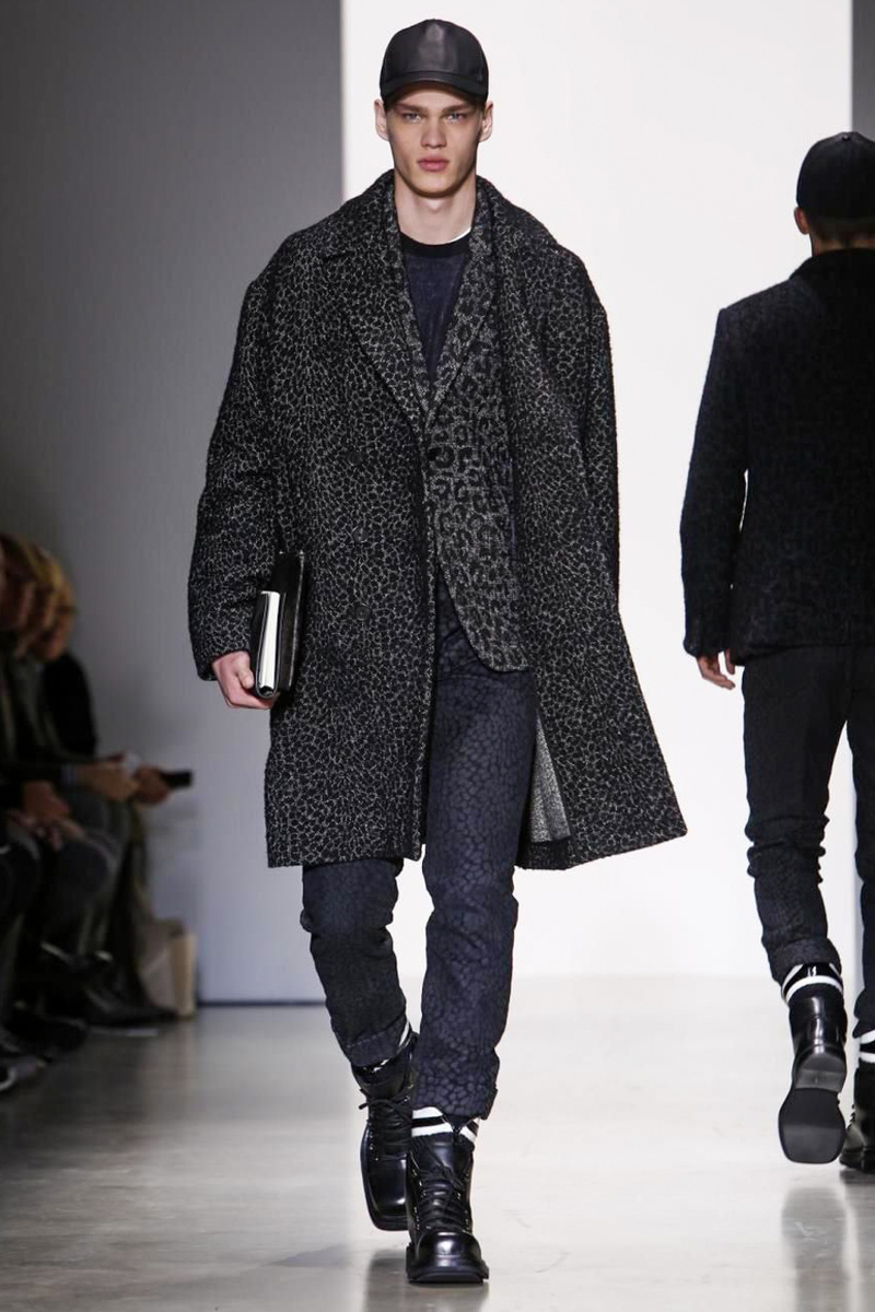 The dominantly tone-on-tone ensembles in shades of gray, black and navy used a cheetah pattern to give the rather classically contemporary sporty styles a bit of oomph. First it showed up on sports jackets and high waisted slim pants in a smaller speckled pattern, and then later on it reappeared in a more organic size on overcoats and blazers.