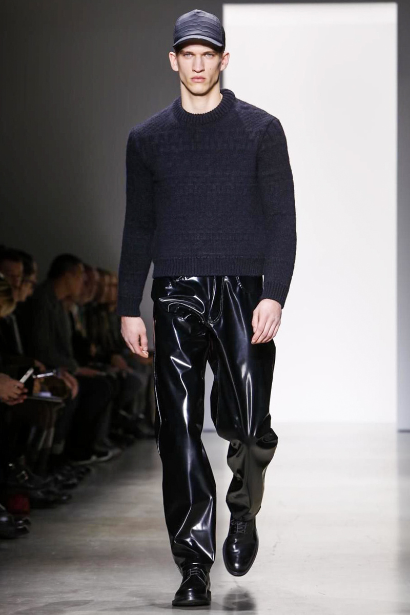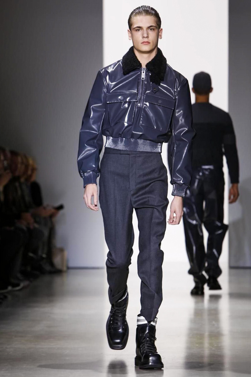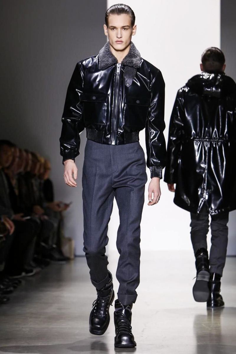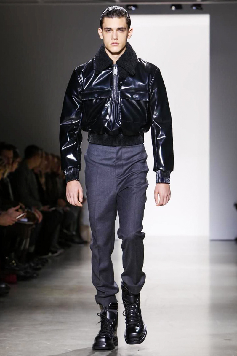 When Zucchelli wasn’t exploring the graphic power of feline spots, he was experimenting with the man-made slick seduction of vinyl. Its glossy composition manifested itself as pants and coats but most strikingly as cropped bomber jackets finished off with shearling collars.