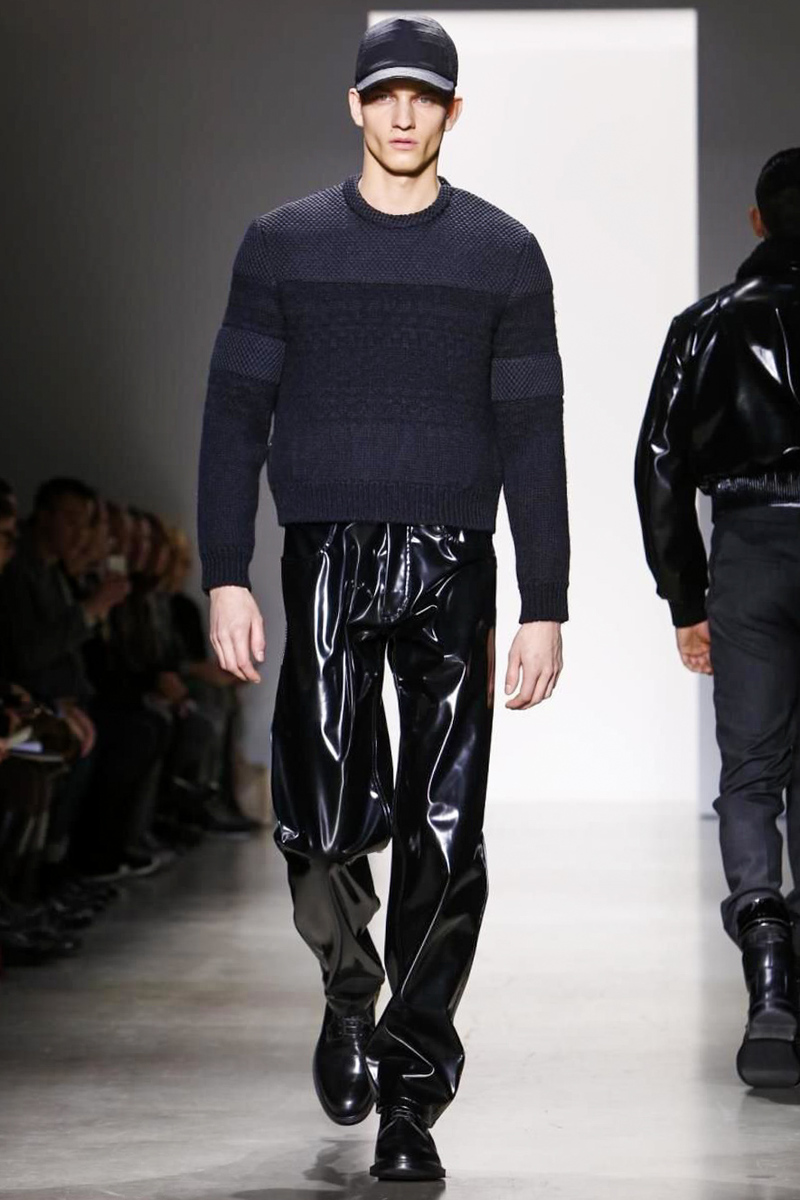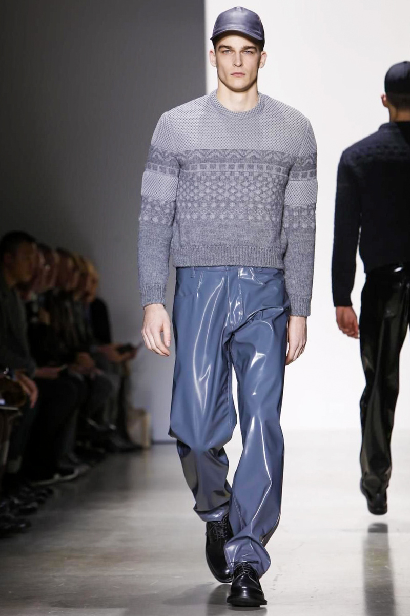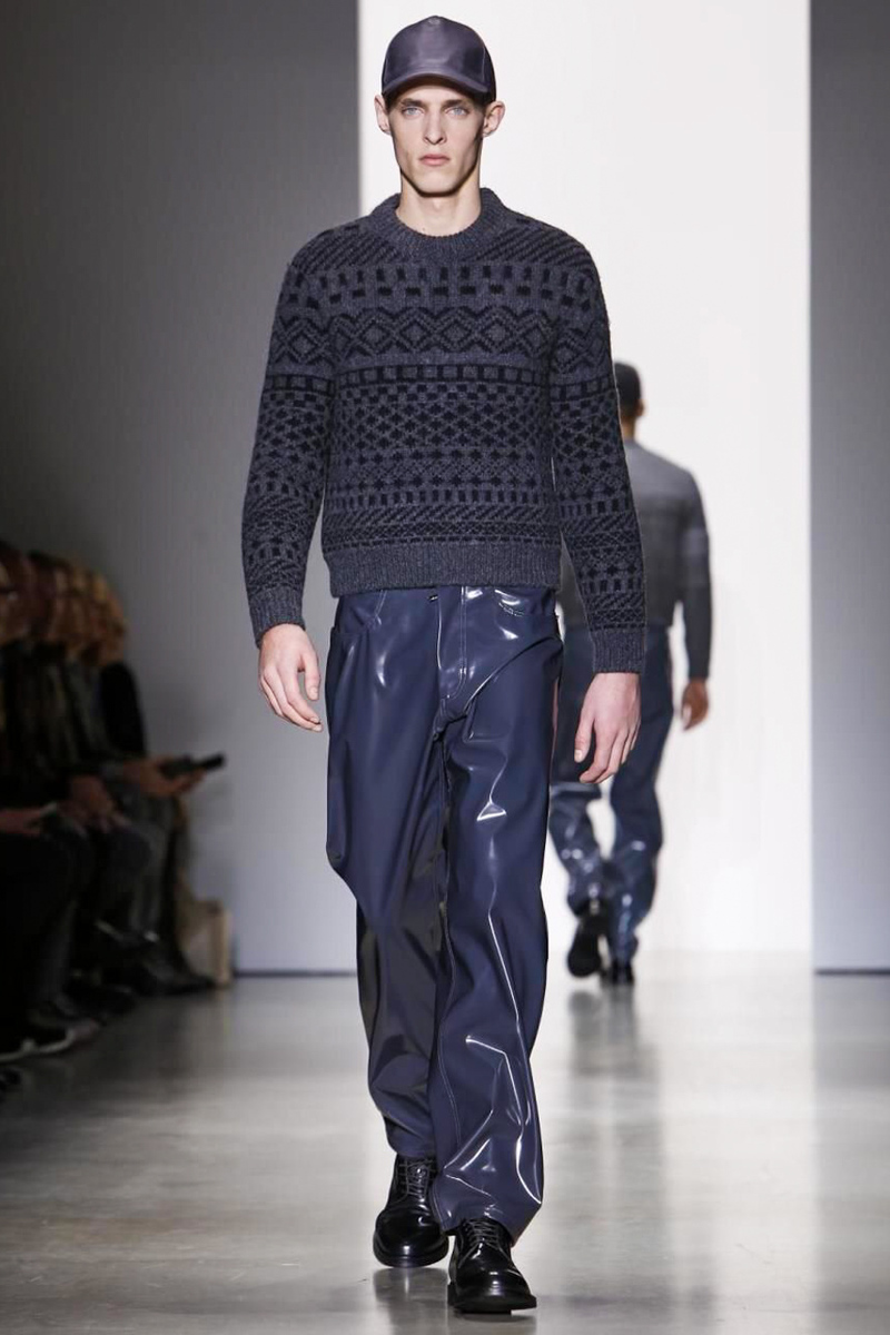For those who might find the vinyl vêtements a sartorial bridge too far, they should have no argument with the designer’s exquisitely beautiful and thoroughly modern Fair Isle sweaters; knitwear concoctions that used an intriguing Alpaca and nylon mesh quilted weave effect that felt wholly original in execution.
