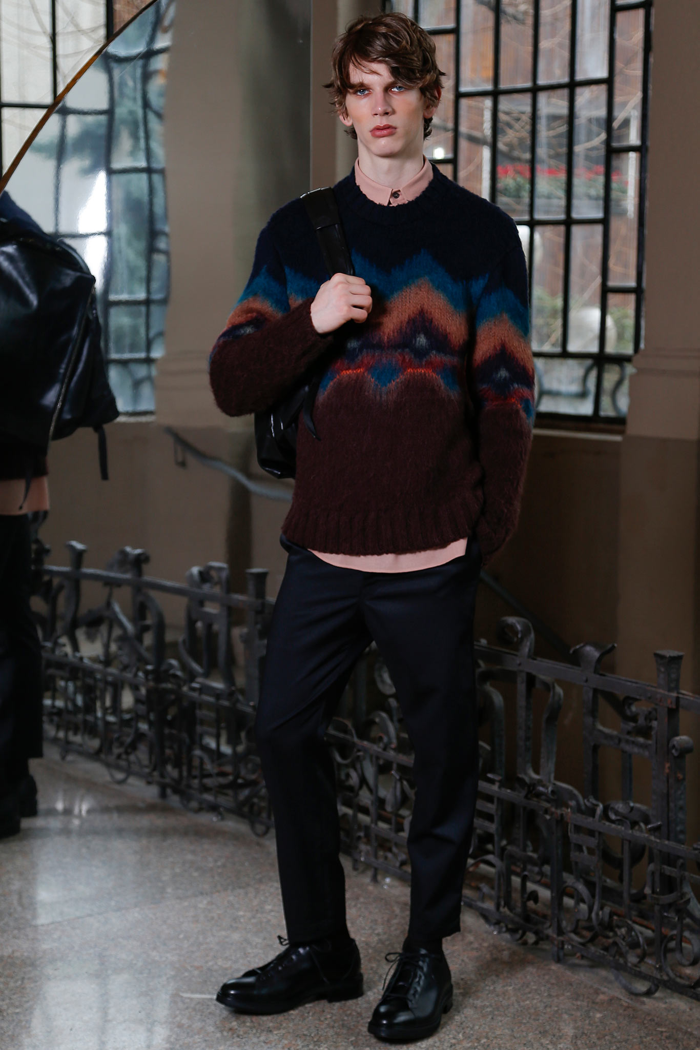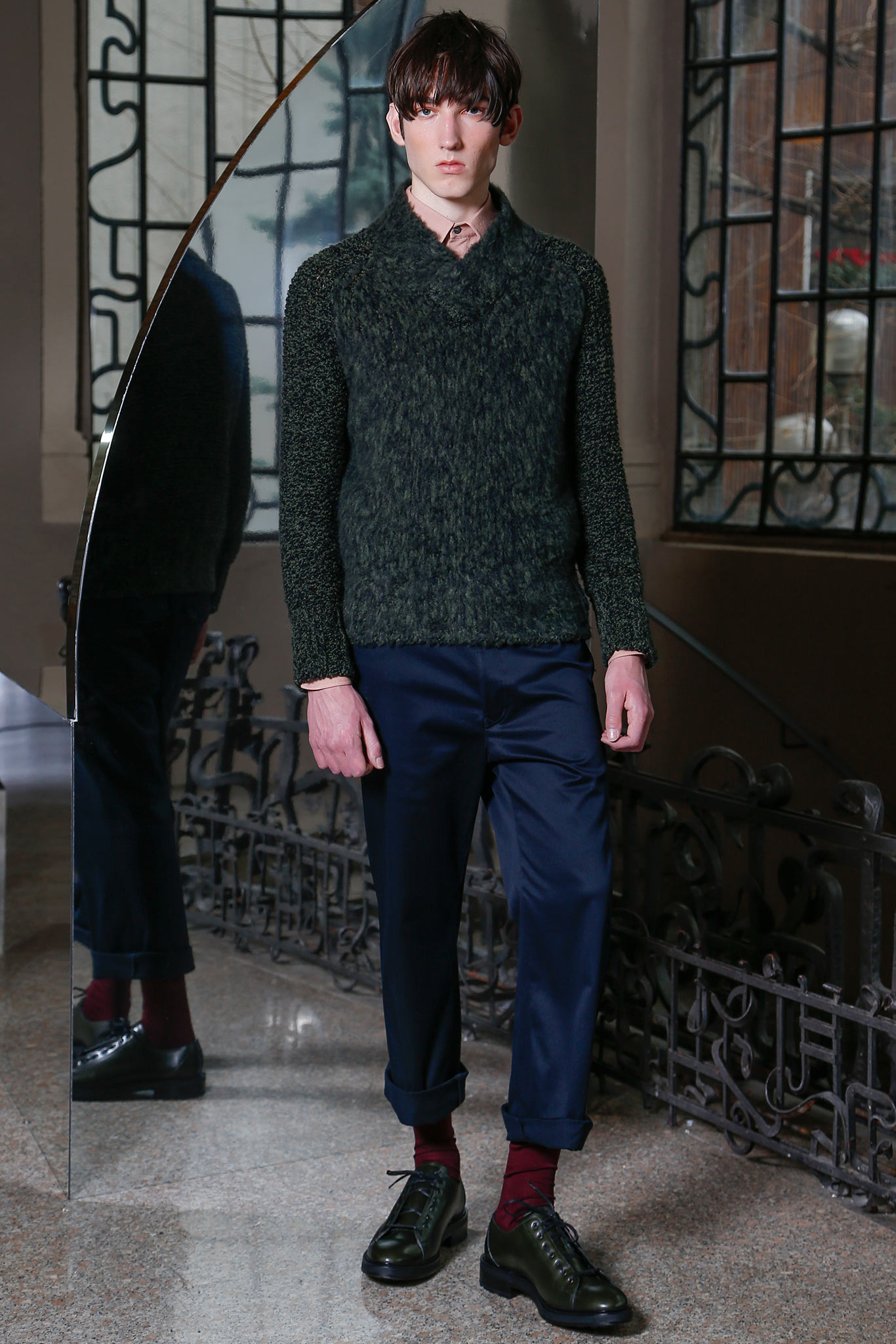 Iceberg Mens F/W 2015.16 Milan Whoever said that skipping the catwalk show in favor of a presentation is akin to a downsizing? That’s the general perception in the fashion world, where appearance trumps substance by default, but it was not the case for Federico Curradi, whose Iceberg collection greatly benefited from the lack of runway action. The presentation was held in a magnificent Milanese palazzo, which was a joy in itself with its wrought stuccos and painterly mosaics. This was the first time Curradi has chosen to stage a presentation, and it was a smart move, bringing the audience close to the clothes, with the option to touch them. In contrast, Iceberg’s previous shows under Curradi’s tenure had a militaristic, urban tone that was occasionally slightly off-putting. Perhaps he has finally found his own stylistic balance for the house, highlighted by the tight final edit.