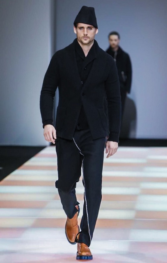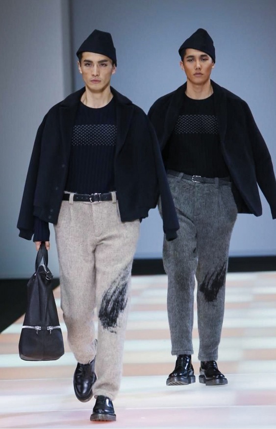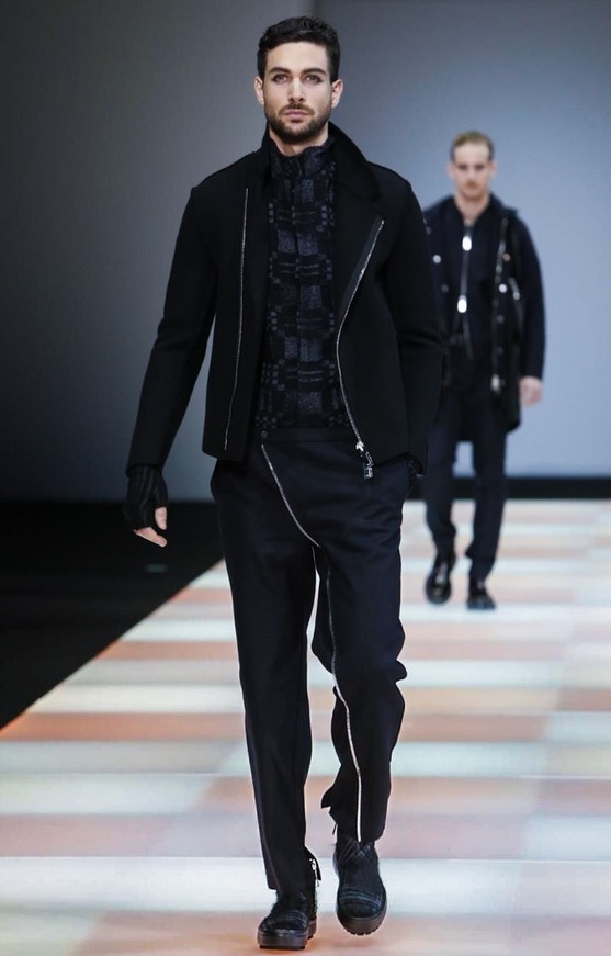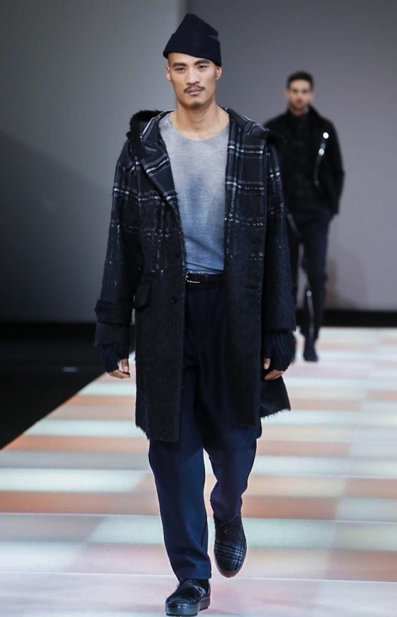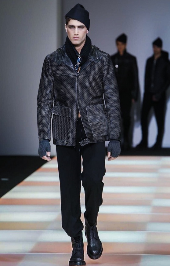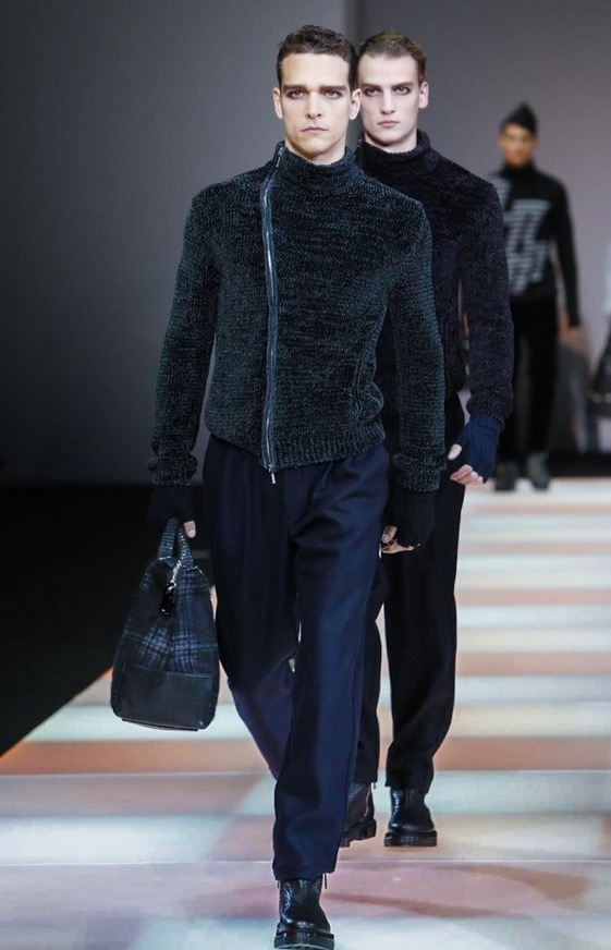 The total comfort of knitwear, the ductility of jersey, the texture of yarn that becomes an aesthetic dimension that creates new fabrics: the Emporio Armani collection has a strongly urban feel, characterised by the presence of jersey as a highlight and knitwear as an unusual detail. Rough-cut cloth jersey gives shape to pea coats and parkas made of needled check and in fabrics with a mohair look, lending an image of warmth and comfort.