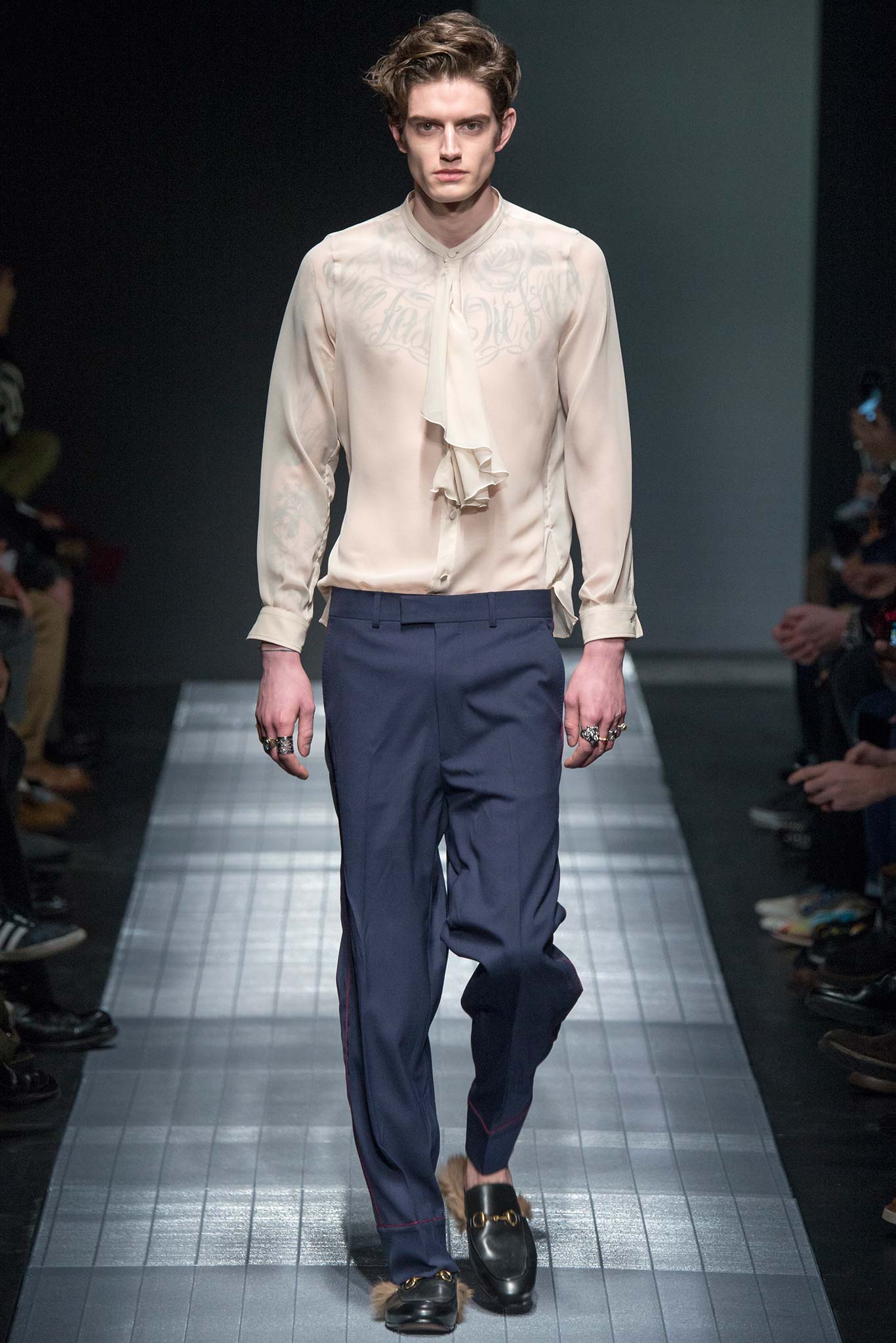 From the first pussy bow red silk shirt that opened the show, through the bracelet sleeve jackets, ruffled turtlenecks and semi sheer floral lace tops — all of them worn by men — this collection took Gucci in a decidedly new direction. Daring, too, were the accessories — Michele’s wheelhouse — that will be remembered for their fur edged slide on shoes, the jaunty berets and knit pompom-topped caps.