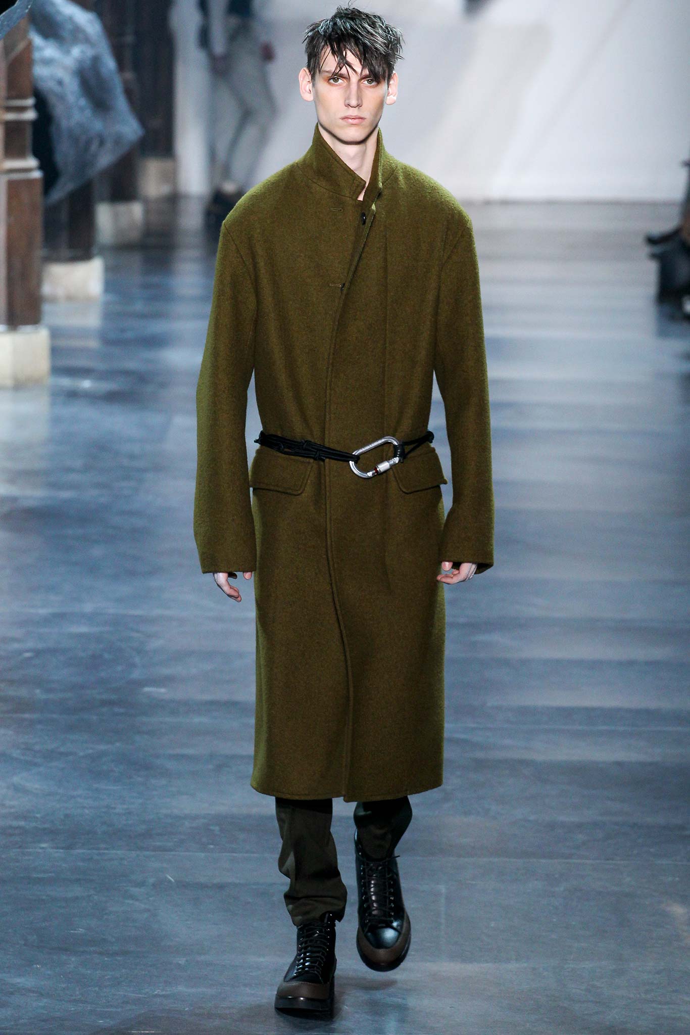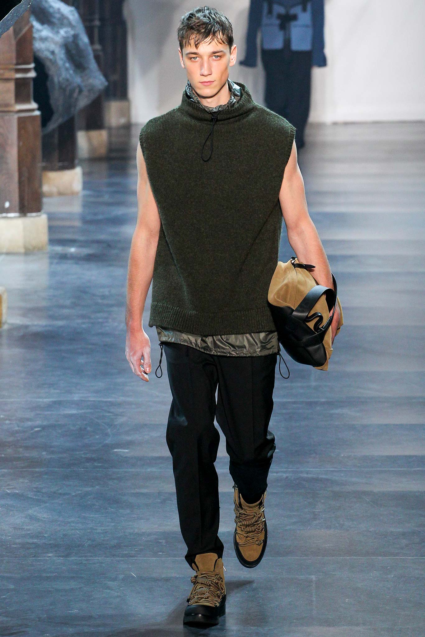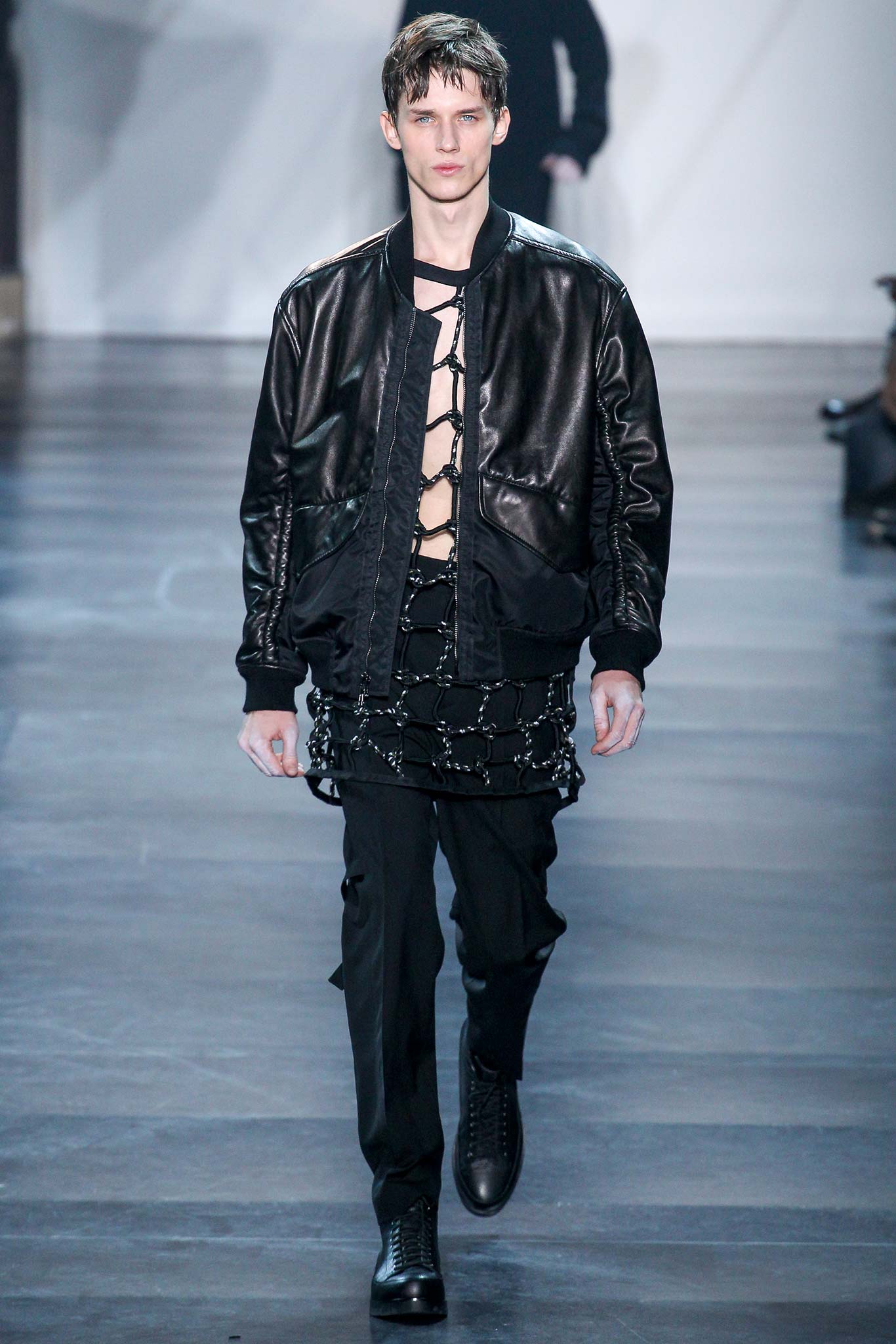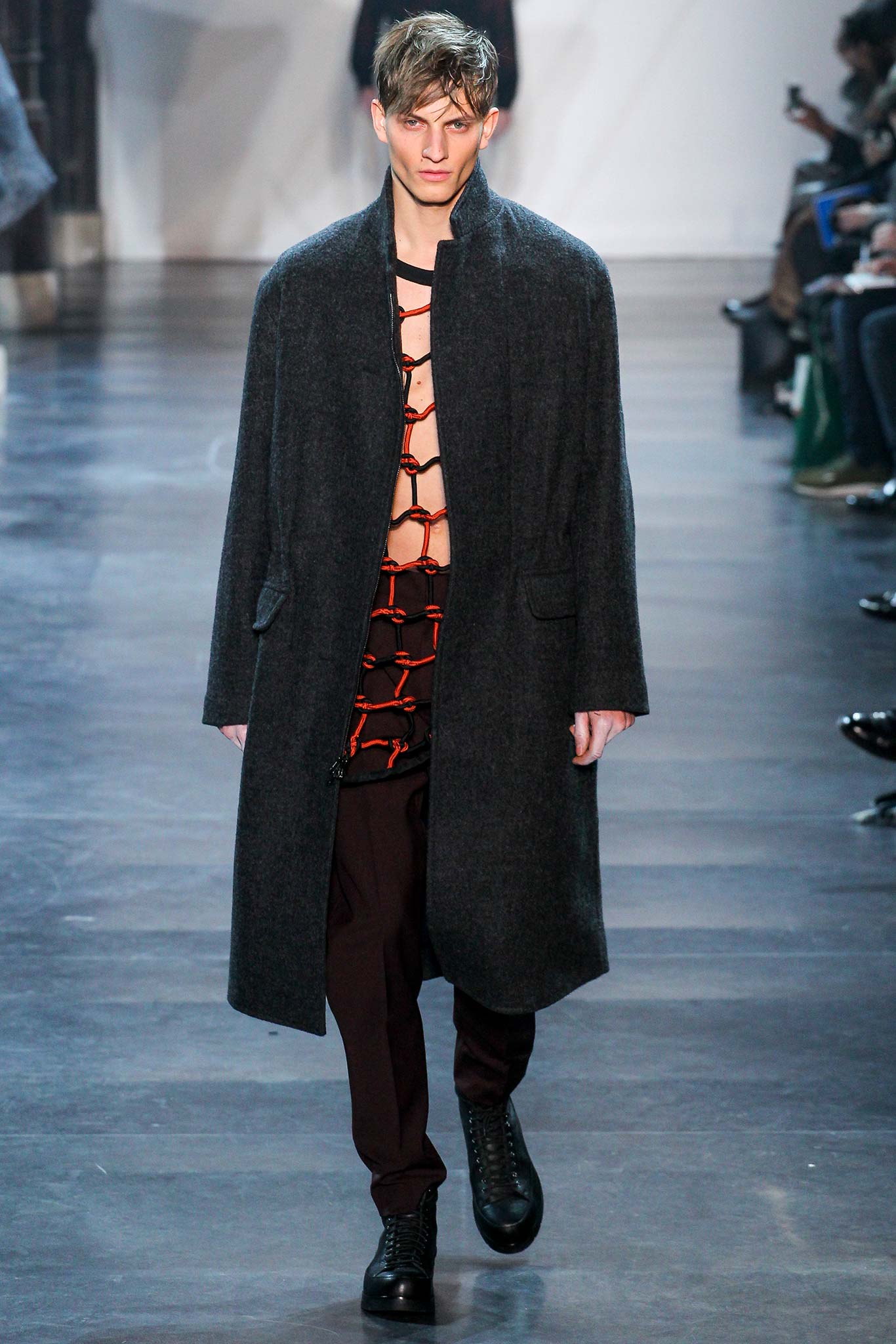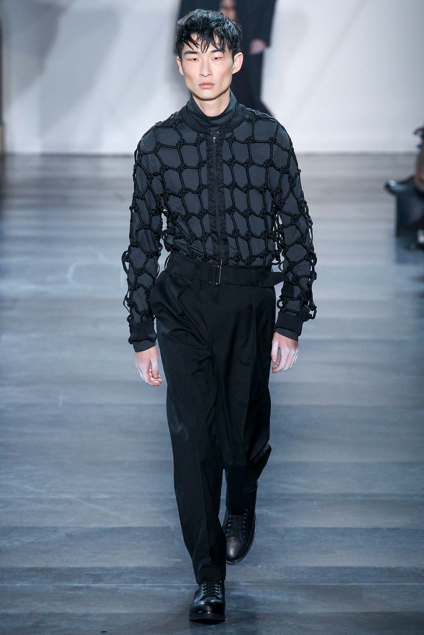 Rock-climbing as a metaphor for life, rather than a straight-up inspiration for a collection, the designer explained before his Paris show. Of course, it is about the state of mind, but this also provided him with a slew of decorative knots as a lifeline throughout the lineup (from belts to shoes, to backpacks and clutches, to knotted into a loose, giant-cell fishnet tee). “Is it safety or subversion?” he mused, pointing alternatively to a gorgeous khaki wool coat simply held shut by a length of rope and the aforementioned fishnet tunic. This theme also helped ground Lim, steering him away from the overbearing bulkiness that distracted in earlier collections. All this sportswear was well distilled into a collection that was as trim and polished as could be expected of any Lim offering. The best looks were no doubt the urbane variations that seemed the simplest, like a thin blouson in a woven knot motif. Likewise, coats and sharp parkas had unmediated appeal.
