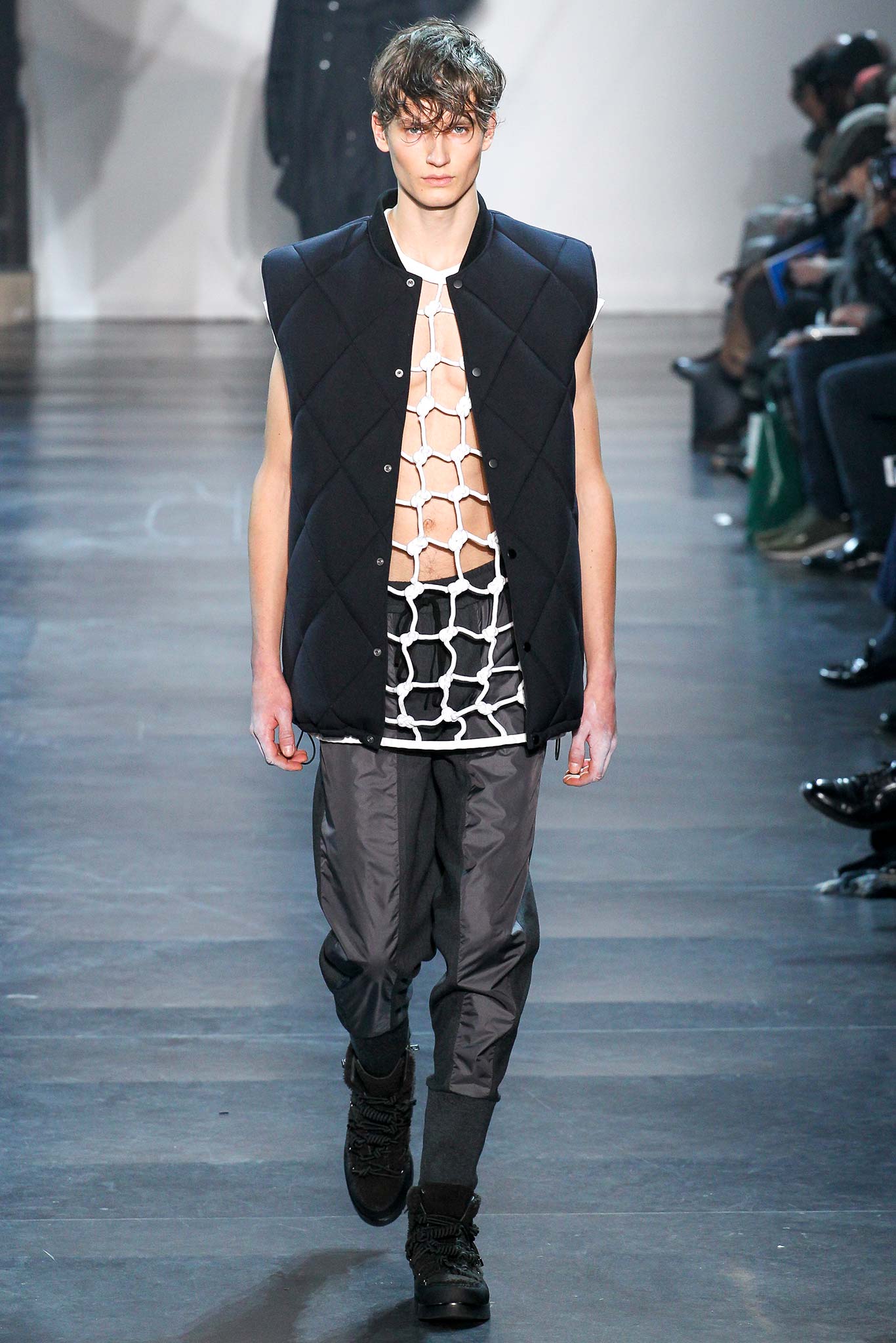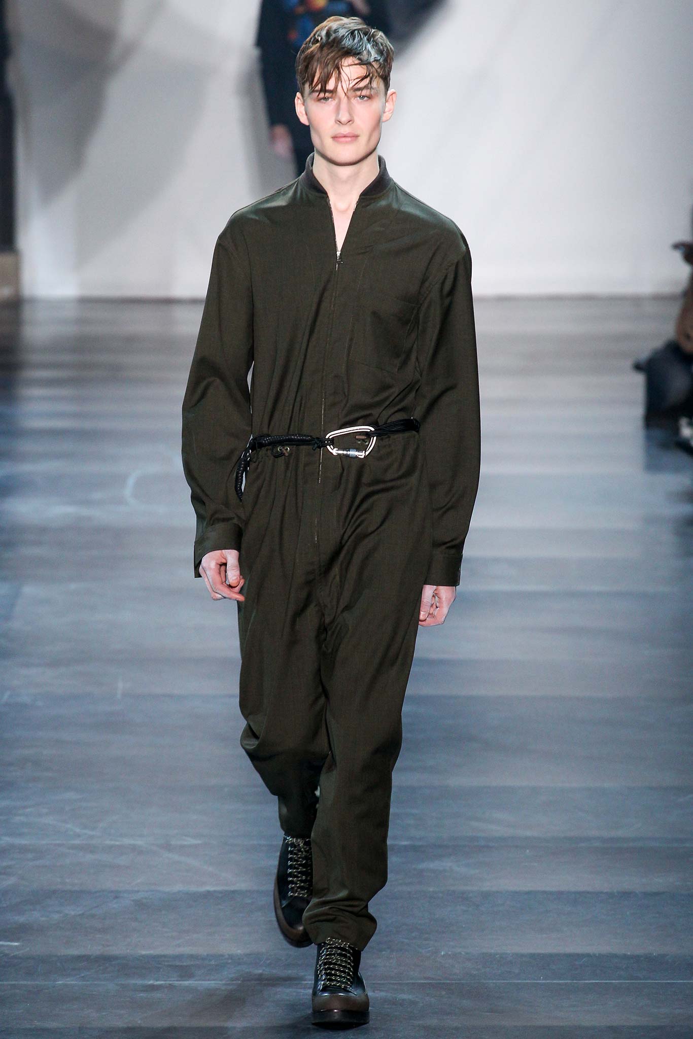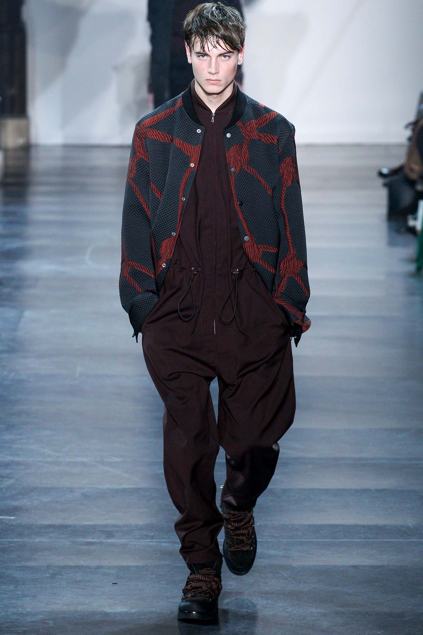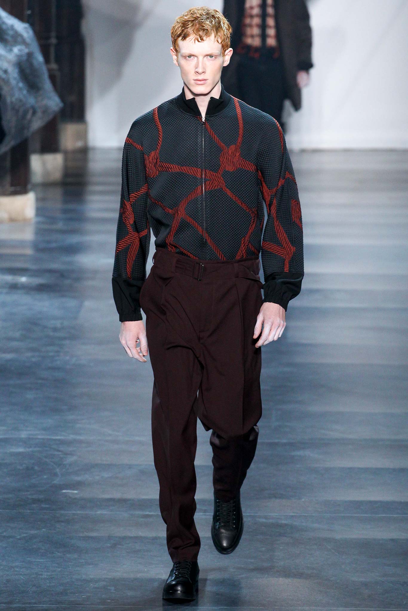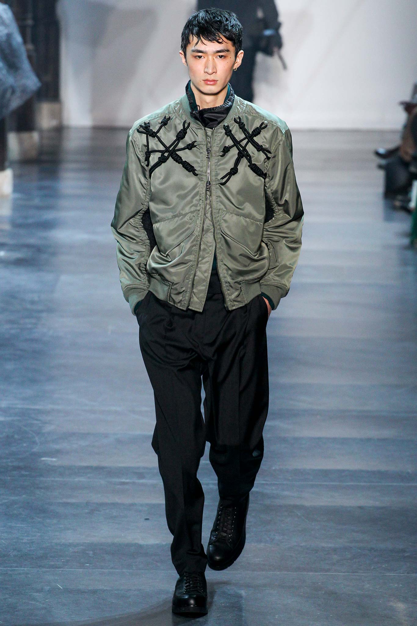 Rock-climbing as a metaphor for life, rather than a straight-up inspiration for a collection, the designer explained before his Paris show. Of course, it is about the state of mind, but this also provided him with a slew of decorative knots as a lifeline throughout the lineup (from belts to shoes, to backpacks and clutches, to knotted into a loose, giant-cell fishnet tee). “Is it safety or subversion?” he mused, pointing alternatively to a gorgeous khaki wool coat simply held shut by a length of rope and the aforementioned fishnet tunic. This theme also helped ground Lim, steering him away from the overbearing bulkiness that distracted in earlier collections. All this sportswear was well distilled into a collection that was as trim and polished as could be expected of any Lim offering. The best looks were no doubt the urbane variations that seemed the simplest, like a thin blouson in a woven knot motif. Likewise, coats and sharp parkas had unmediated appeal.