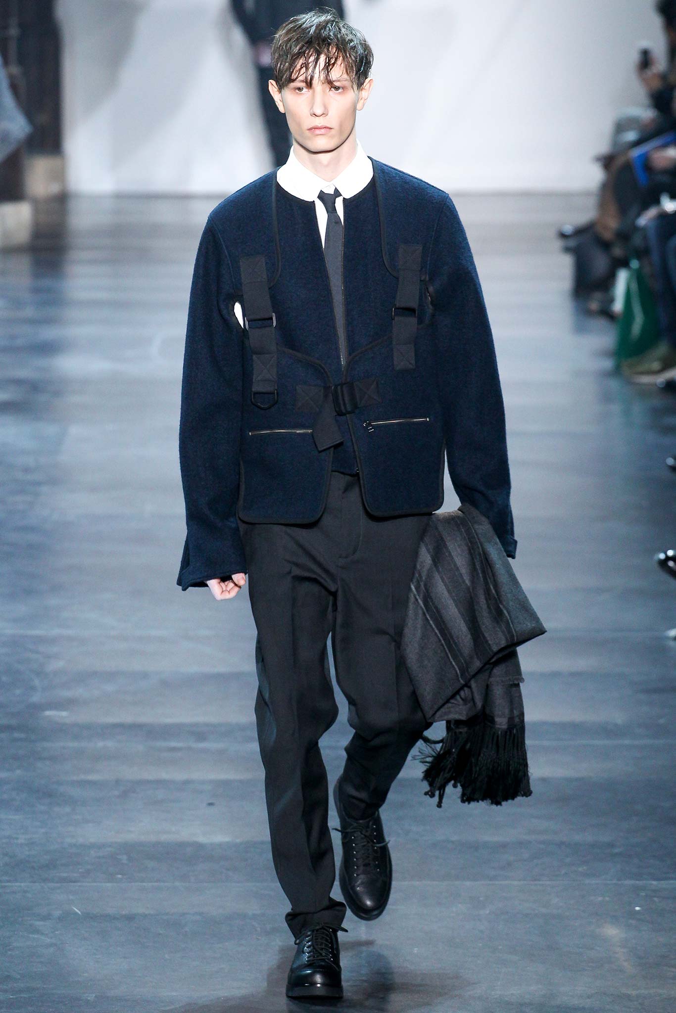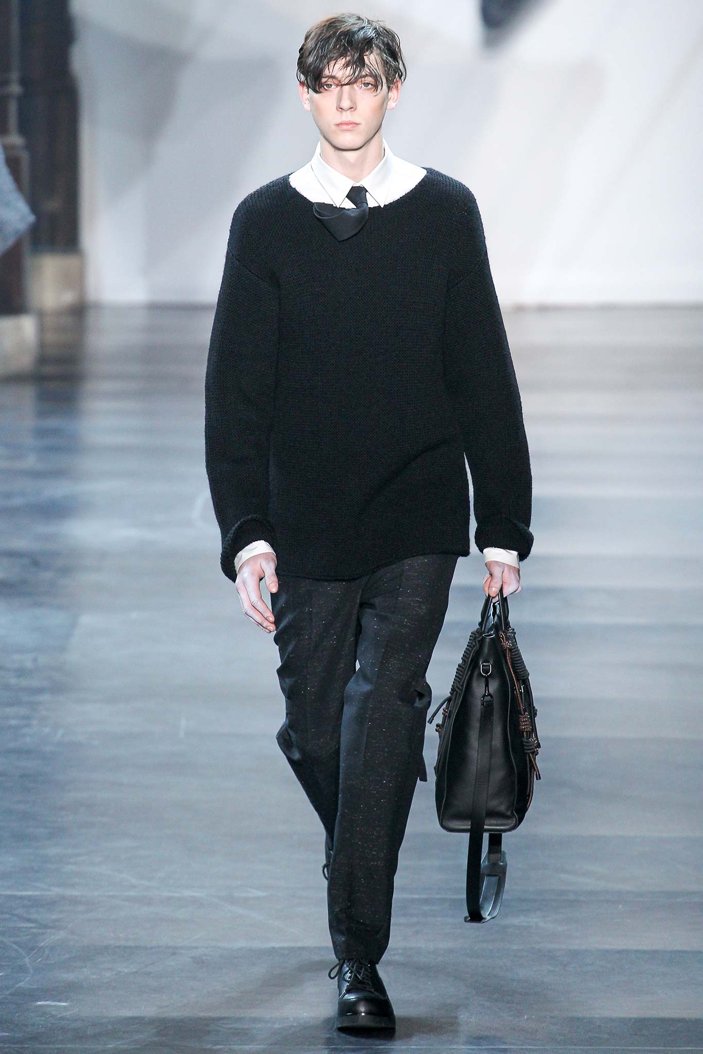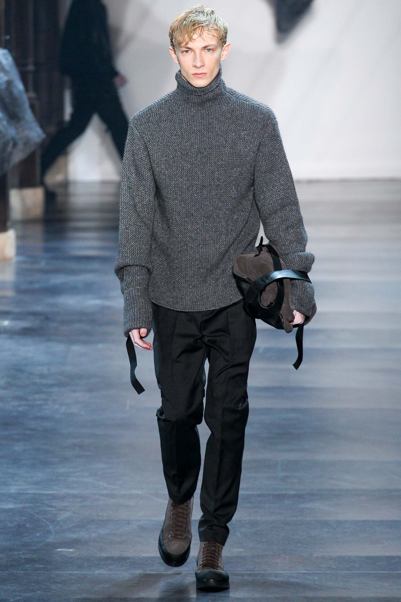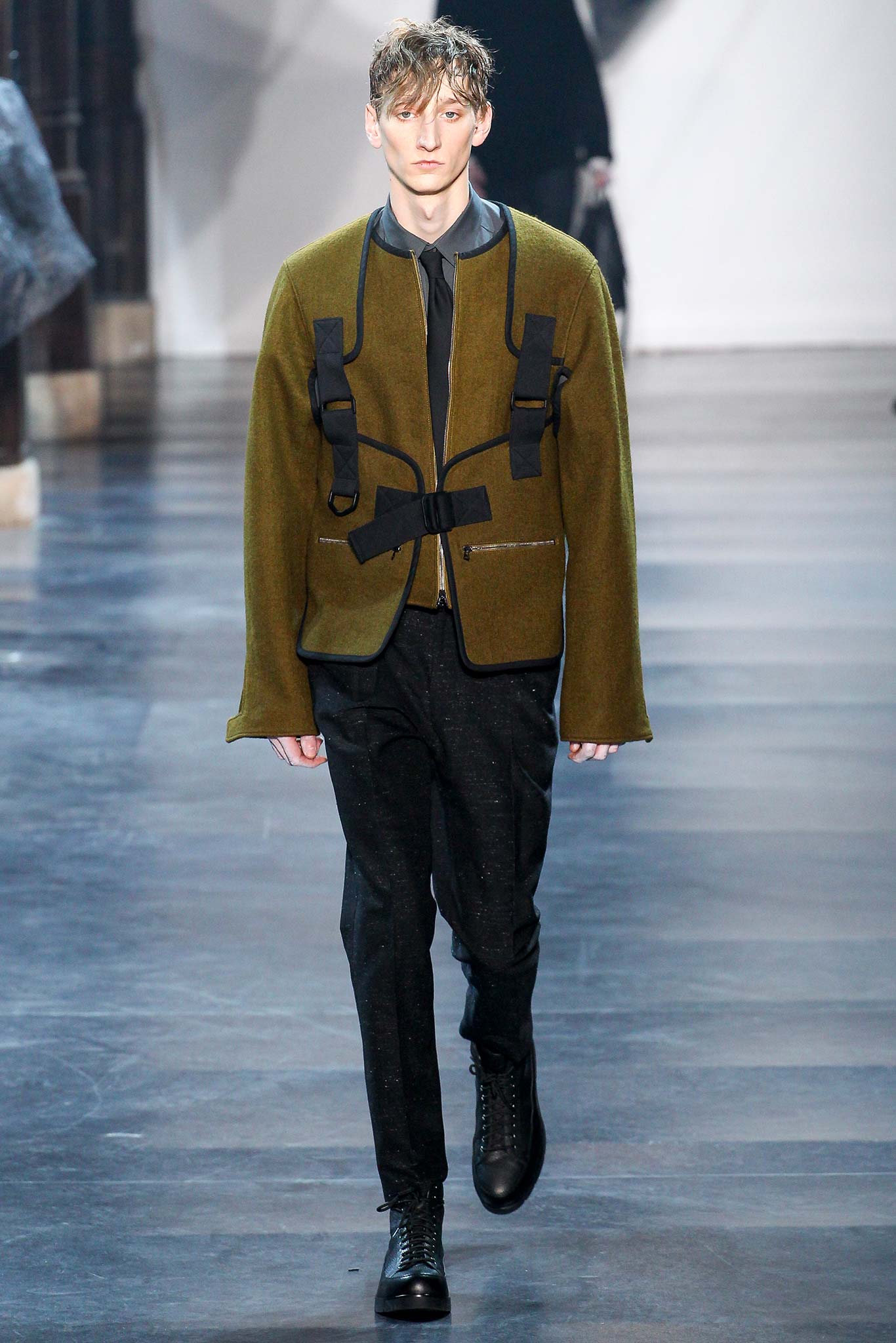 Rock-climbing as a metaphor for life, rather than a straight-up inspiration for a collection, the designer explained before his Paris show. Of course, it is about the state of mind, but this also provided him with a slew of decorative knots as a lifeline throughout the lineup (from belts to shoes, to backpacks and clutches, to knotted into a loose, giant-cell fishnet tee). “Is it safety or subversion?” he mused, pointing alternatively to a gorgeous khaki wool coat simply held shut by a length of rope and the aforementioned fishnet tunic. This theme also helped ground Lim, steering him away from the overbearing bulkiness that distracted in earlier collections. All this sportswear was well distilled into a collection that was as trim and polished as could be expected of any Lim offering. The best looks were no doubt the urbane variations that seemed the simplest, like a thin blouson in a woven knot motif. Likewise, coats and sharp parkas had unmediated appeal.