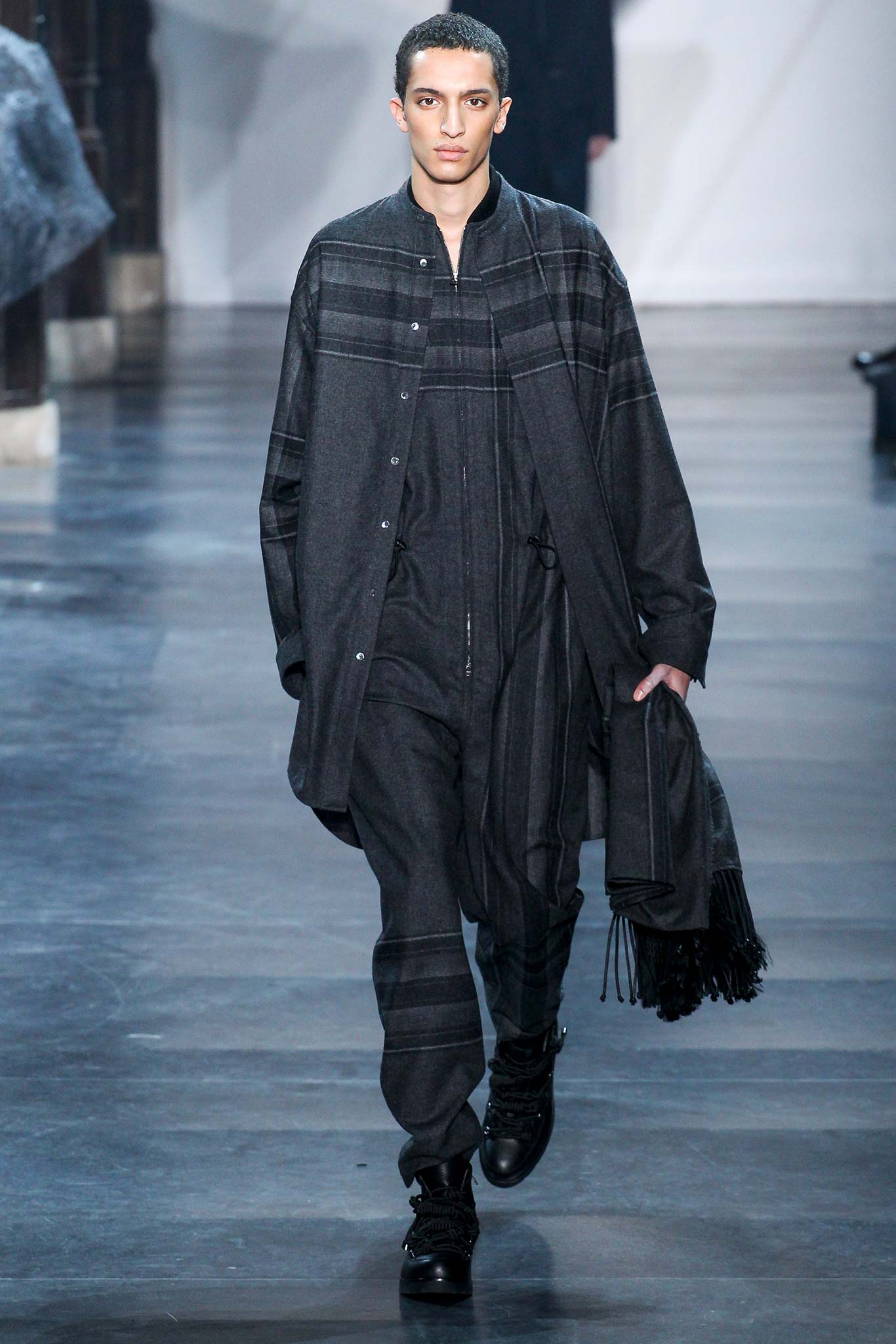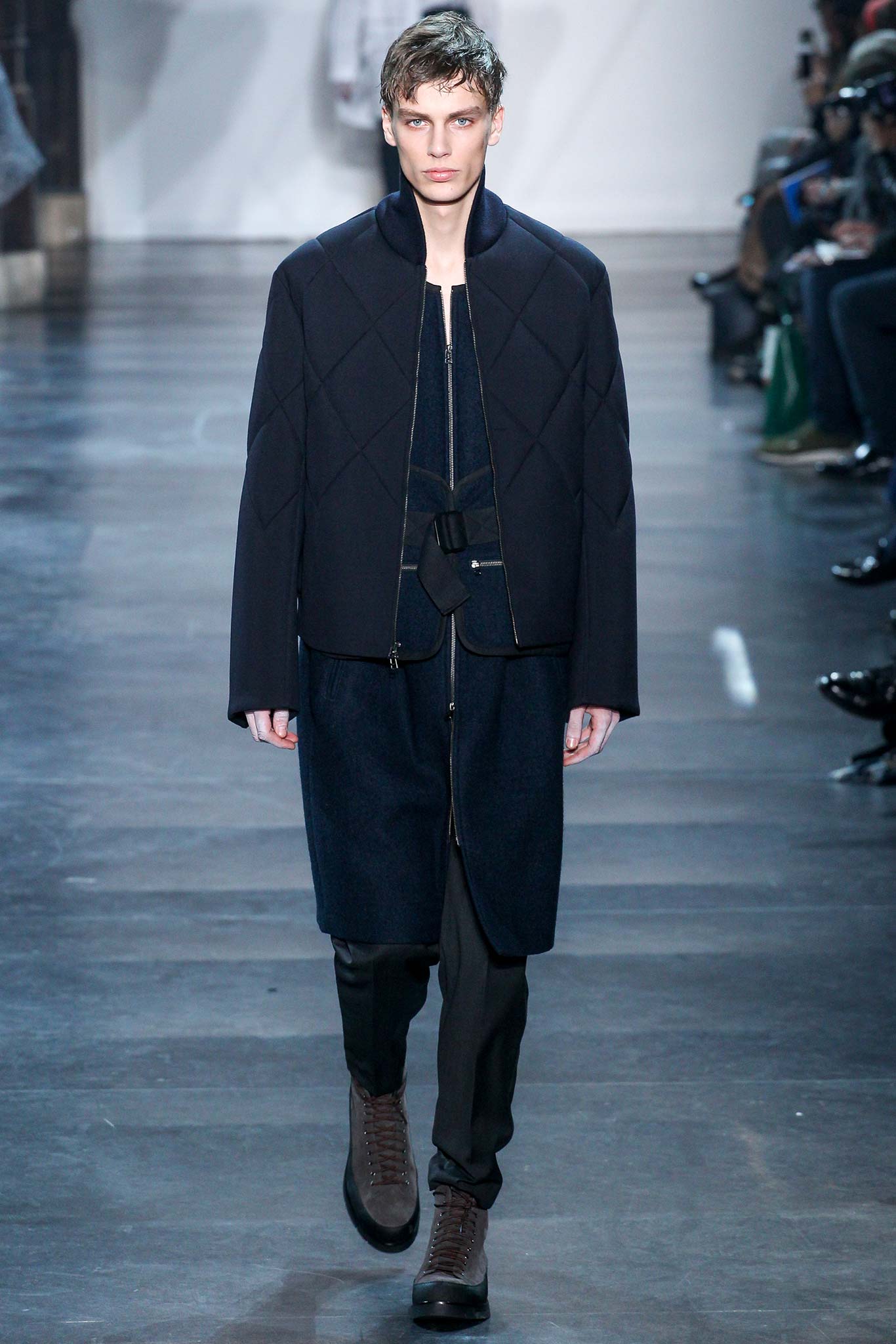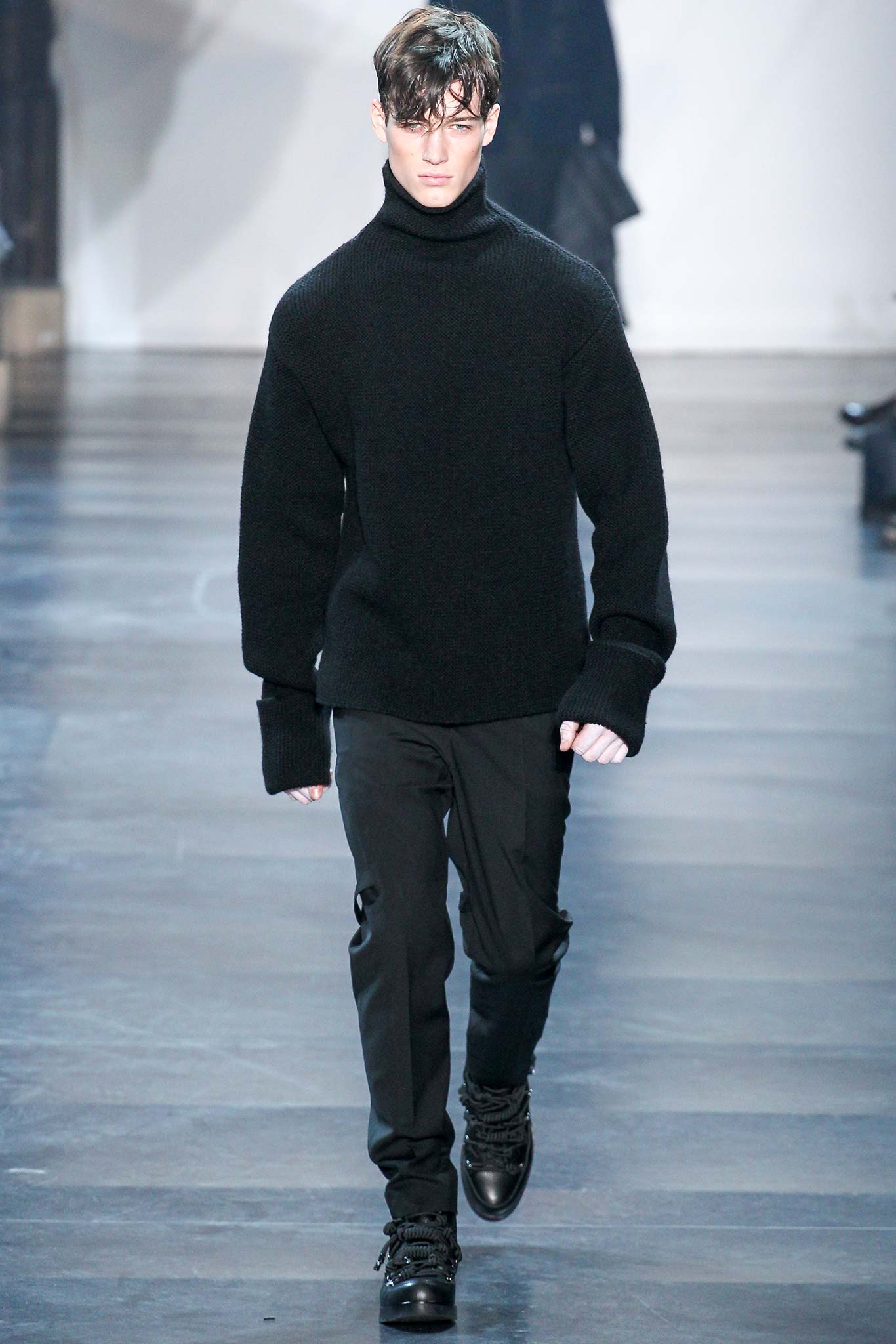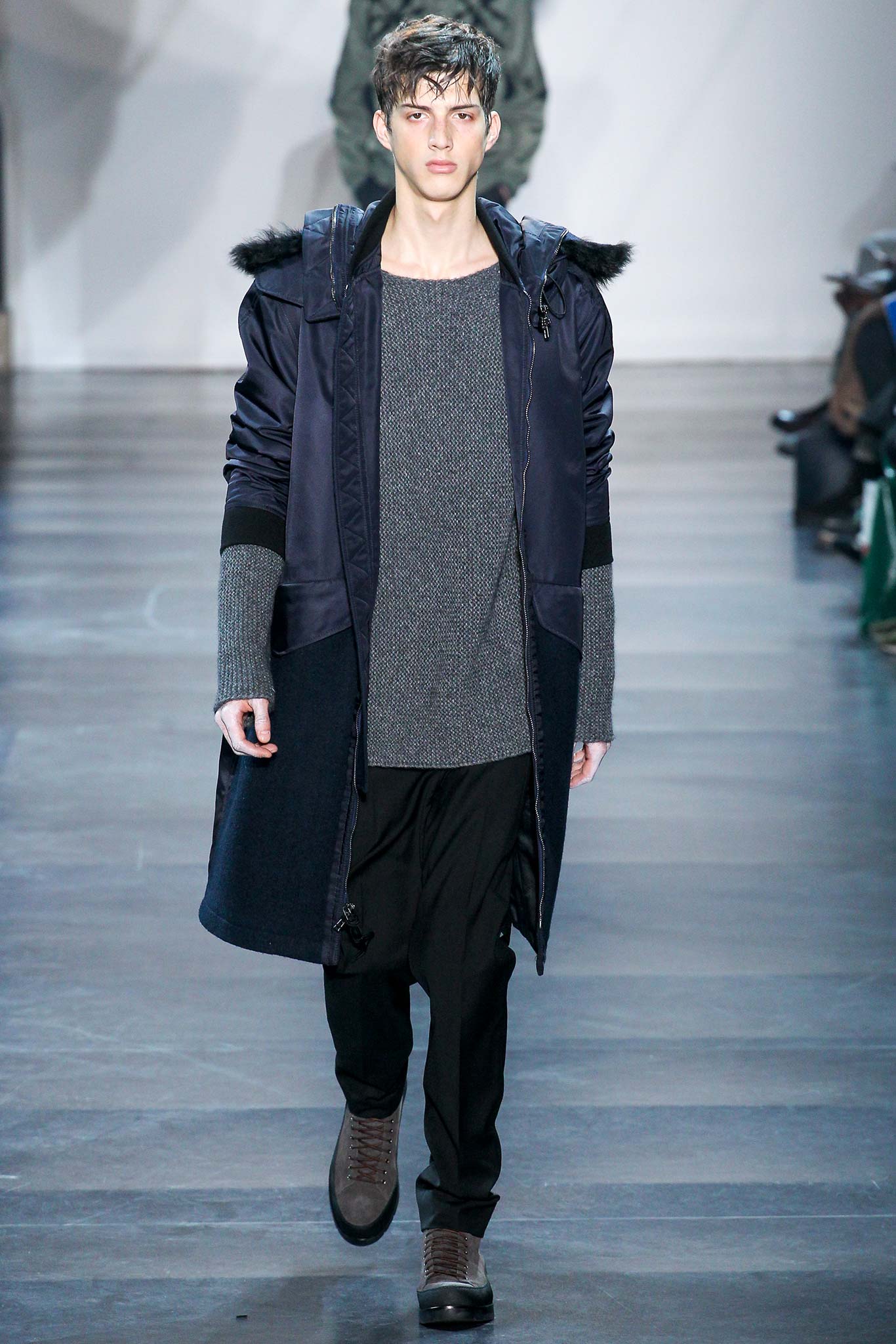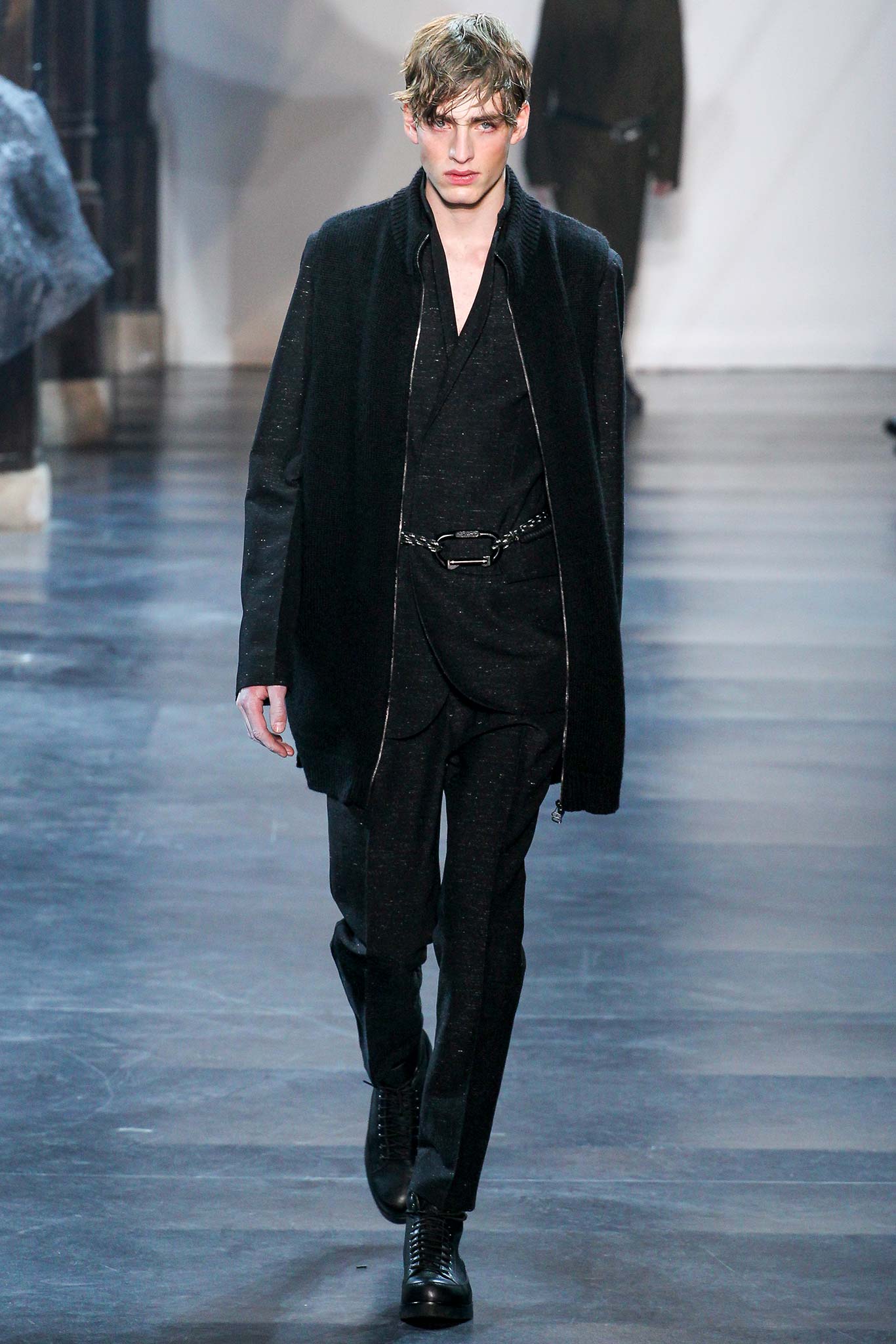 Rock-climbing as a metaphor for life, rather than a straight-up inspiration for a collection, the designer explained before his Paris show. Of course, it is about the state of mind, but this also provided him with a slew of decorative knots as a lifeline throughout the lineup (from belts to shoes, to backpacks and clutches, to knotted into a loose, giant-cell fishnet tee). “Is it safety or subversion?” he mused, pointing alternatively to a gorgeous khaki wool coat simply held shut by a length of rope and the aforementioned fishnet tunic. This theme also helped ground Lim, steering him away from the overbearing bulkiness that distracted in earlier collections. All this sportswear was well distilled into a collection that was as trim and polished as could be expected of any Lim offering. The best looks were no doubt the urbane variations that seemed the simplest, like a thin blouson in a woven knot motif. Likewise, coats and sharp parkas had unmediated appeal.