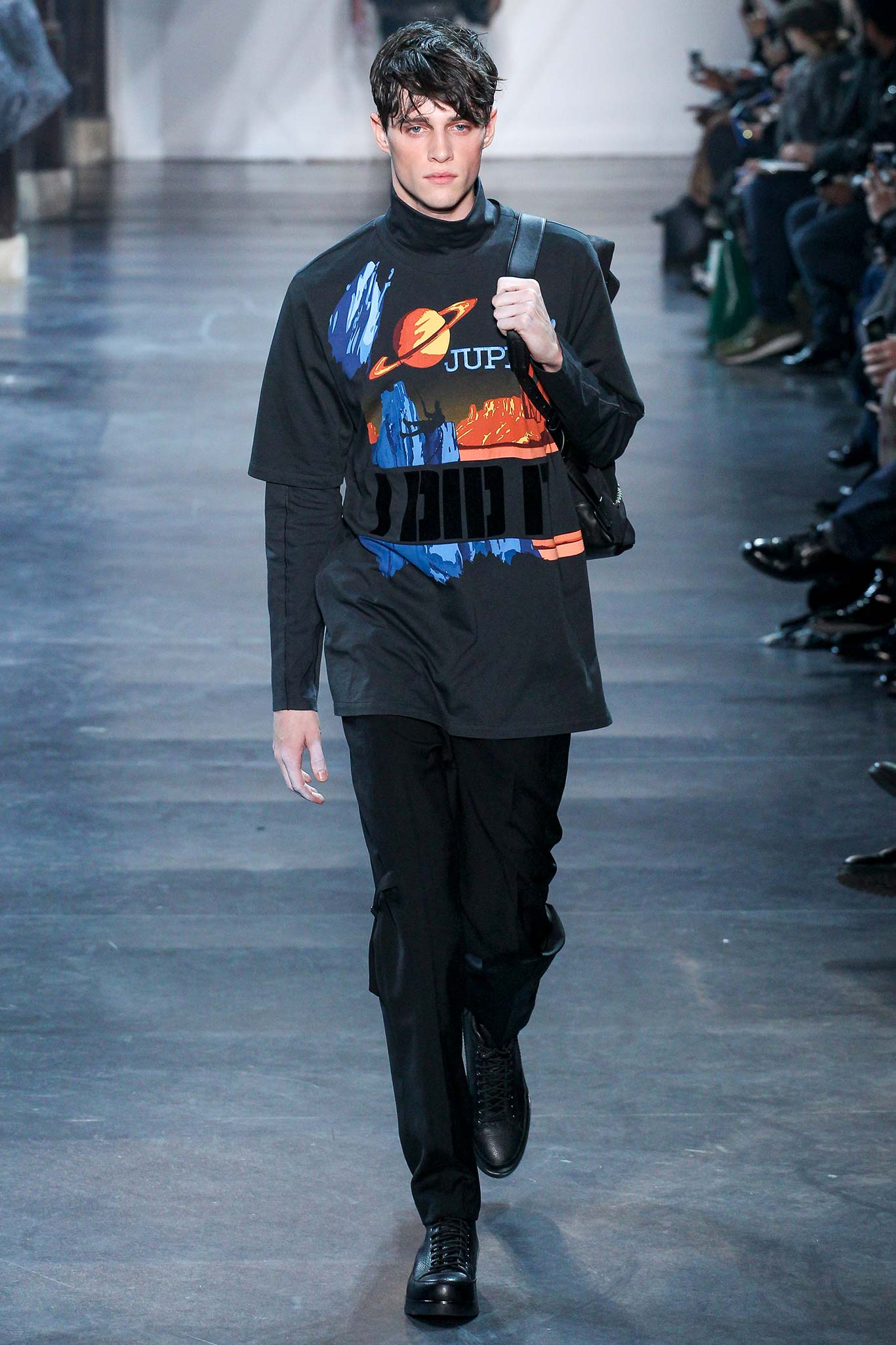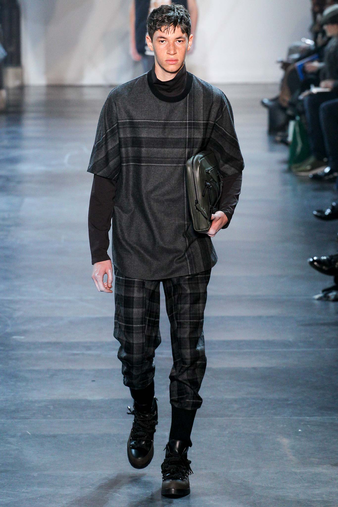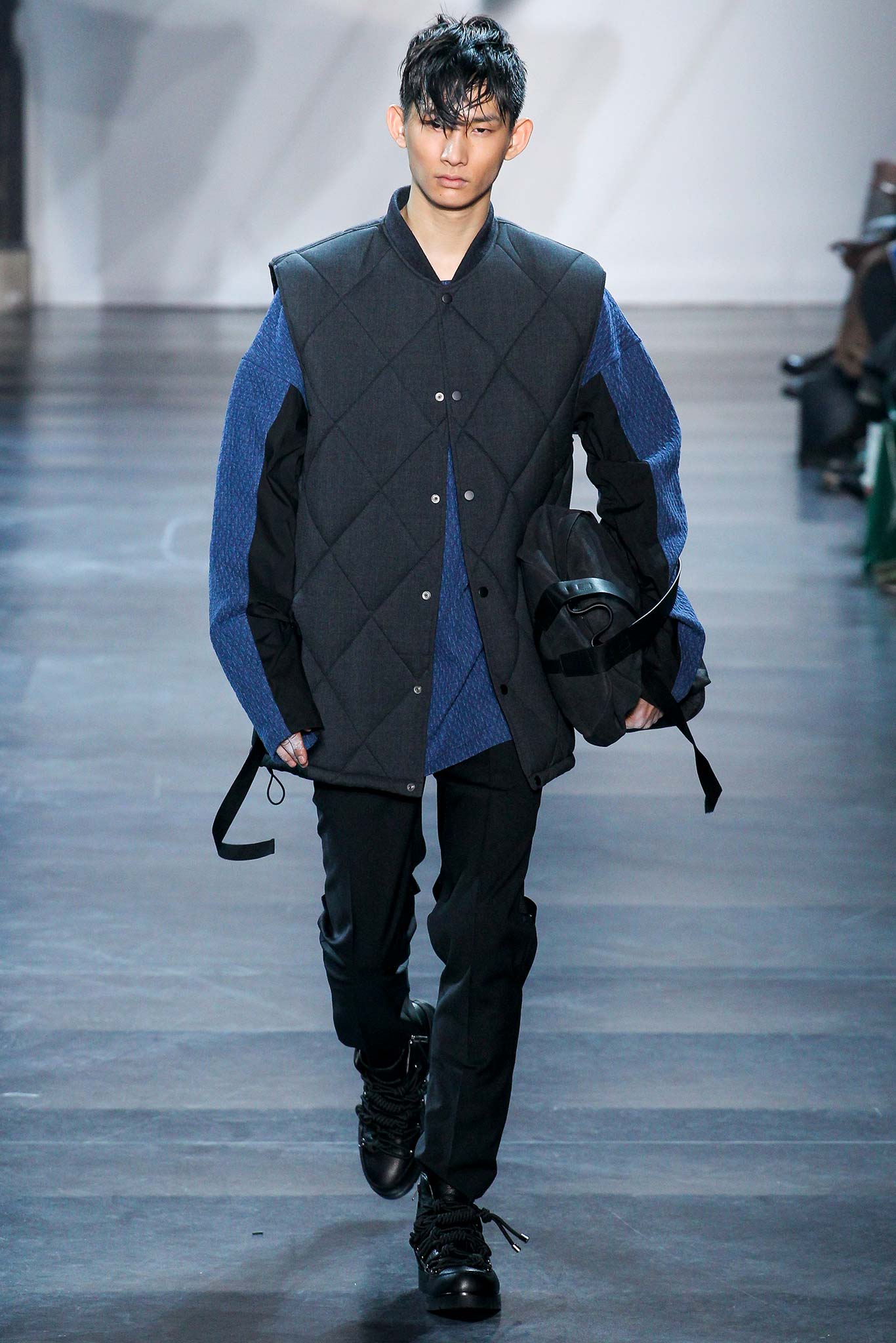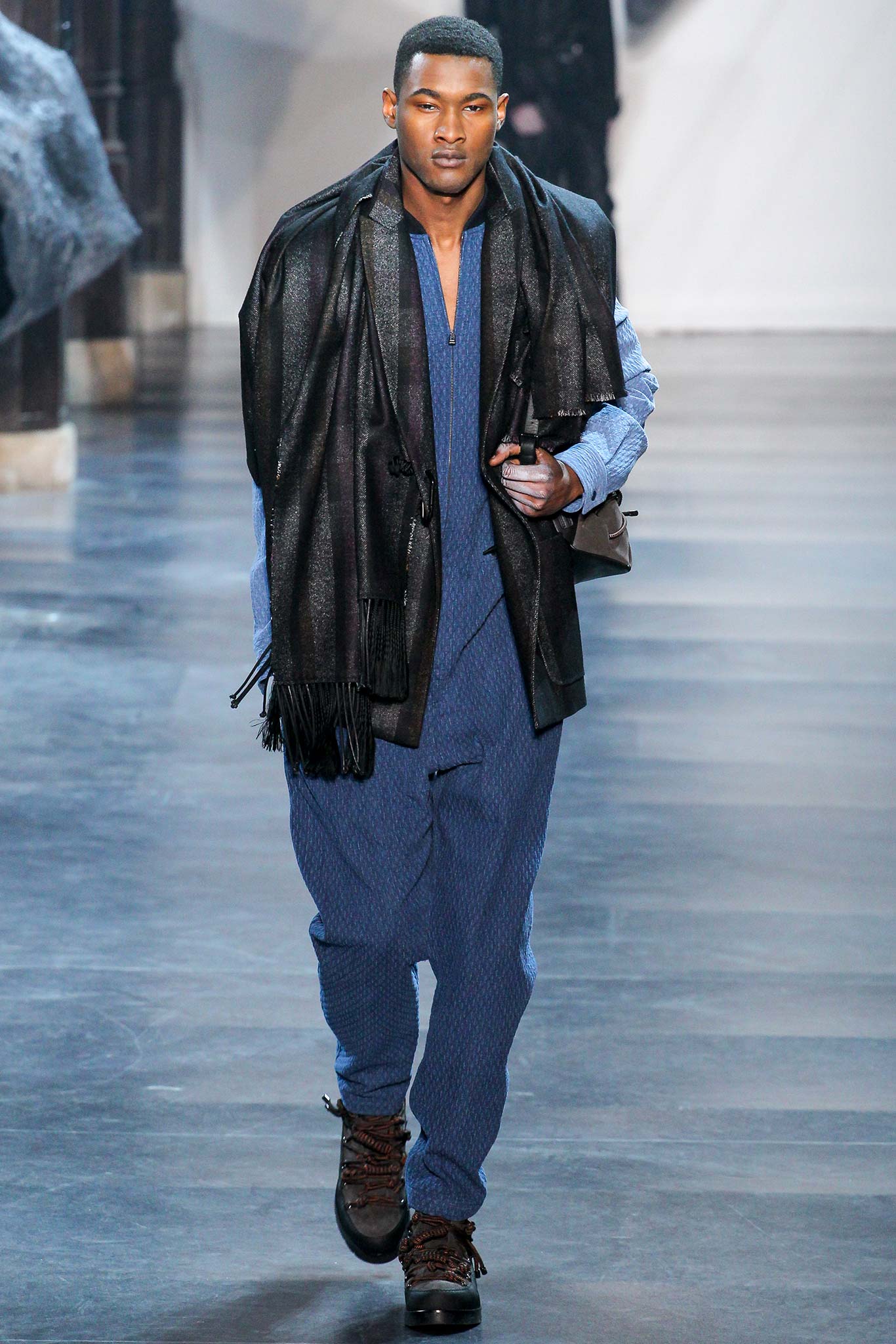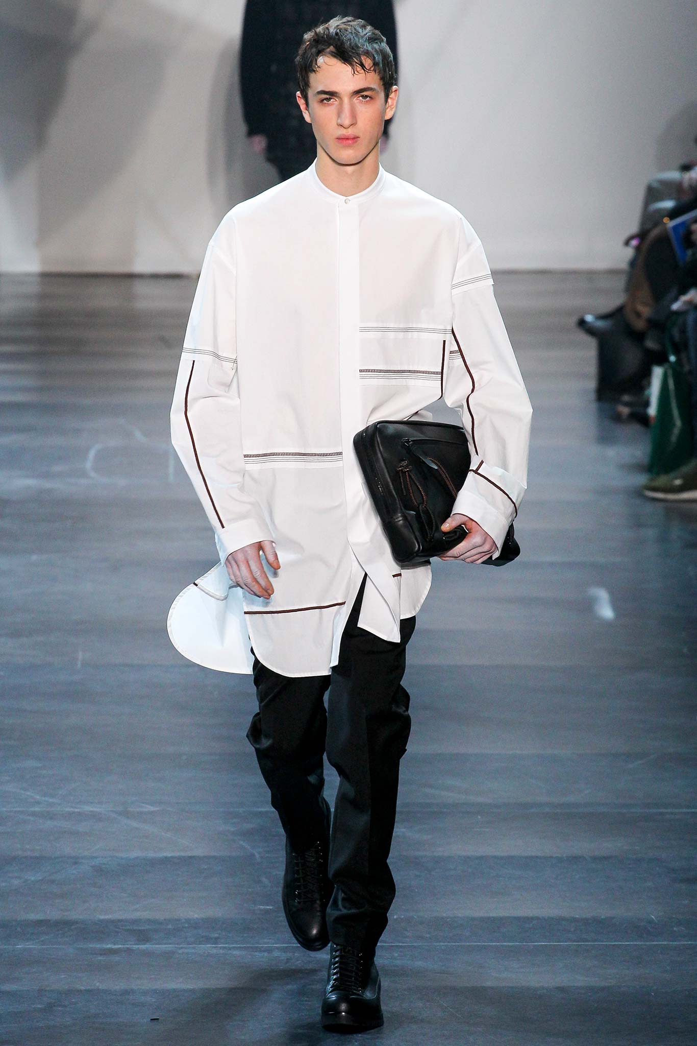 Rock-climbing as a metaphor for life, rather than a straight-up inspiration for a collection, the designer explained before his Paris show. Of course, it is about the state of mind, but this also provided him with a slew of decorative knots as a lifeline throughout the lineup (from belts to shoes, to backpacks and clutches, to knotted into a loose, giant-cell fishnet tee). “Is it safety or subversion?” he mused, pointing alternatively to a gorgeous khaki wool coat simply held shut by a length of rope and the aforementioned fishnet tunic. This theme also helped ground Lim, steering him away from the overbearing bulkiness that distracted in earlier collections. All this sportswear was well distilled into a collection that was as trim and polished as could be expected of any Lim offering. The best looks were no doubt the urbane variations that seemed the simplest, like a thin blouson in a woven knot motif. Likewise, coats and sharp parkas had unmediated appeal.