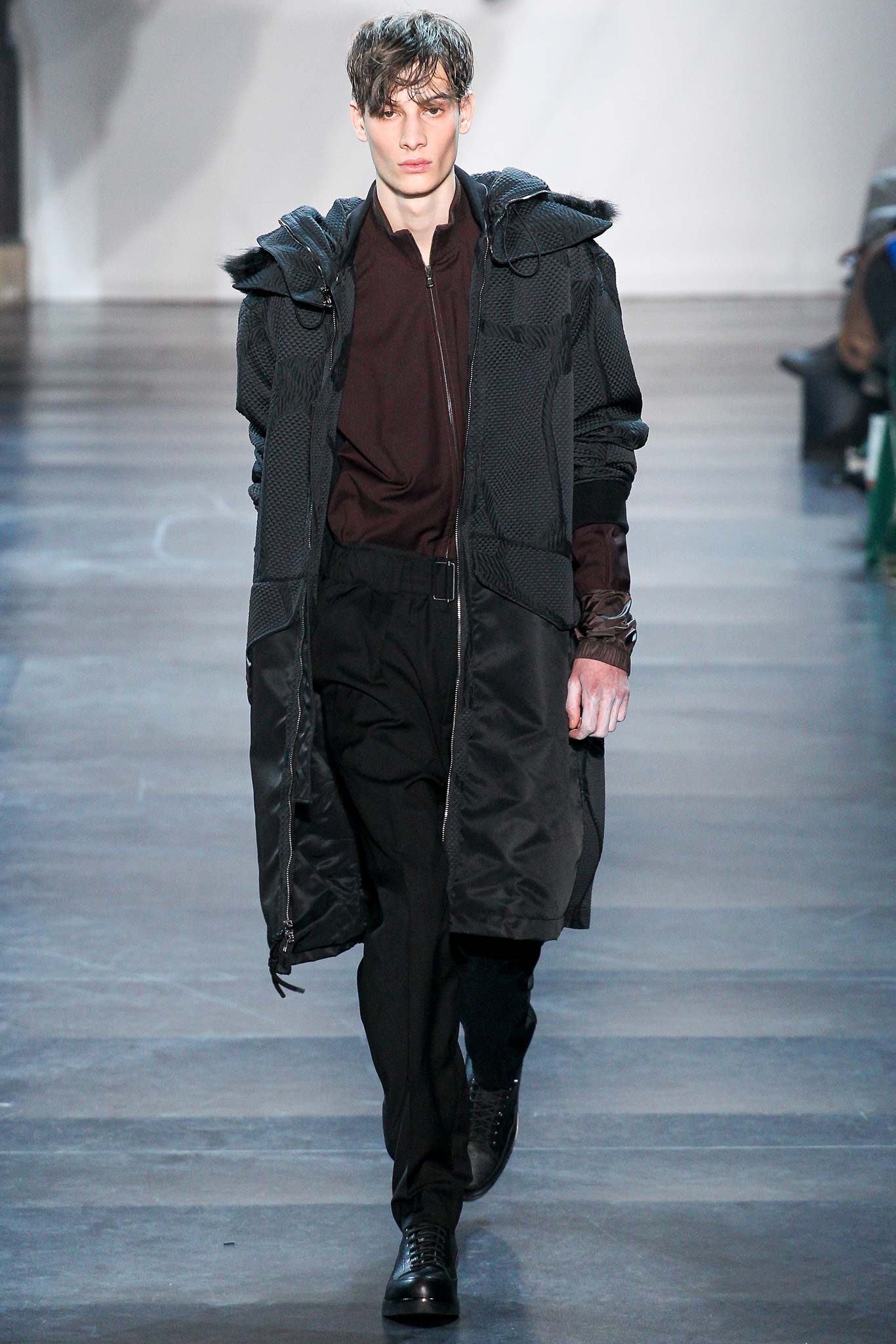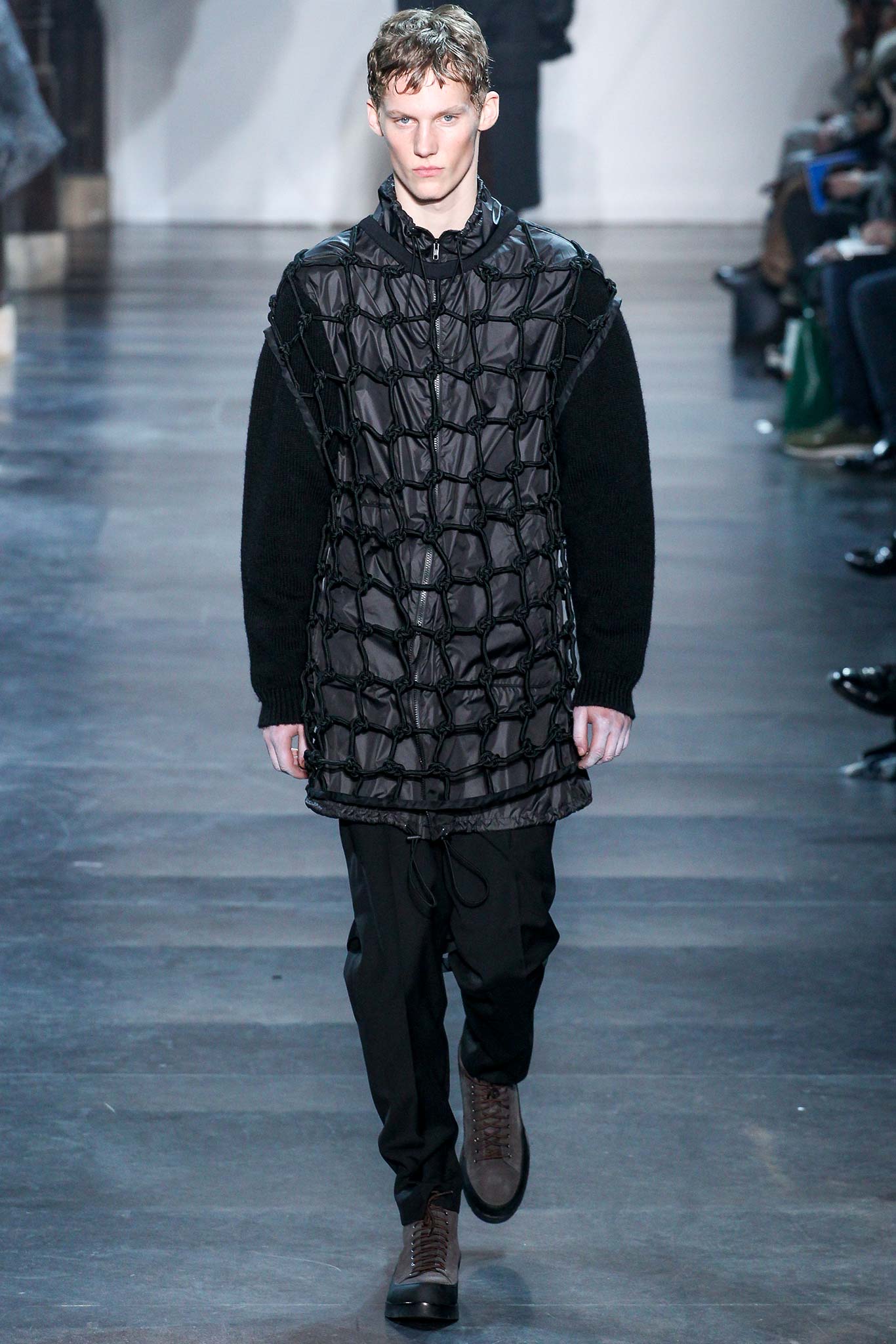 Rock-climbing as a metaphor for life, rather than a straight-up inspiration for a collection, the designer explained before his Paris show. Of course, it is about the state of mind, but this also provided him with a slew of decorative knots as a lifeline throughout the lineup (from belts to shoes, to backpacks and clutches, to knotted into a loose, giant-cell fishnet tee). “Is it safety or subversion?” he mused, pointing alternatively to a gorgeous khaki wool coat simply held shut by a length of rope and the aforementioned fishnet tunic. This theme also helped ground Lim, steering him away from the overbearing bulkiness that distracted in earlier collections. All this sportswear was well distilled into a collection that was as trim and polished as could be expected of any Lim offering. The best looks were no doubt the urbane variations that seemed the simplest, like a thin blouson in a woven knot motif. Likewise, coats and sharp parkas had unmediated appeal.