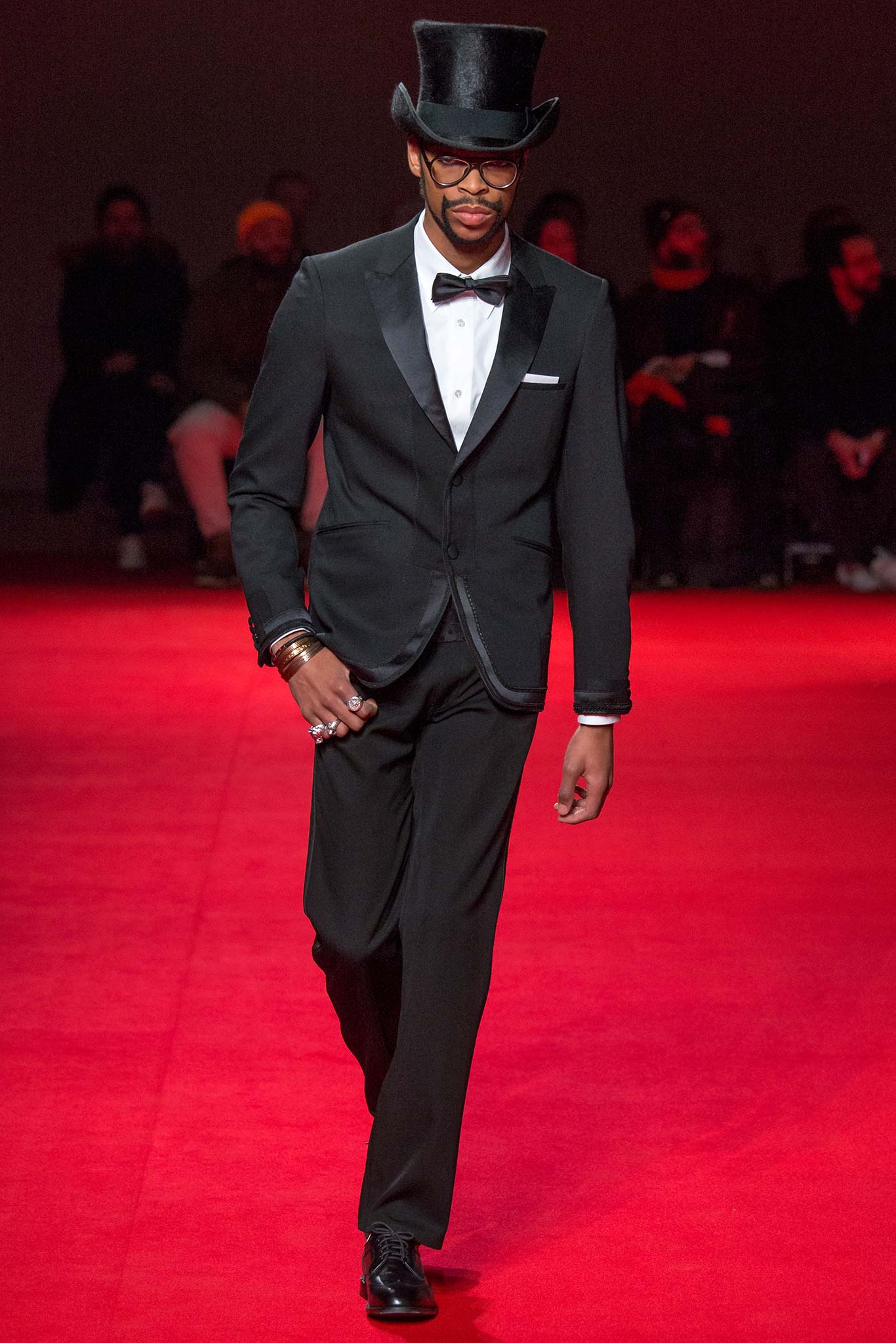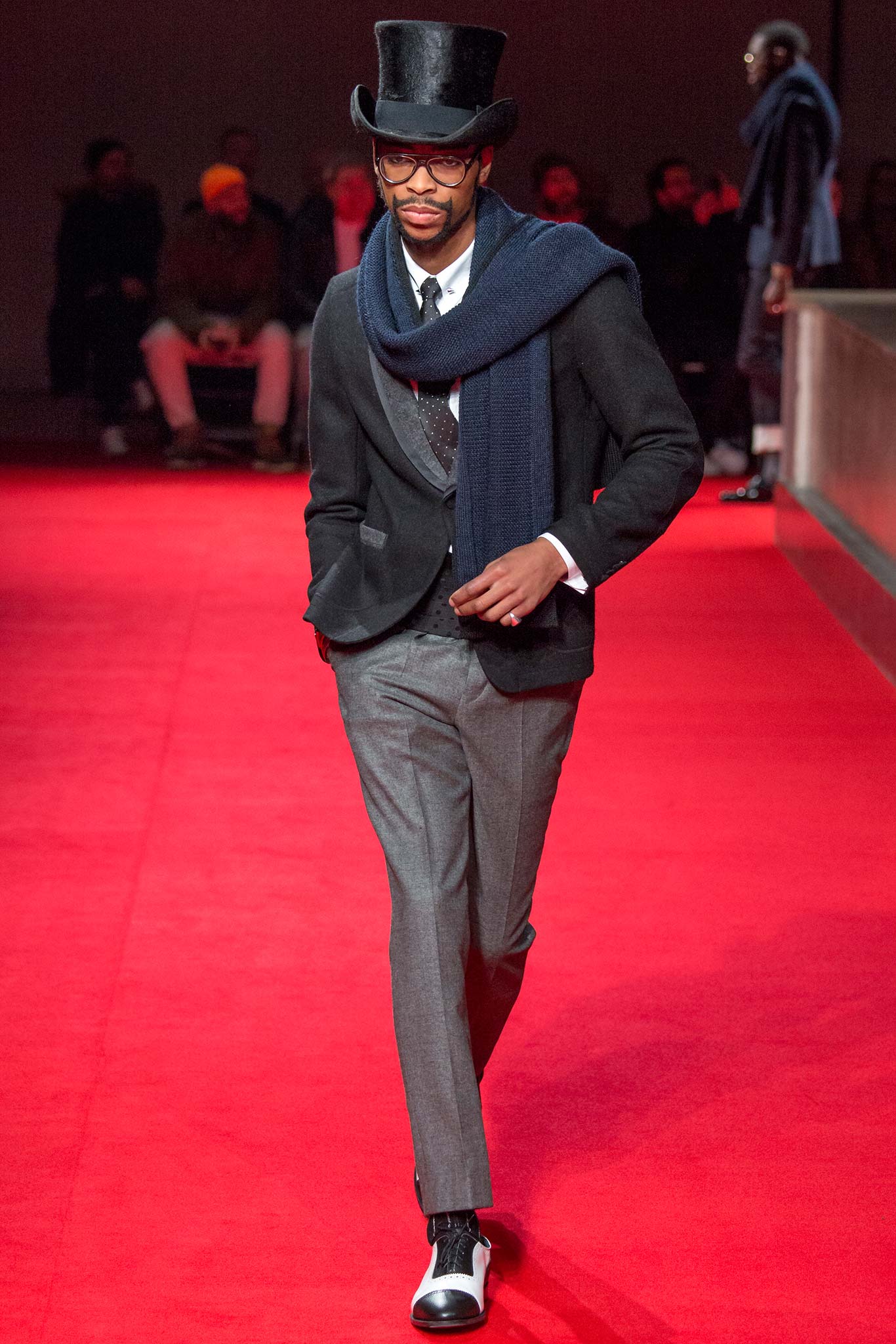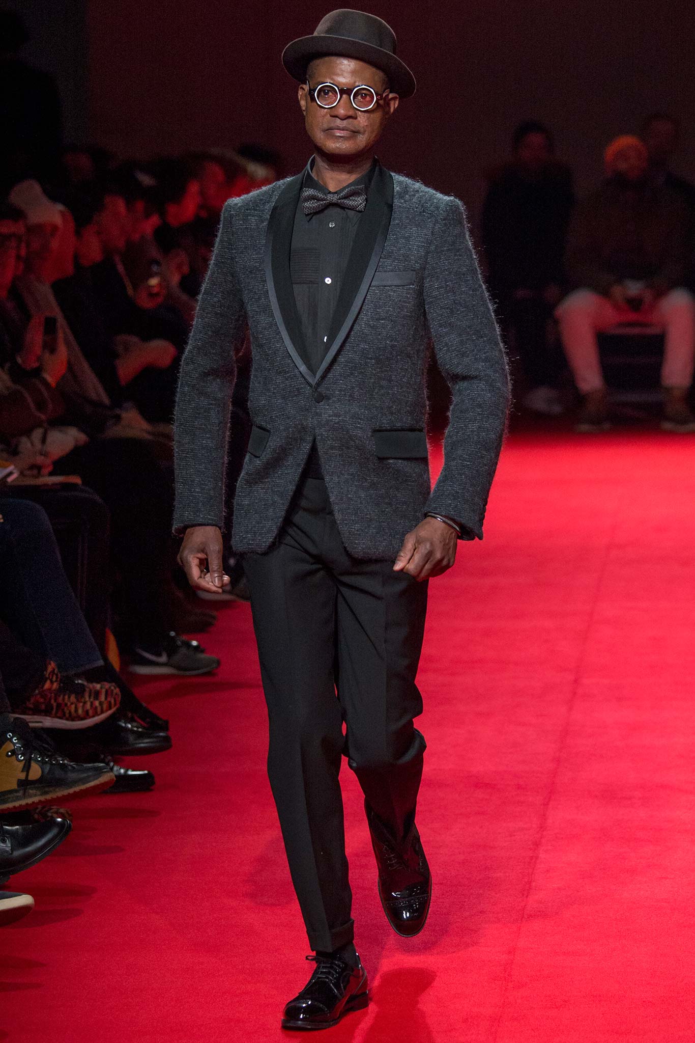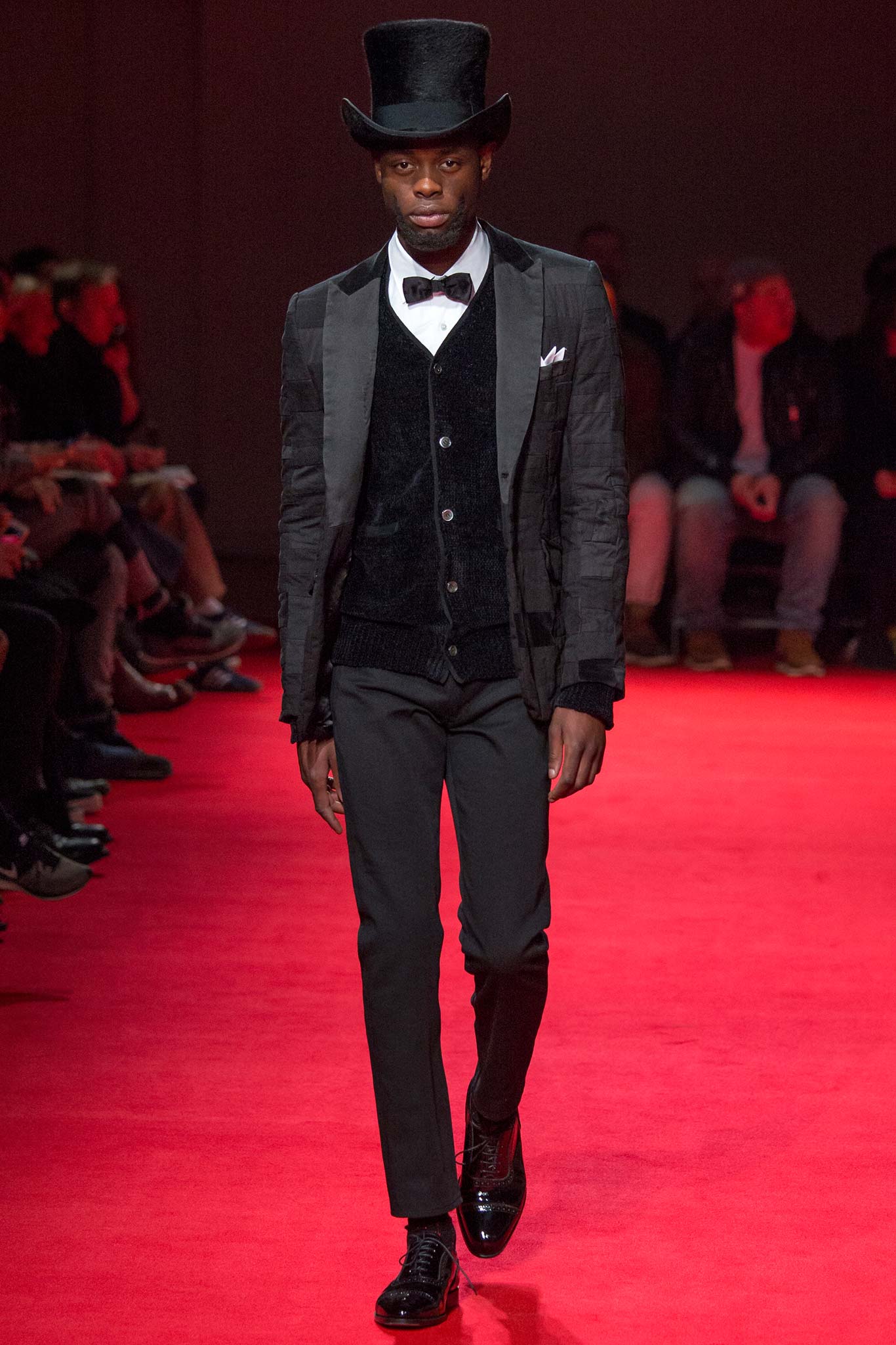 The music matched the mood, however. Dapper gentlemen ambled down the red carpeted runway, dressed to the nines. Dinner suits and cumberbund belts, jackets cut from thick marled knitwear but as pin-straight and impeccable as from woven cloth, puffer jacket with ribbed velvet collar, Watanabe clearly explored an orchestral version of the tuxedo. Jazzmen and Fresh Princes of music, they were the smooth underbelly of high society, sharply dressed yet characterful; a little scrappy too, as one dude stalked past with his knuckles wrapped in gauze. All sported some form of headgear, top hats or bowlers, perched jauntily atop their heads, and on their feet, super shined patent or bicolor full brogues.