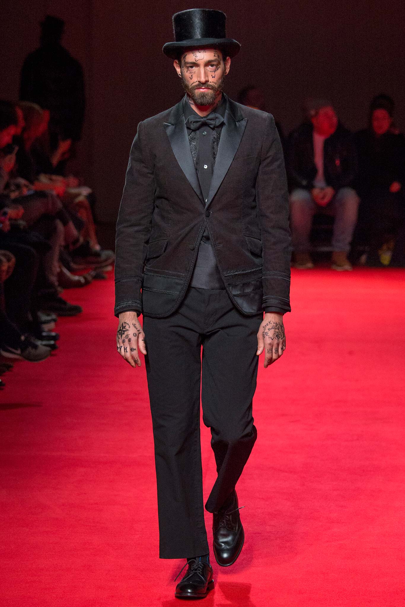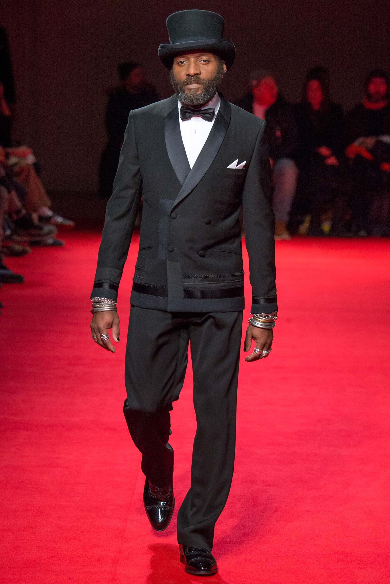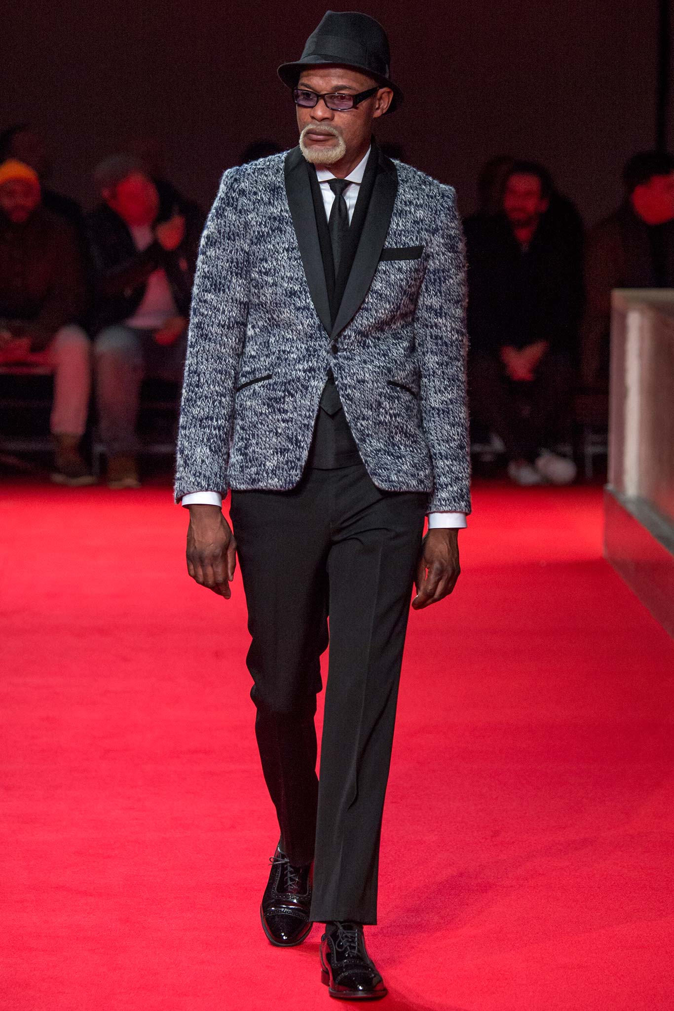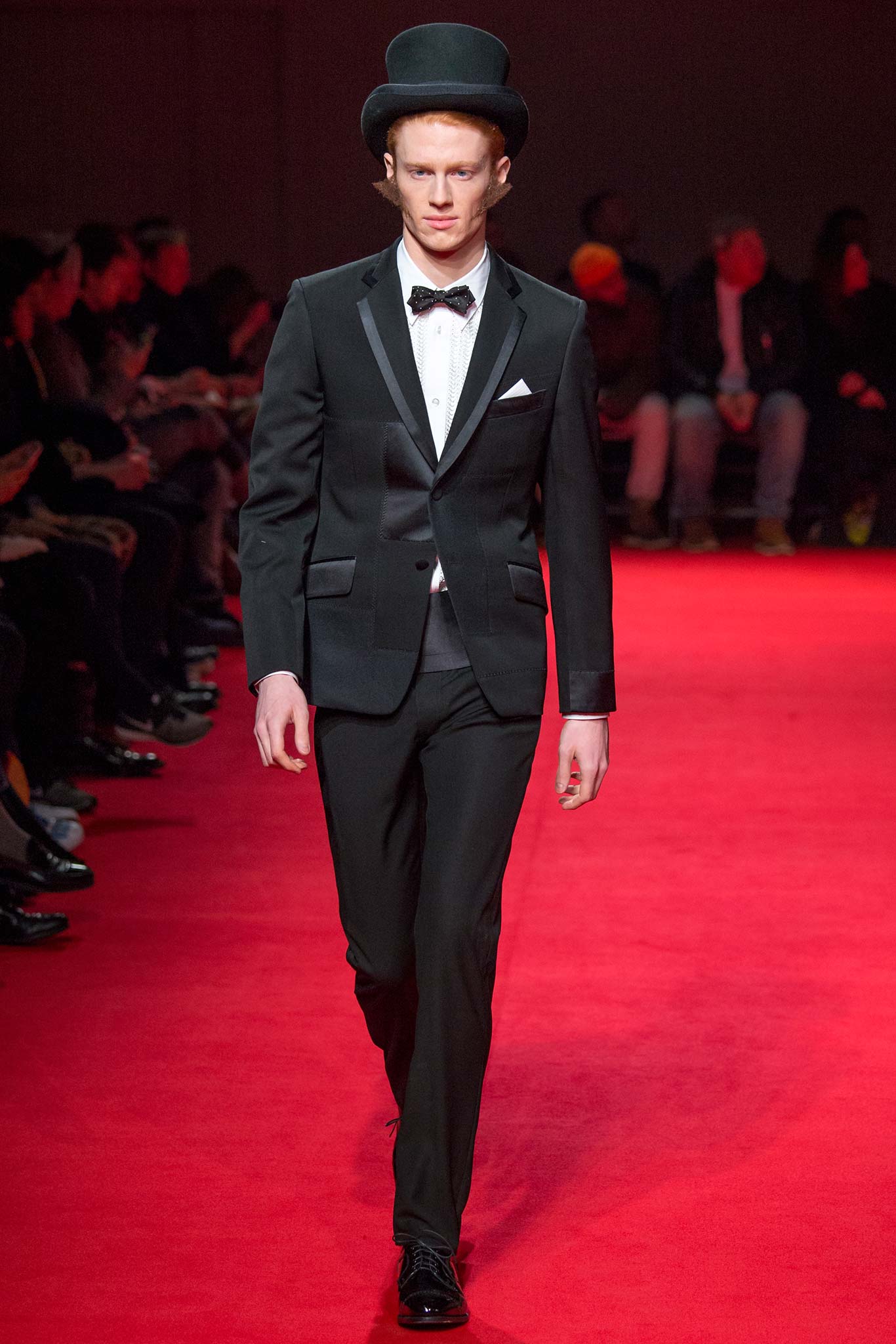 The music matched the mood, however. Dapper gentlemen ambled down the red carpeted runway, dressed to the nines. Dinner suits and cumberbund belts, jackets cut from thick marled knitwear but as pin-straight and impeccable as from woven cloth, puffer jacket with ribbed velvet collar, Watanabe clearly explored an orchestral version of the tuxedo. Jazzmen and Fresh Princes of music, they were the smooth underbelly of high society, sharply dressed yet characterful; a little scrappy too, as one dude stalked past with his knuckles wrapped in gauze. All sported some form of headgear, top hats or bowlers, perched jauntily atop their heads, and on their feet, super shined patent or bicolor full brogues.