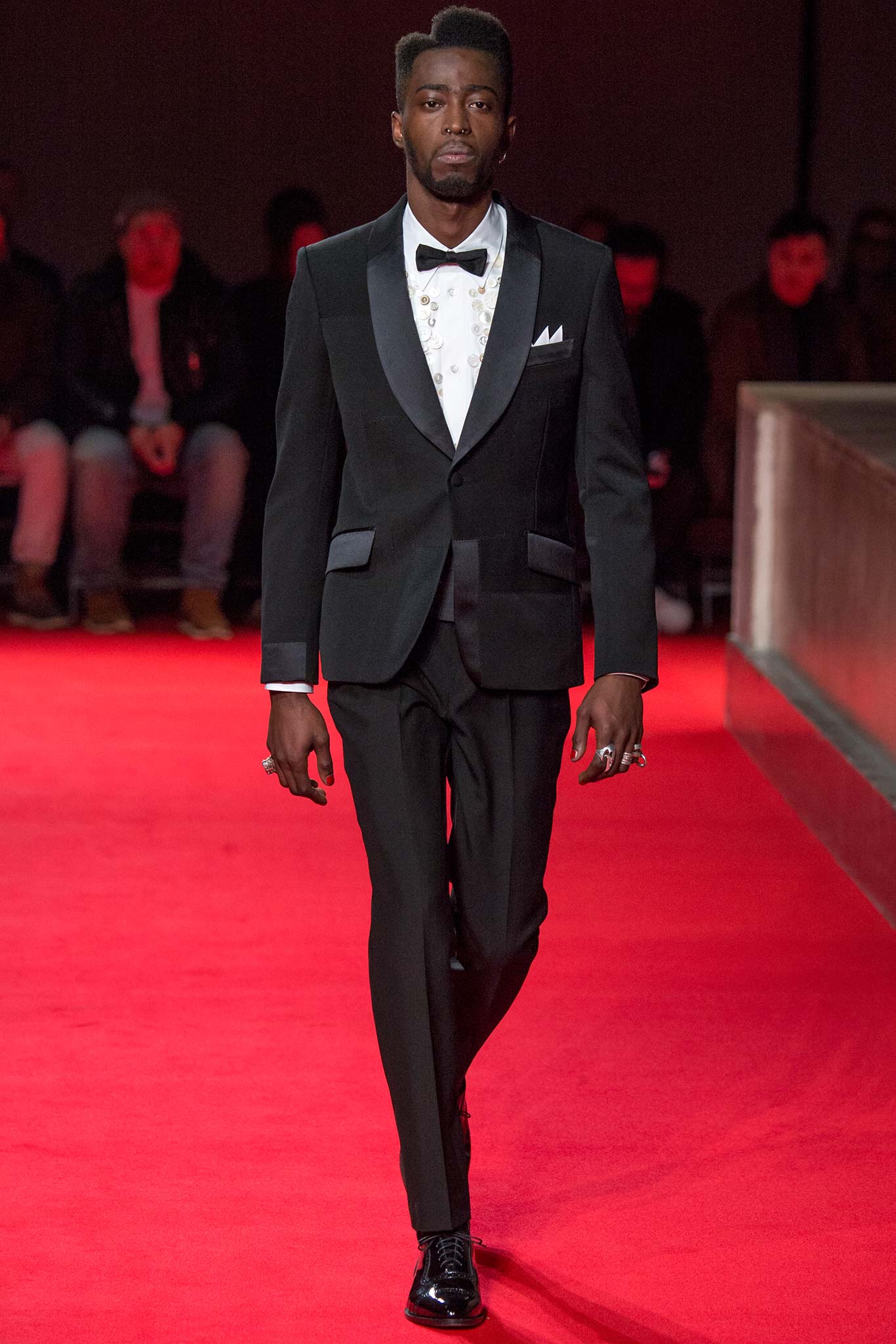 Long has the Japanese designer been working the sartorial into the rough, but here it felt like the reverse. The piecing that comes with the territory appeared, integrated into contrasting bias and along hemlines, then creeping up to cover the entire surface of tuxedo jackets. As a whole suit, the patchwork — in varying degrees of luster, black on black — was the perfect counterpoint to the tuxedo stripe running down the side of the leg. Of course, Watanabe’s surgical precision in assembly and tailoring is capital to the endeavor. As always, the result was fascinating to take in. “Can’t take my eyes off you,” as John Lloyd Young sang.