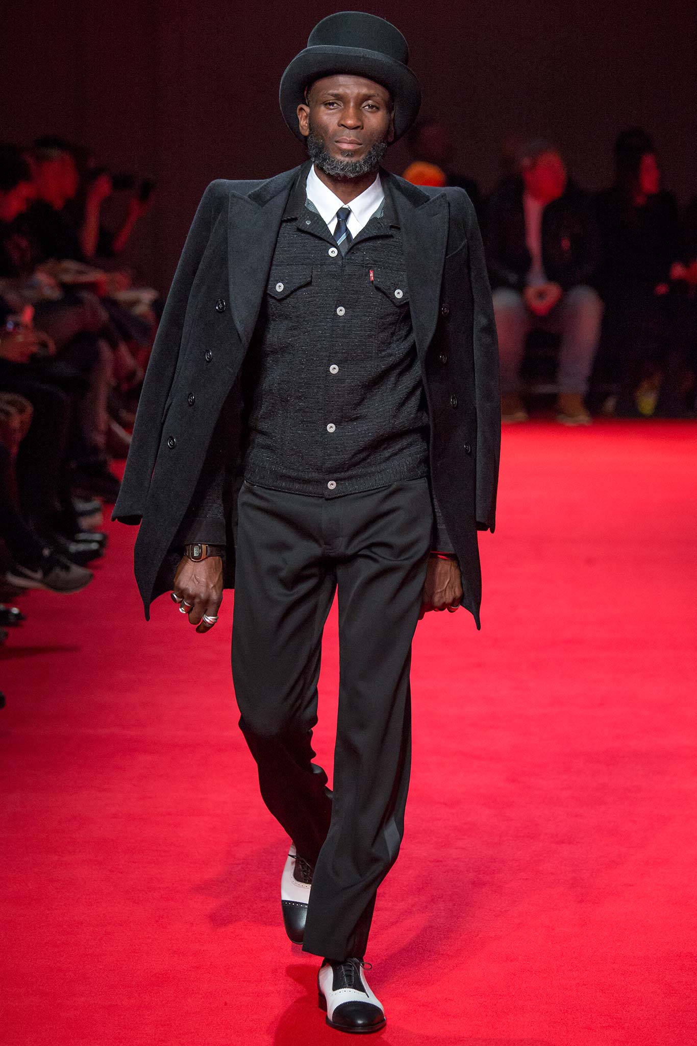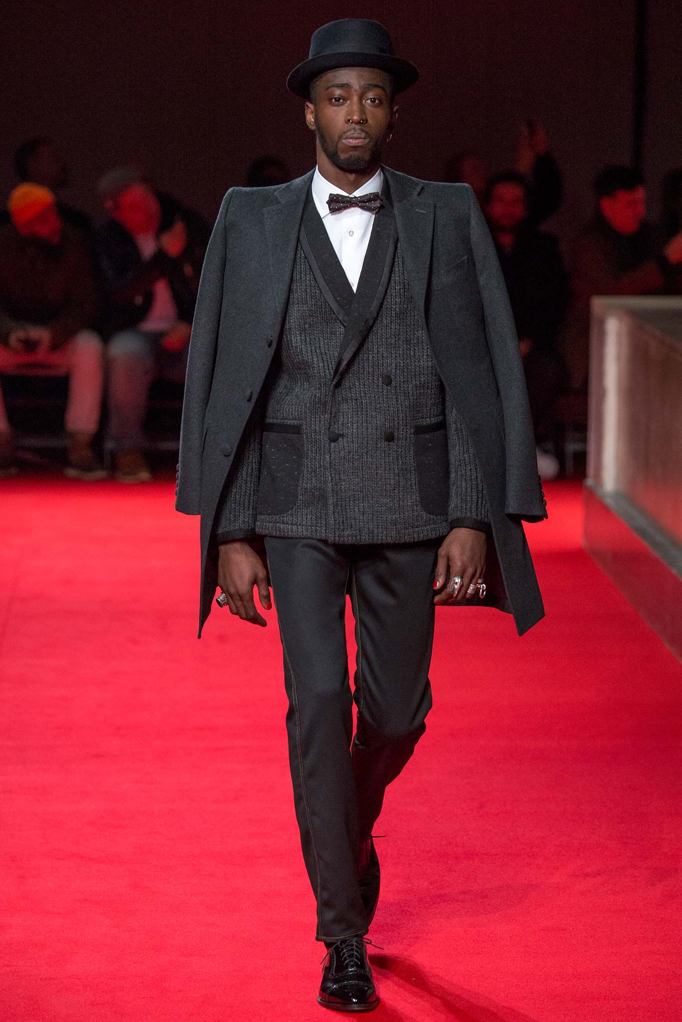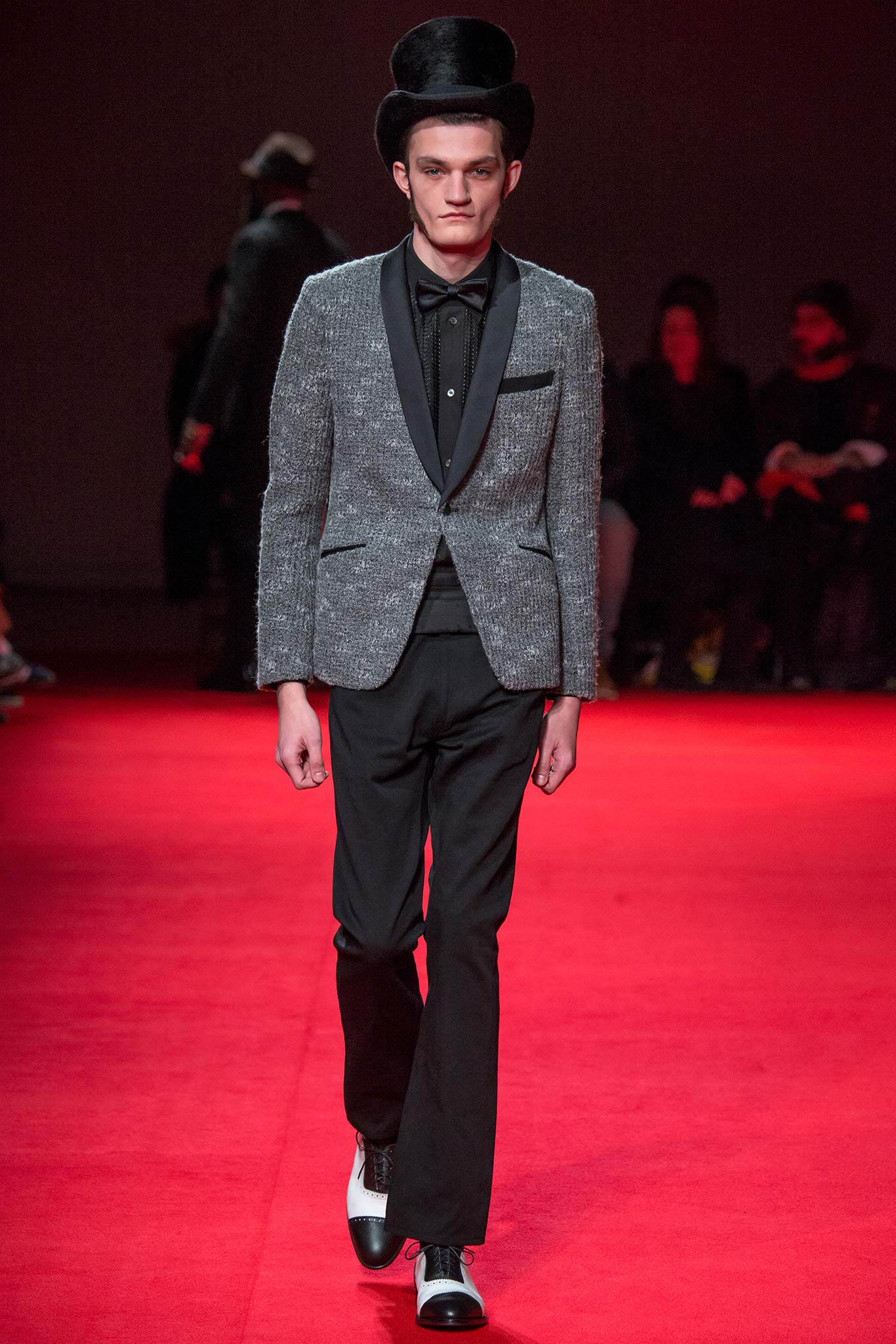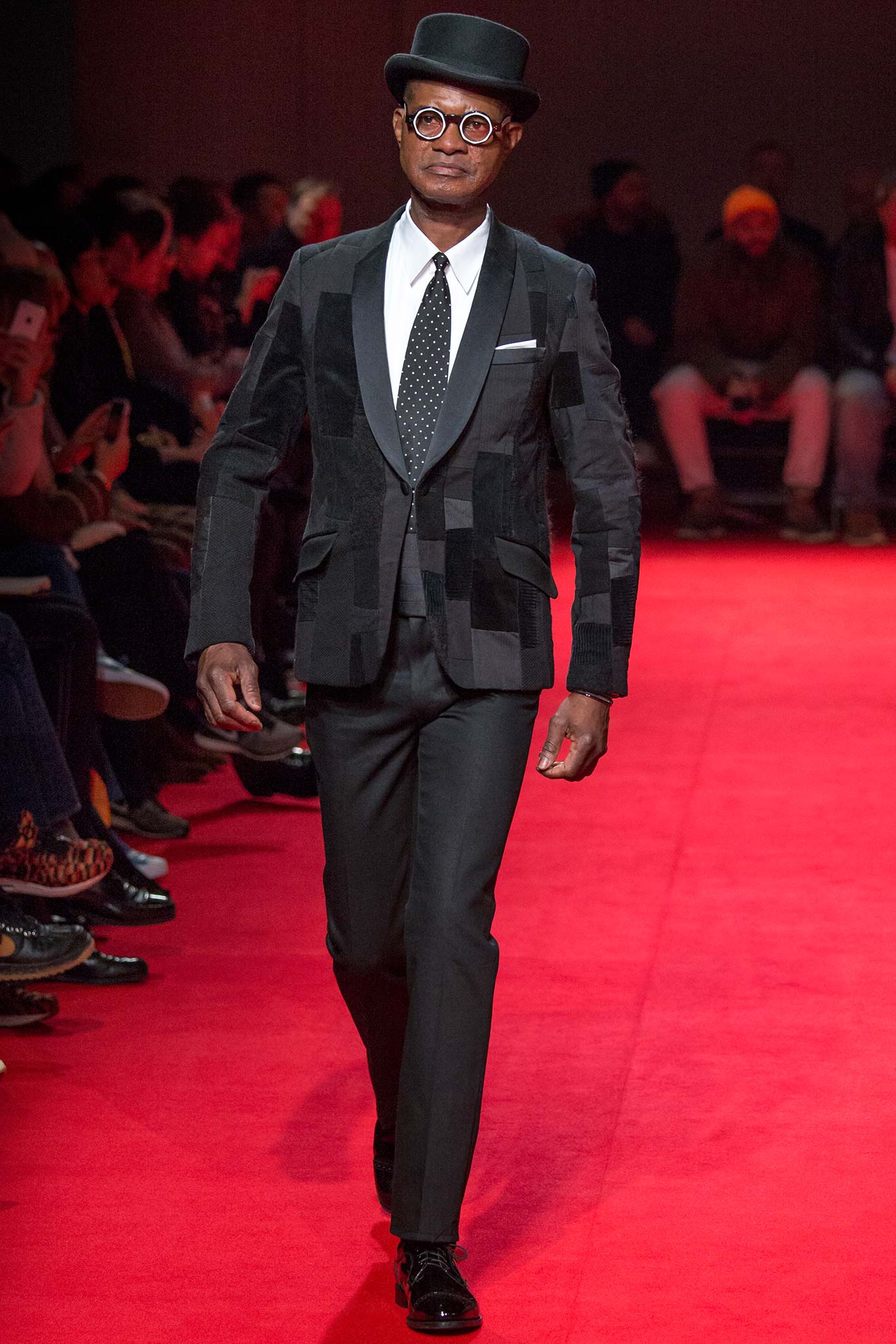 The music matched the mood, however. Dapper gentlemen ambled down the red carpeted runway, dressed to the nines. Dinner suits and cumberbund belts, jackets cut from thick marled knitwear but as pin-straight and impeccable as from woven cloth, puffer jacket with ribbed velvet collar, Watanabe clearly explored an orchestral version of the tuxedo. Jazzmen and Fresh Princes of music, they were the smooth underbelly of high society, sharply dressed yet characterful; a little scrappy too, as one dude stalked past with his knuckles wrapped in gauze. All sported some form of headgear, top hats or bowlers, perched jauntily atop their heads, and on their feet, super shined patent or bicolor full brogues.