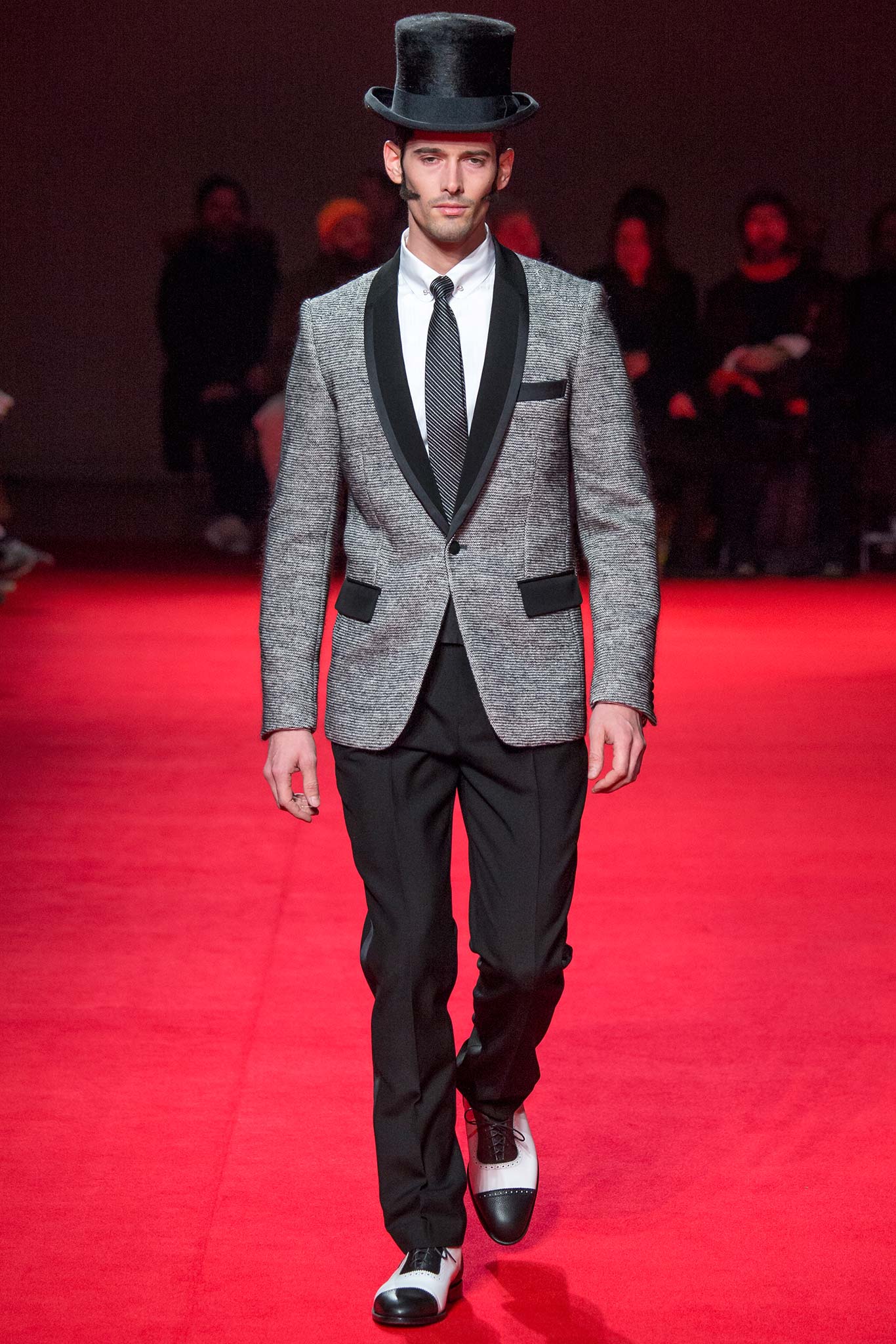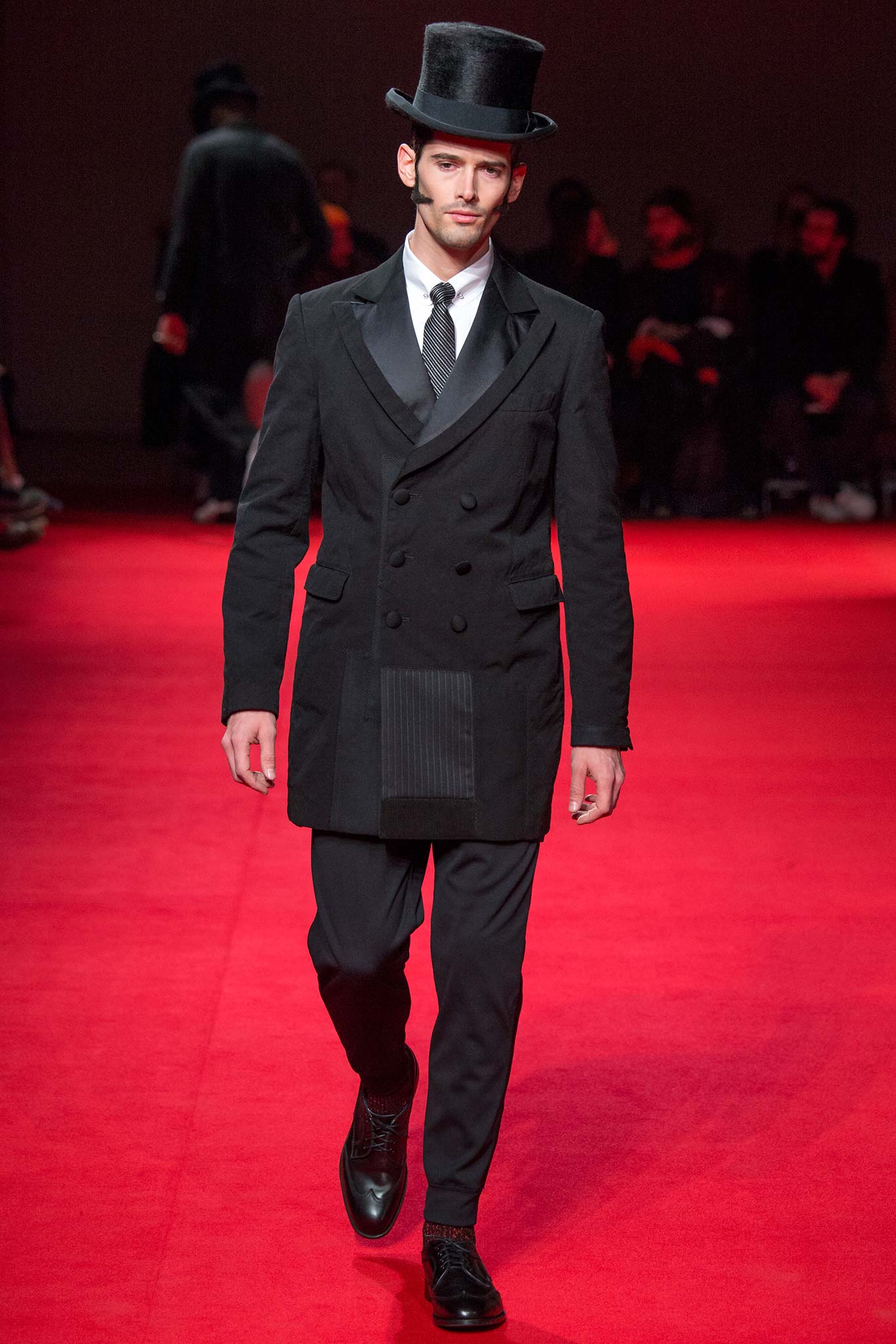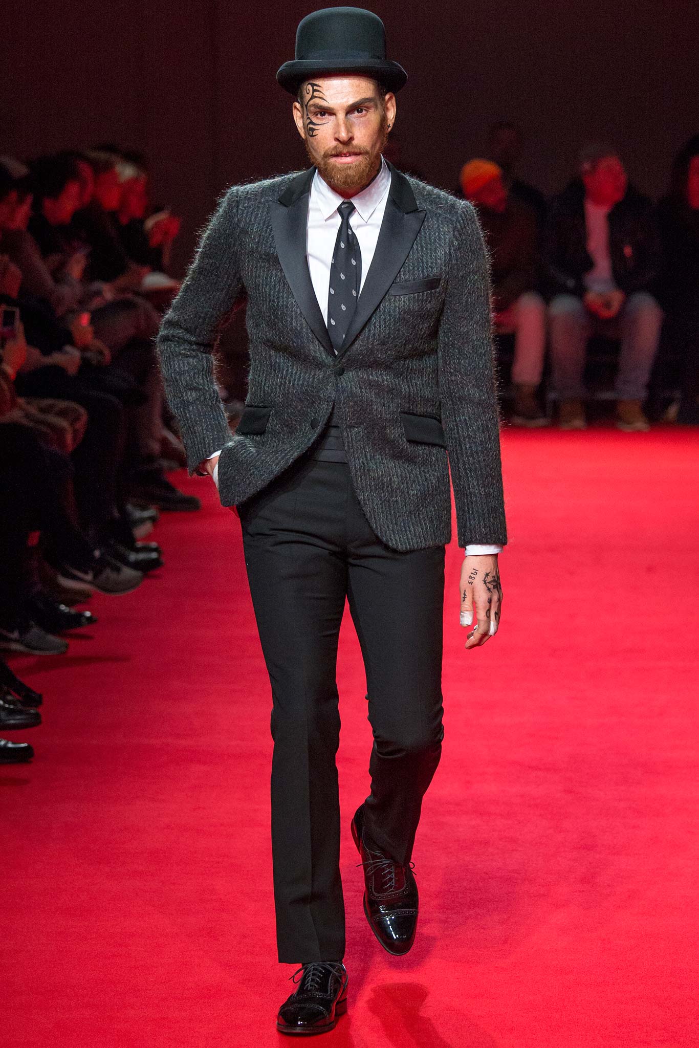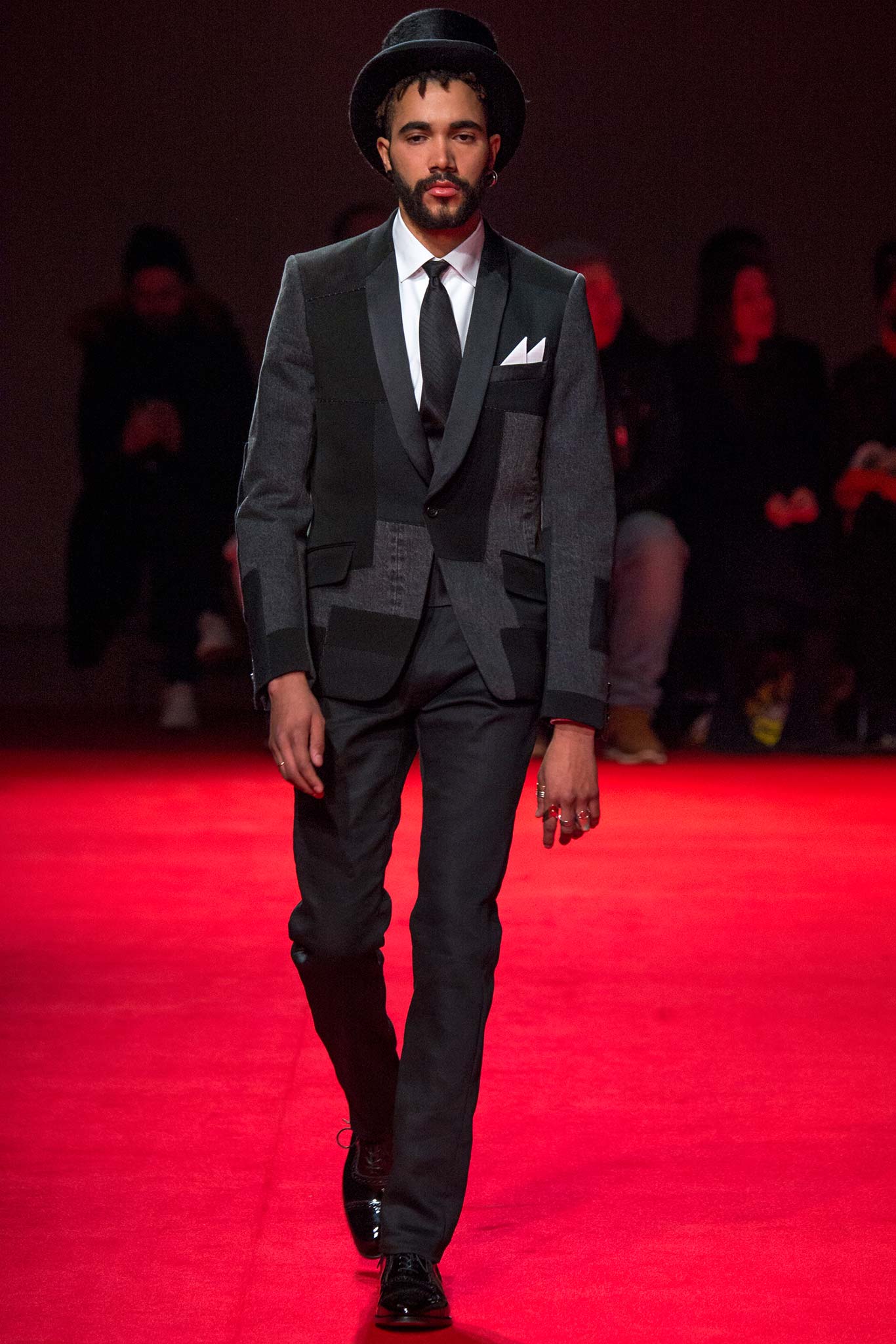The music matched the mood, however. Dapper gentlemen ambled down the red carpeted runway, dressed to the nines. Dinner suits and cumberbund belts, jackets cut from thick marled knitwear but as pin-straight and impeccable as from woven cloth, puffer jacket with ribbed velvet collar, Watanabe clearly explored an orchestral version of the tuxedo. Jazzmen and Fresh Princes of music, they were the smooth underbelly of high society, sharply dressed yet characterful; a little scrappy too, as one dude stalked past with his knuckles wrapped in gauze. All sported some form of headgear, top hats or bowlers, perched jauntily atop their heads, and on their feet, super shined patent or bicolor full brogues.