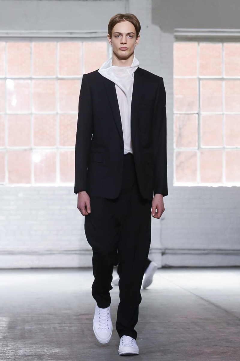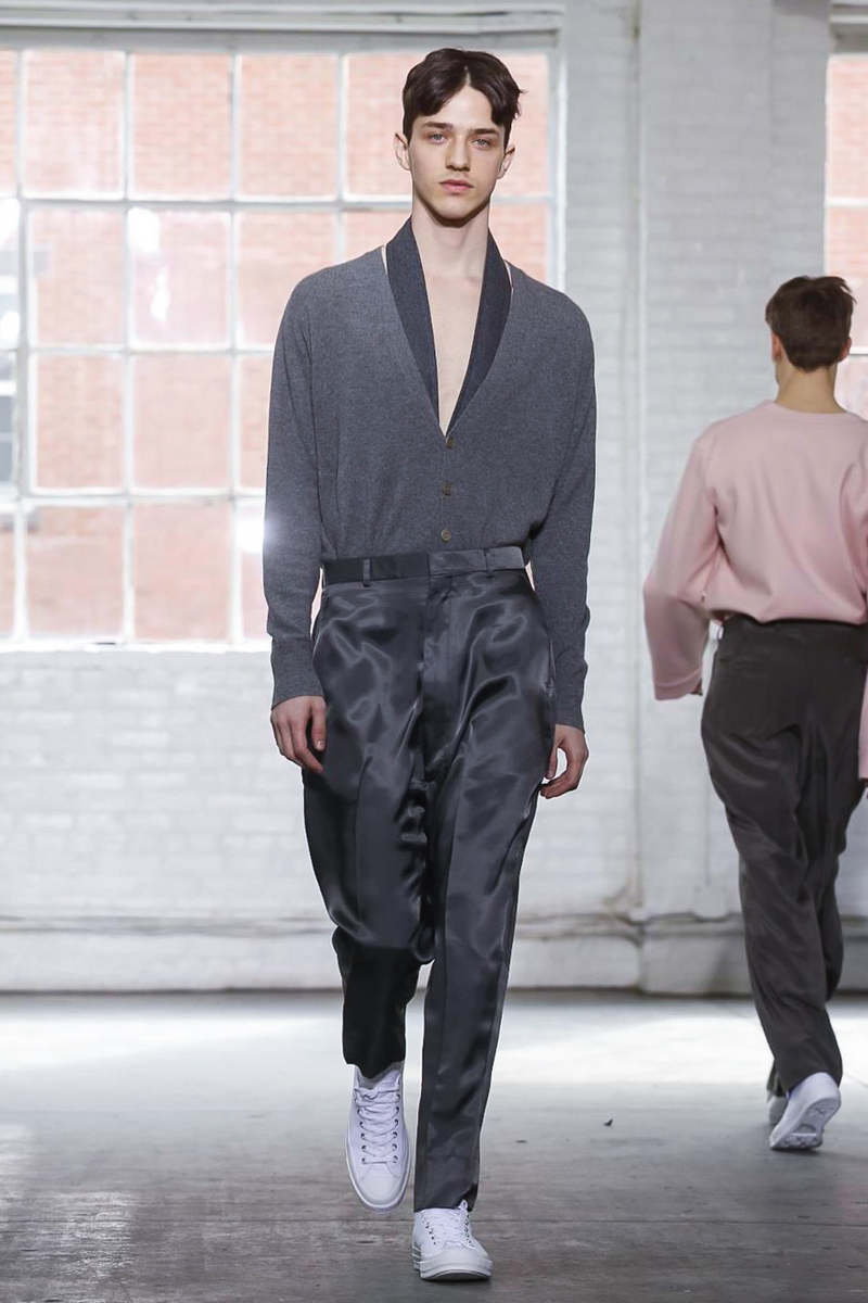 Remastering the effortless silhouette in her winter collection, Duckie Brown joins the tide monochromatic black and white to create ready to wear and comfortable looks through his baggy cuts operated by burgundy satin shades and textures.
