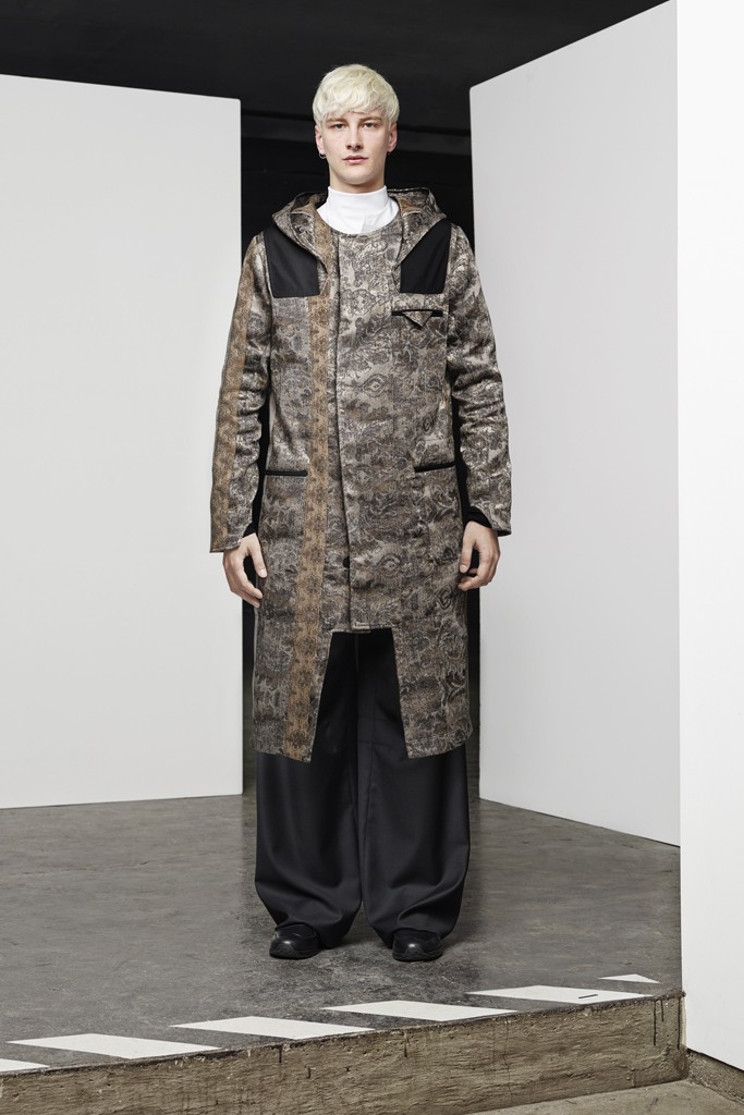 The collection featured all-natural fibers — wool, silk and cashmere from Japan and Italy. Highlights included a cashmere topcoat over a tunic and button-down paired with leather pants, and a tapestry printed parka