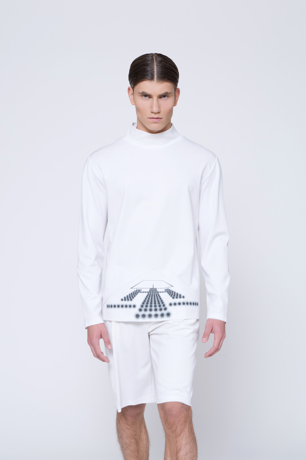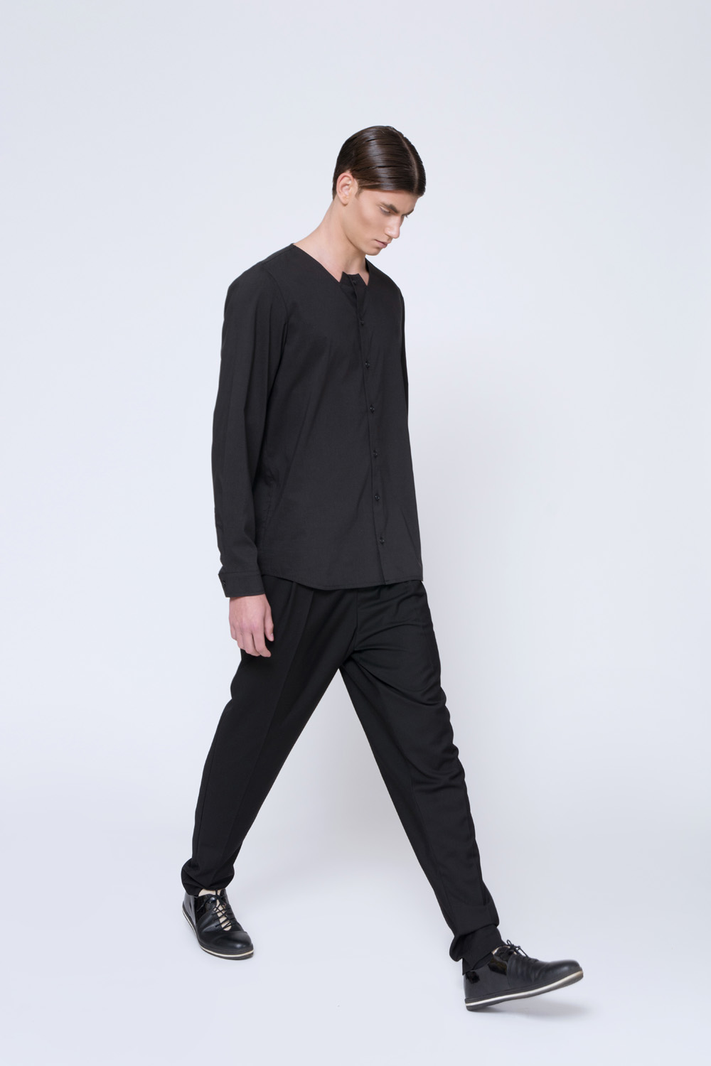 The collection consists 20 pieces in a color palette of white, black, grey and navy blue; Includes button down shirts in a classic fit, semi-tailored long sleeved tops, harem and skinny pants in a sporty silhouette yet with a tailored appearance, Bermuda shorts and tailored wool jackets. The collection was made in a variety of fabrics such as cotton, cotton jersey, wool and thin scuba. In addition several pieces were printed with engineered digital graphics.